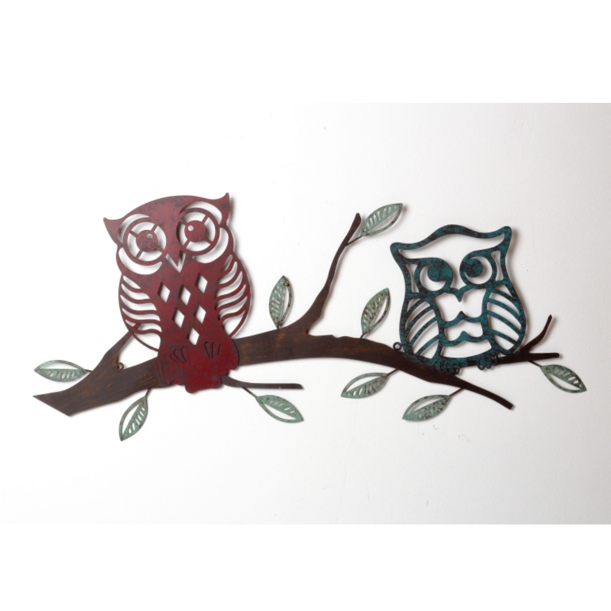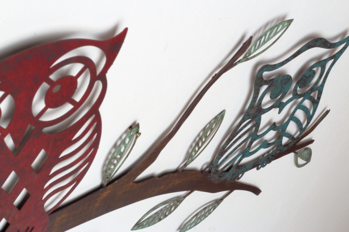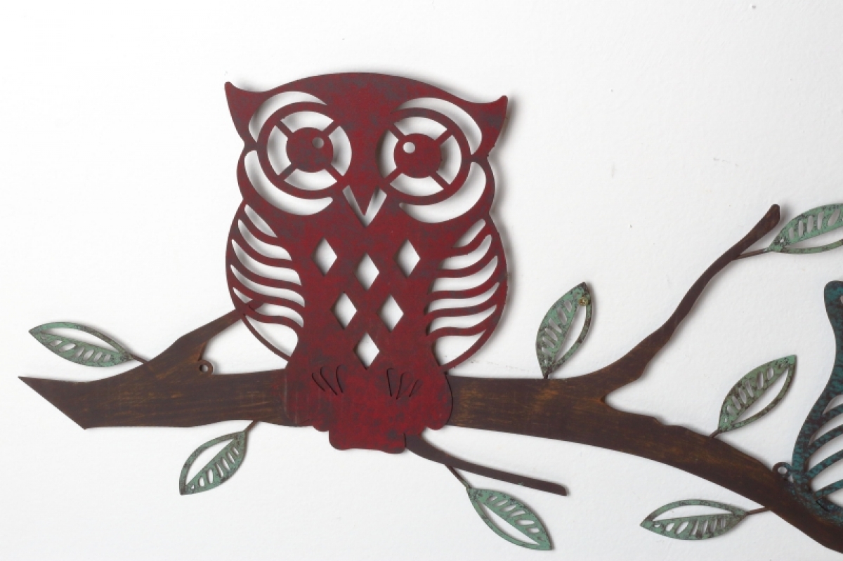 Dekorace na zeď sovy 74x35cm oživí každou stěnu. Kovové sovy sedí na větvi stromu, jsou symbolem moudrosti a rozvahy. Větev navíc zdobí drobné lístky.