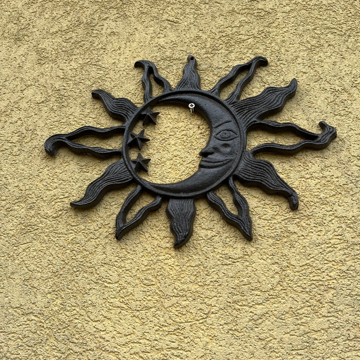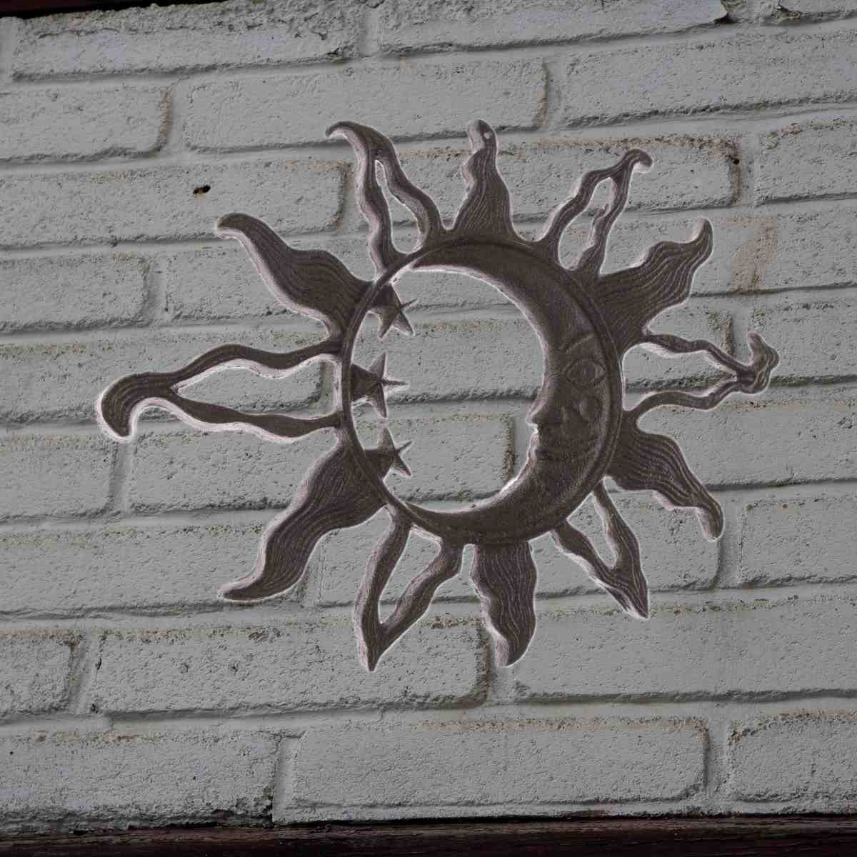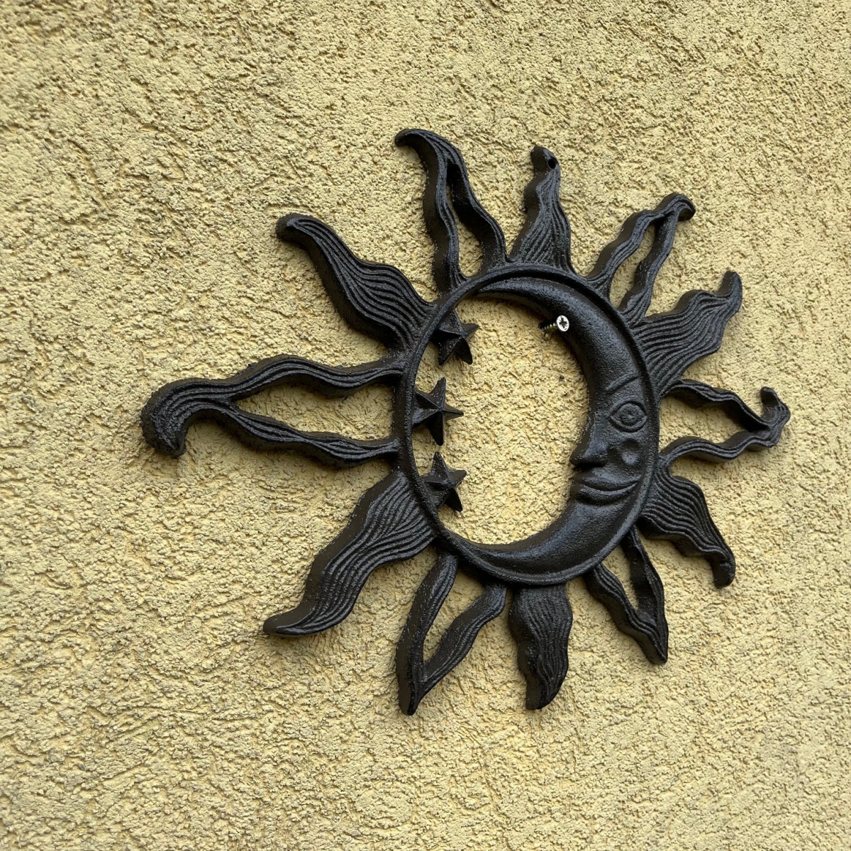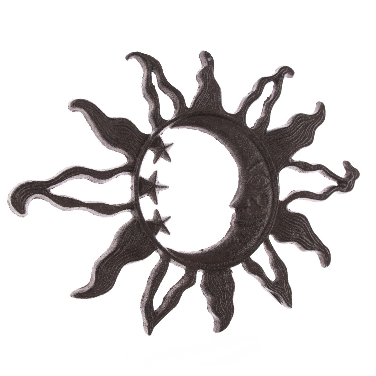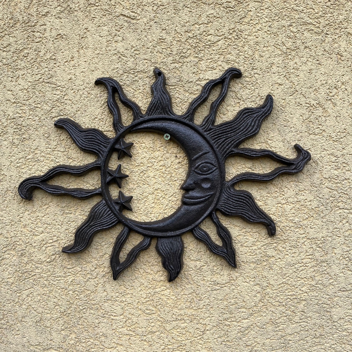 Dekorace slunce na zeď je litinová dekorace, která díky svému rustikálnímu provedení nejlépe vynikne zavěšená na kamenné zídce, starých dřevěných vratech nebo u venkovního posezení. Můžete ji také začlenit do aranžmá ke vchodovým dveřím nebo na terasu.