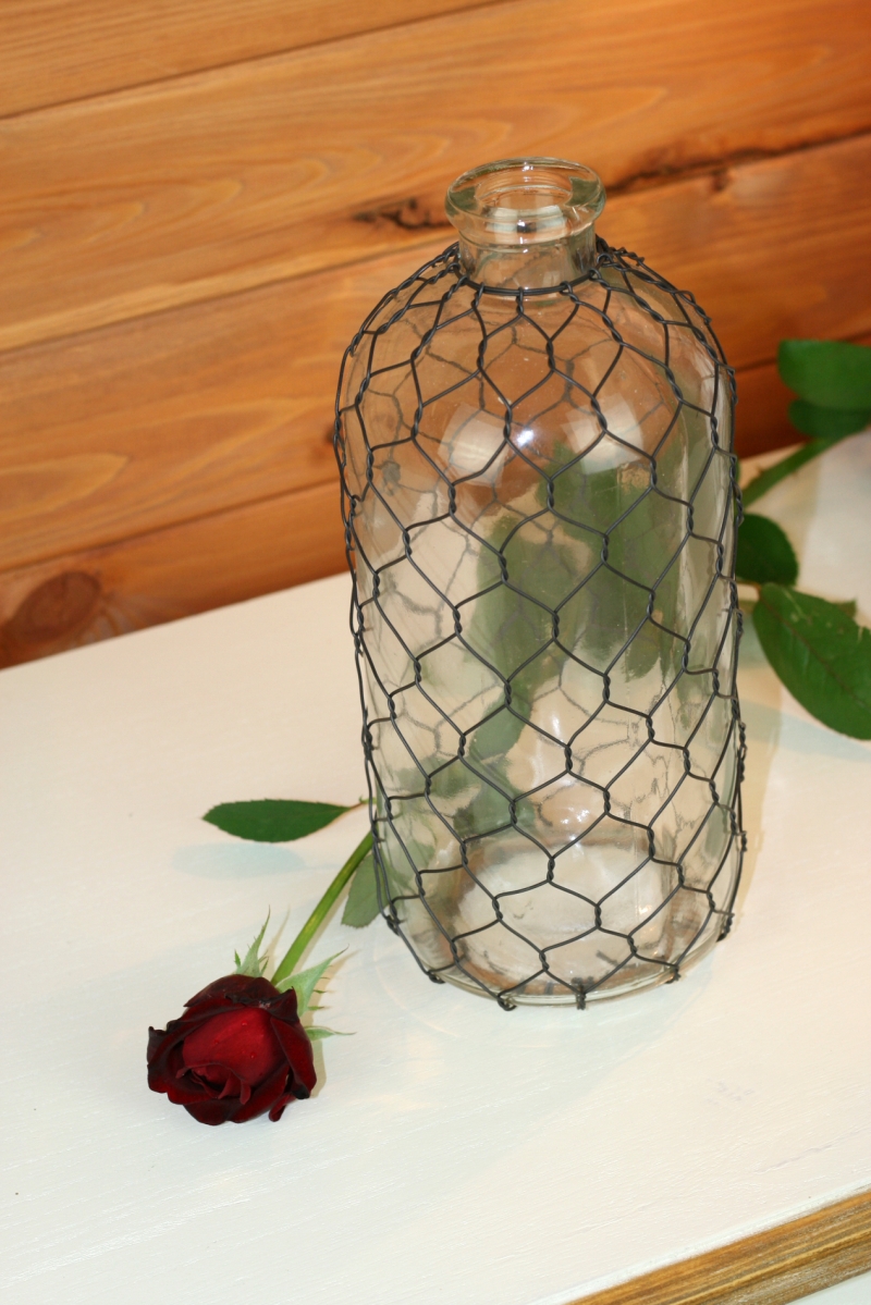 Dekorační váza sklenice s pletivem 34cm nás zaujala na první pohled. Jednoduchá skleněná nádoba se proměnila pod pavučinou drátků v krásno originální dekoraci.