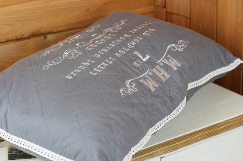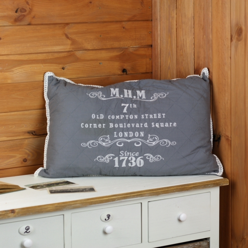 Textilní doplňky snadno a rychle promění vzhled interiéru. Tento šedý prošívaný polštář s krajkou a nápisy, které Vás zanesou do staré Anglie.