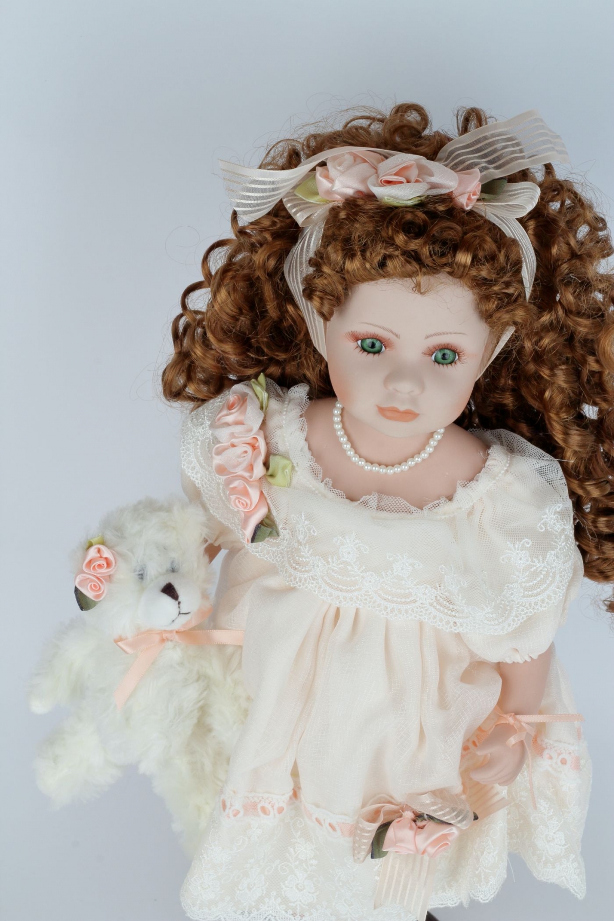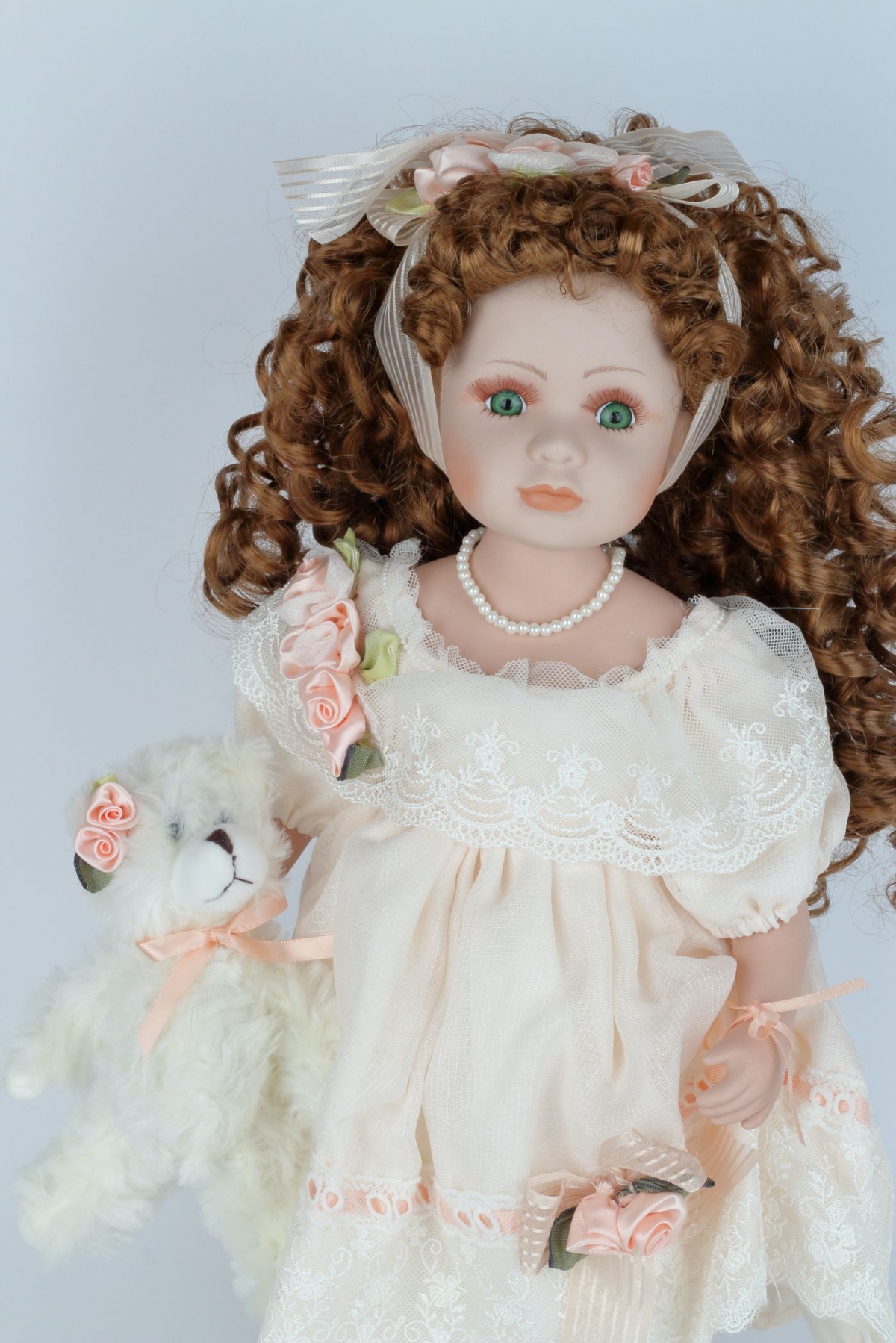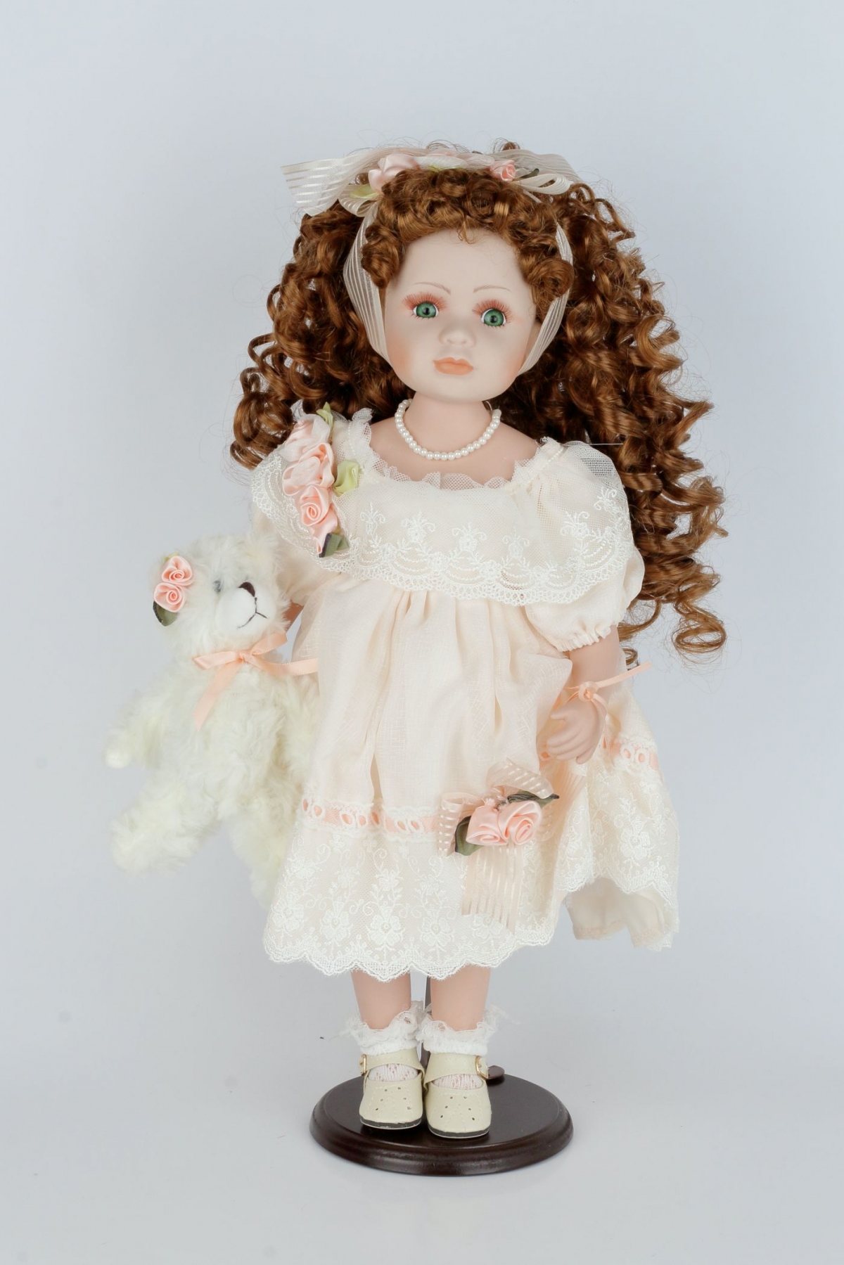 Dekorativní porcelánová panenka Matylda má krásné bílé šaty sladěné s botami a plyšákem. Je umístěná na podstavci, takže na svém čestném místě na poličce nebo ve vitríně bude pyšně stát.