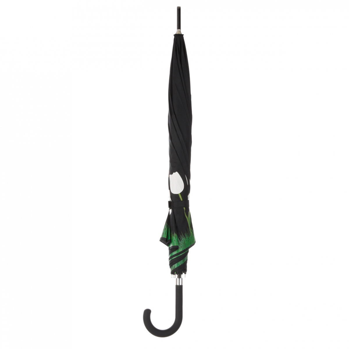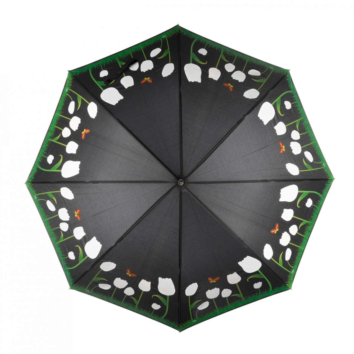 Na černé látce, je při okraji deštníku, natištěna zelená tráva s řadou bílých tulipánů a několika motýlky. Poté, co v dešti navlhne, bílé tulipány se změní na červené! Na květy je totiž použit speciální potisk, reagující na vodu změnou barvy.