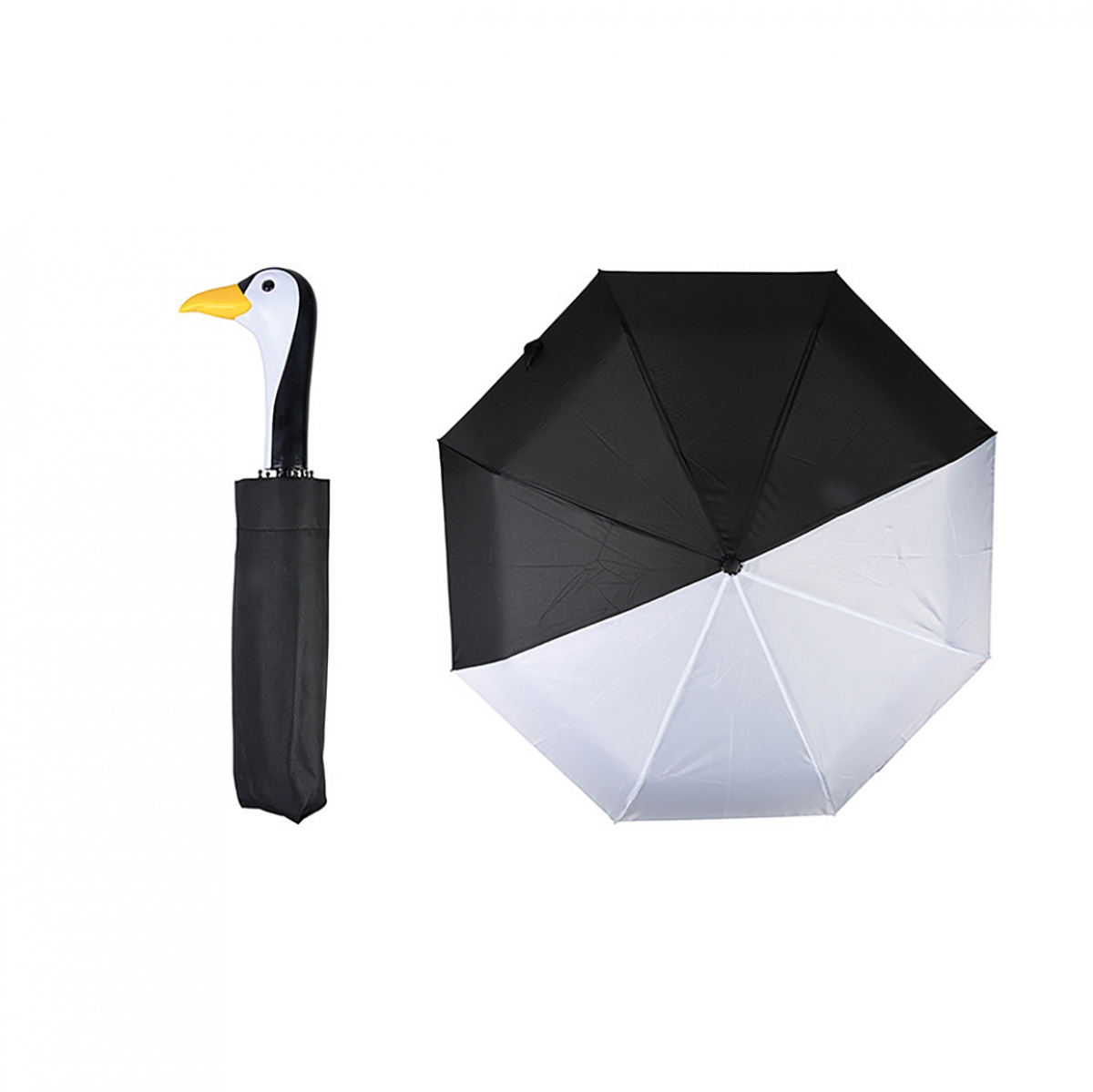 Skládací deštník, v originálním pojetí, zaujme svým čistým designem. Černo-bílá střecha a černá kovová konstrukce, jsou doplněny madlem, které má podobu hlavy tučňáka. Oblíbený motiv udělá radost prakticky komukoliv, proto je vhodný i jako milý dárek.