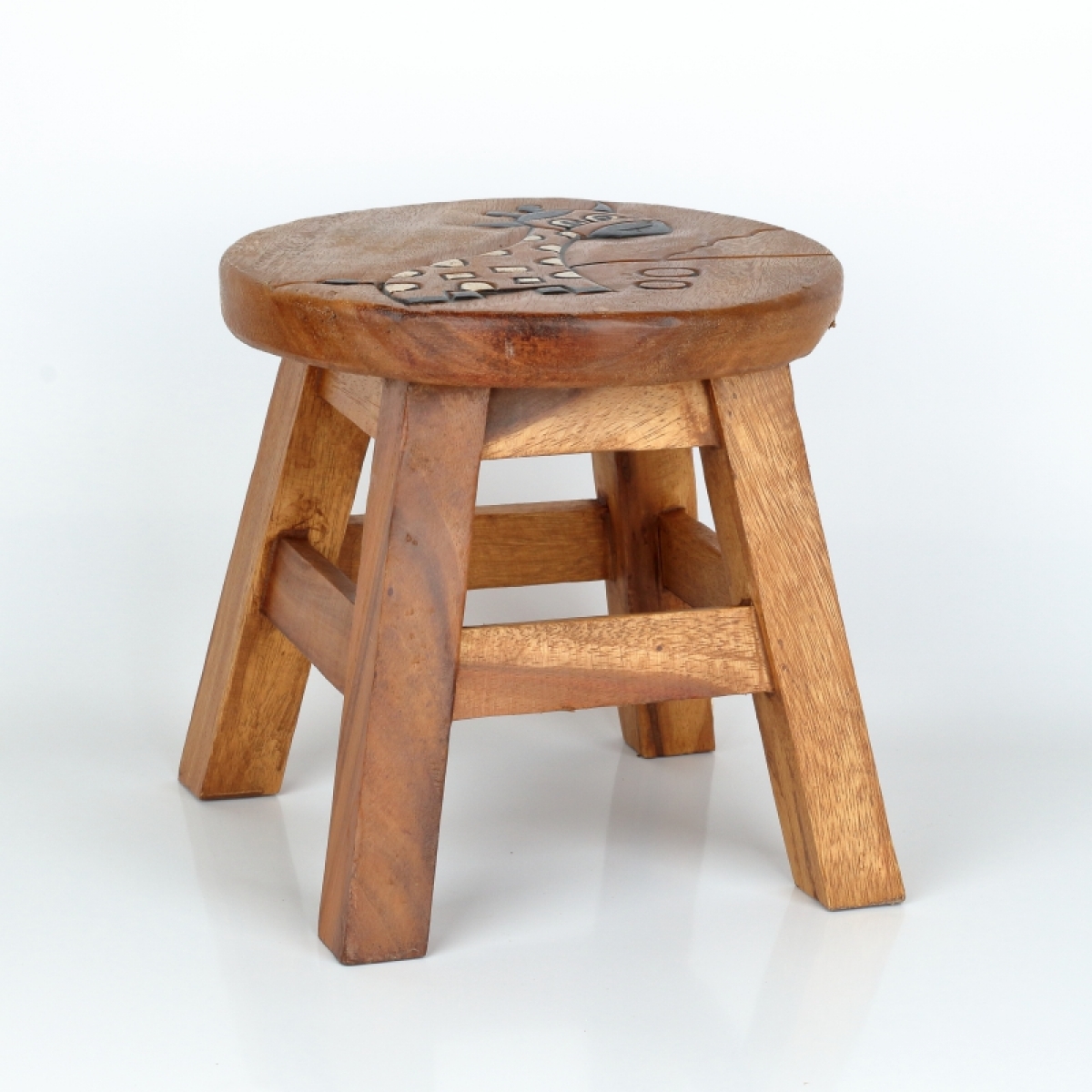 Rozměry: výška cca 26cm, podesta nožek o velikosti 25x25cm (průměr nesouměrného sedáku, který ovlivňuje tvar vyřezávaného motivu, je 26-30cm)