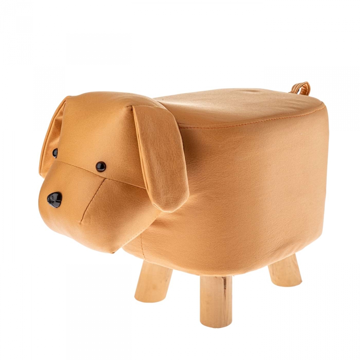 Tento taburet / dětská stolička ve tvaru pejska (rozměry cca 28 × 45 × 24 cm) je ztvárněn s laskavou hrou detailů – kulatý čumáček, ouška, tlapky. Barvy jsou jemné, pastelové, materiál vypadají jako dřevo nebo obarvený masiv-look, povrch hladký, bezpečný i pro malé ruce a nohy.