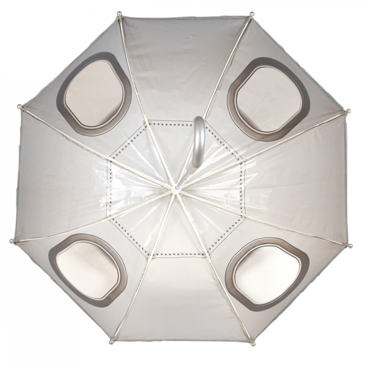 Nápaditý deštník je opatřen čtyřmi průhledy, které vypadají jako okna letadla. Nechybí na něm autentické rámování oken a dokonce ani nýtování.