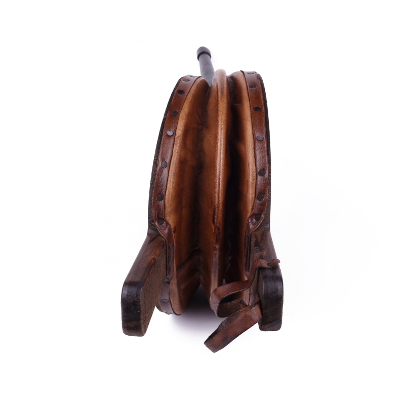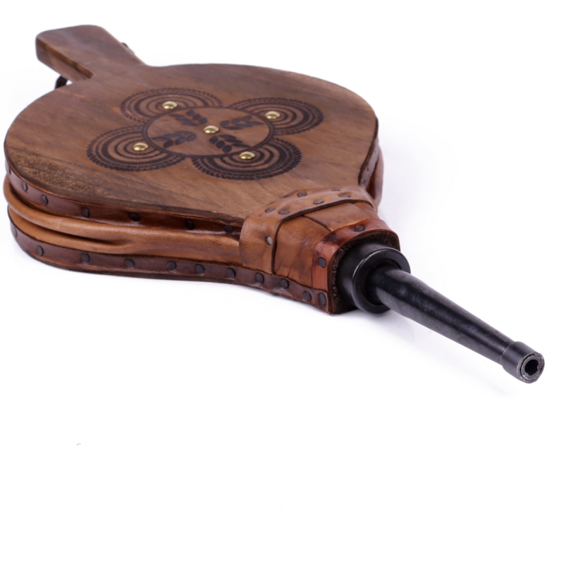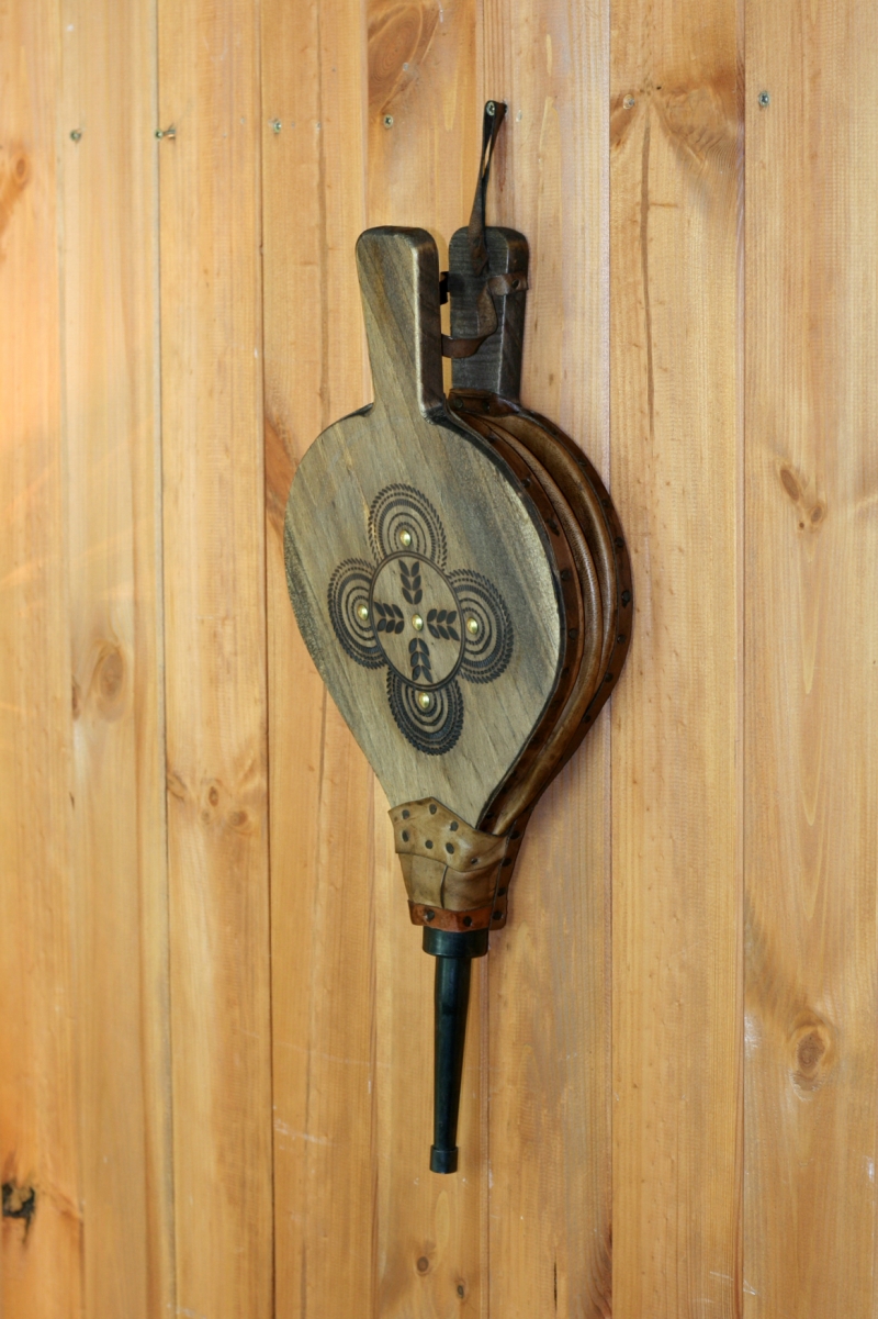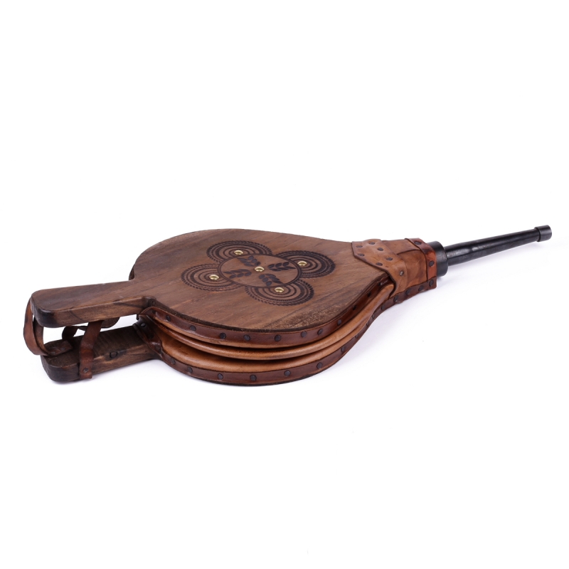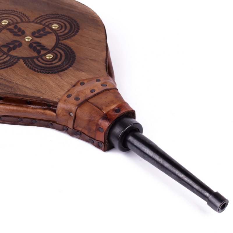 Funkční dmychadlo z pravé kůže a dřeva je určené pro rozdělávání ohně v kamnech, krbech a grilech. Bok dmychadla je zdoben ornamentem metodou vypalování a kovovými cvočky.