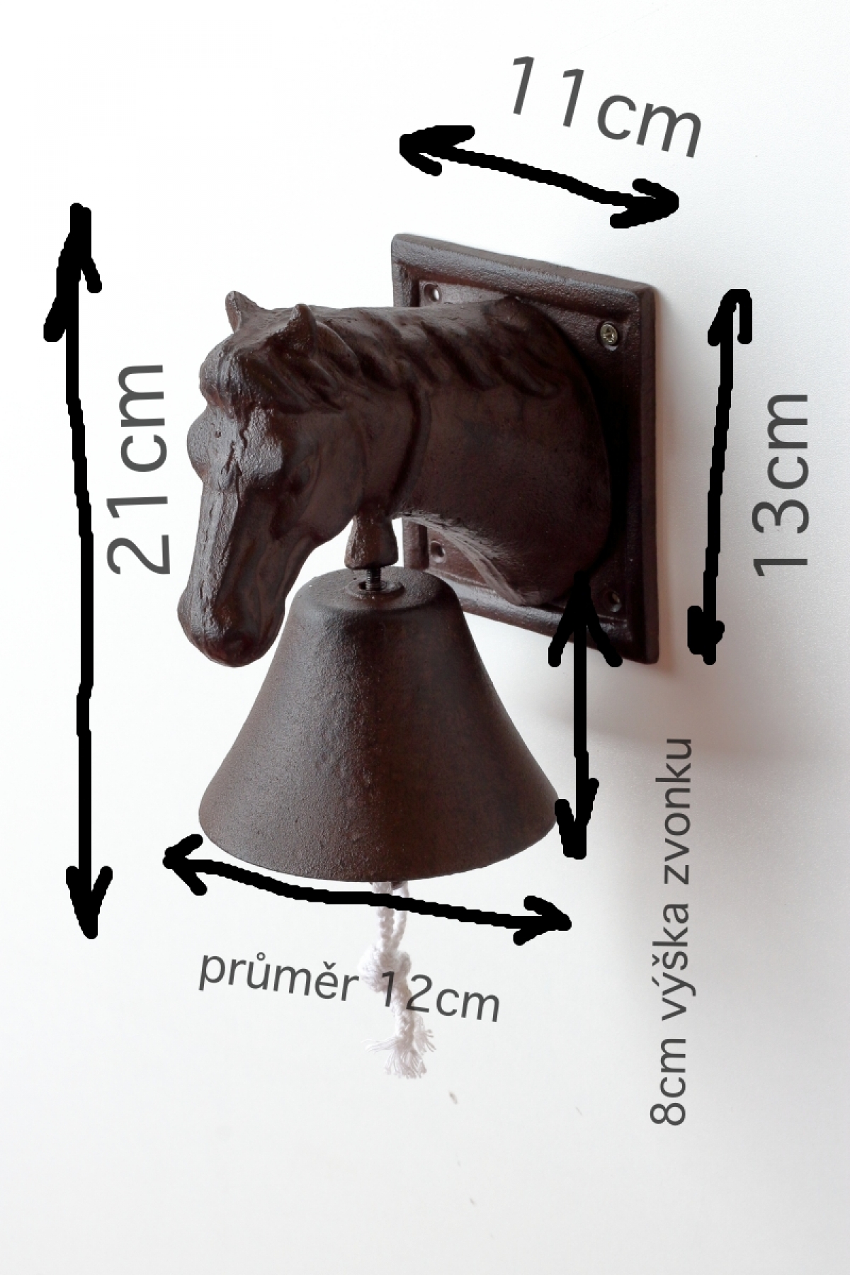 Domovní zvonek hlava koně 21x14cm vydává krásný zvuk, který jistě nepřeslechnete. Navíc zvonek bude dokonalým stylovým doplňkem vchodu do domu a návštěvy se k Vám budou těšit! Cink Cink.
