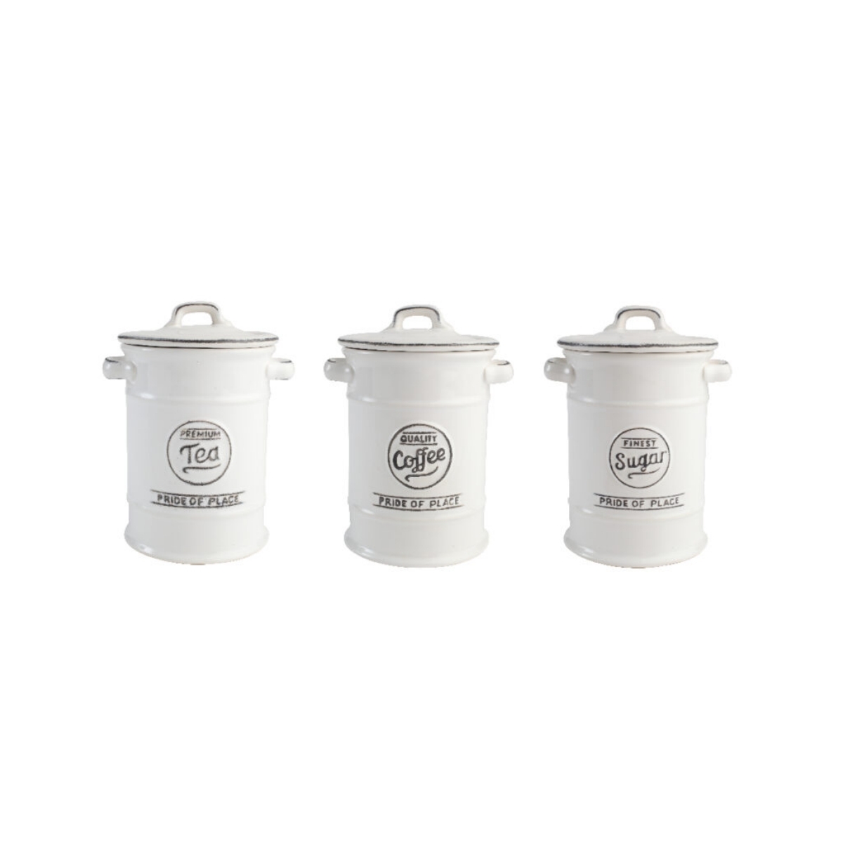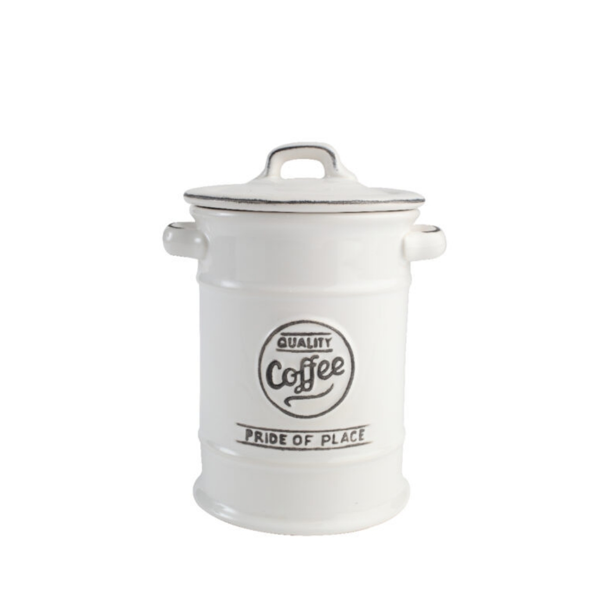 Praktická dóza na kávu v bílé barvě má nápisy a okraje v kontrastním černém provedení. Je vyrobena z pevné keramické hlíny a opatřena kvalitní glazurou, která je vhodná ke styku s potravinami. Káva, v ní uložená, zůstane dlouho čerstvá a chutná.