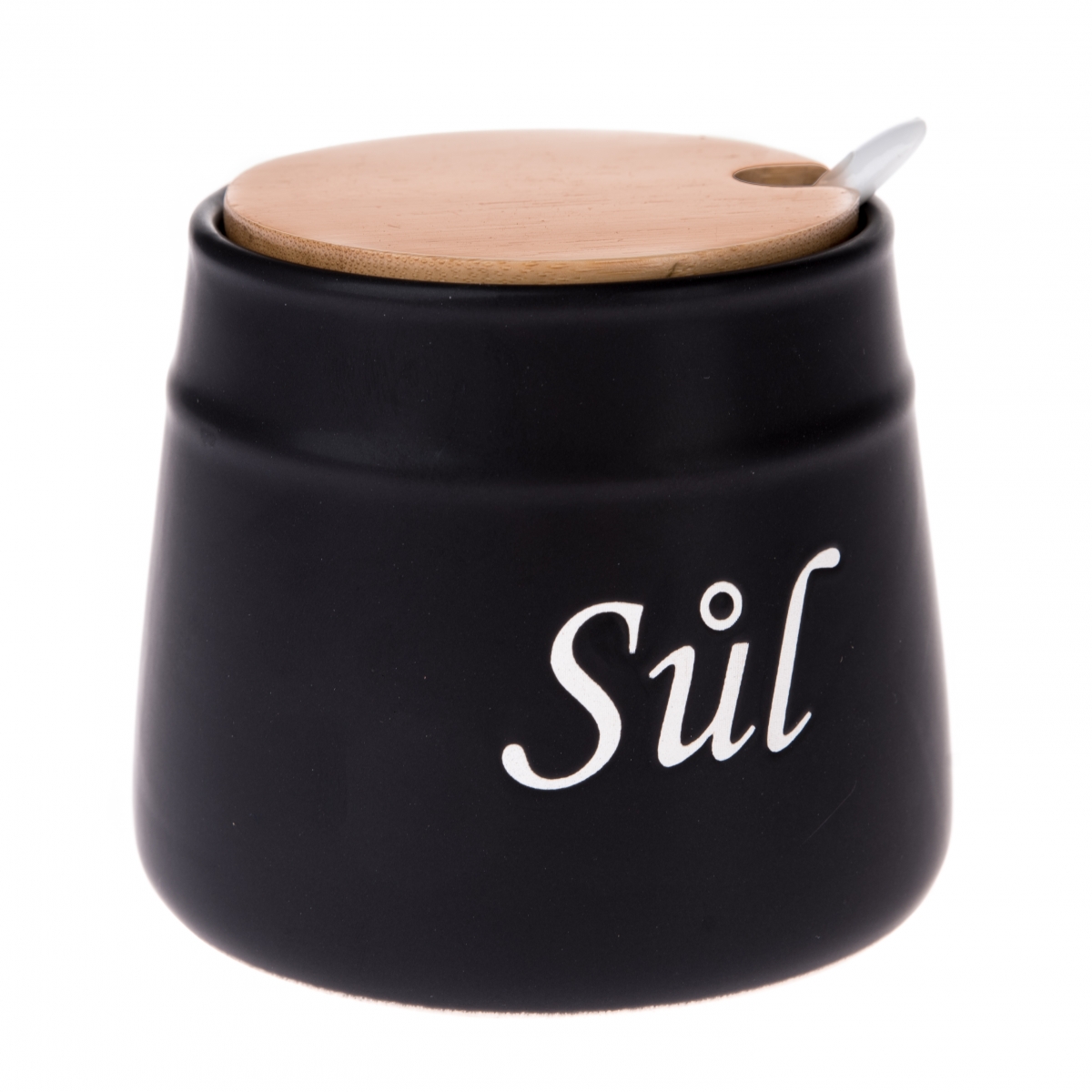 Dóza na sůl v matné černé barvě s bílým nápisem perfektně vynikne ve světle laděné kuchyni. Keramická solnička je doplněna víkem z bambusu, které chrání skladovanou sůl před vlhkem a prachem.
