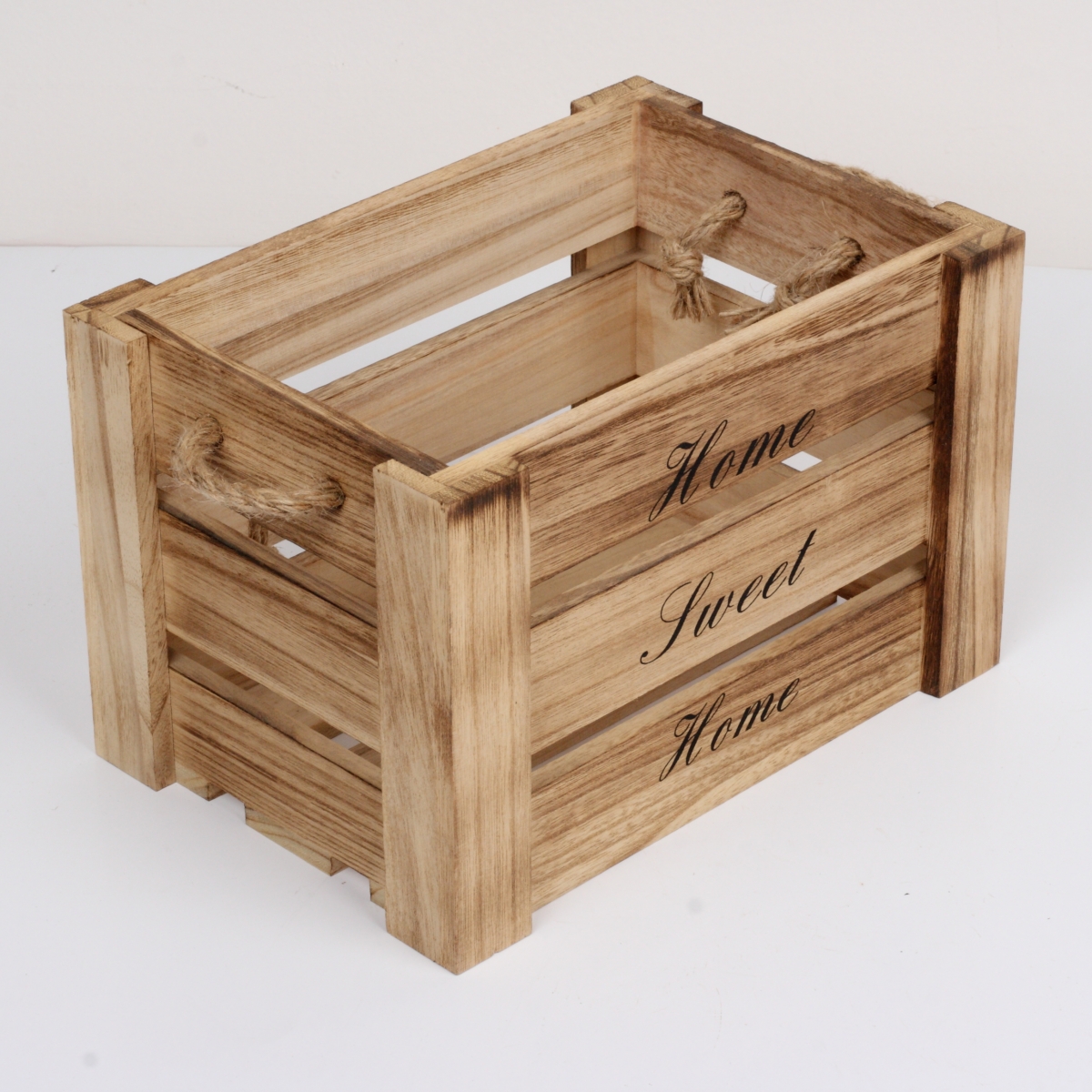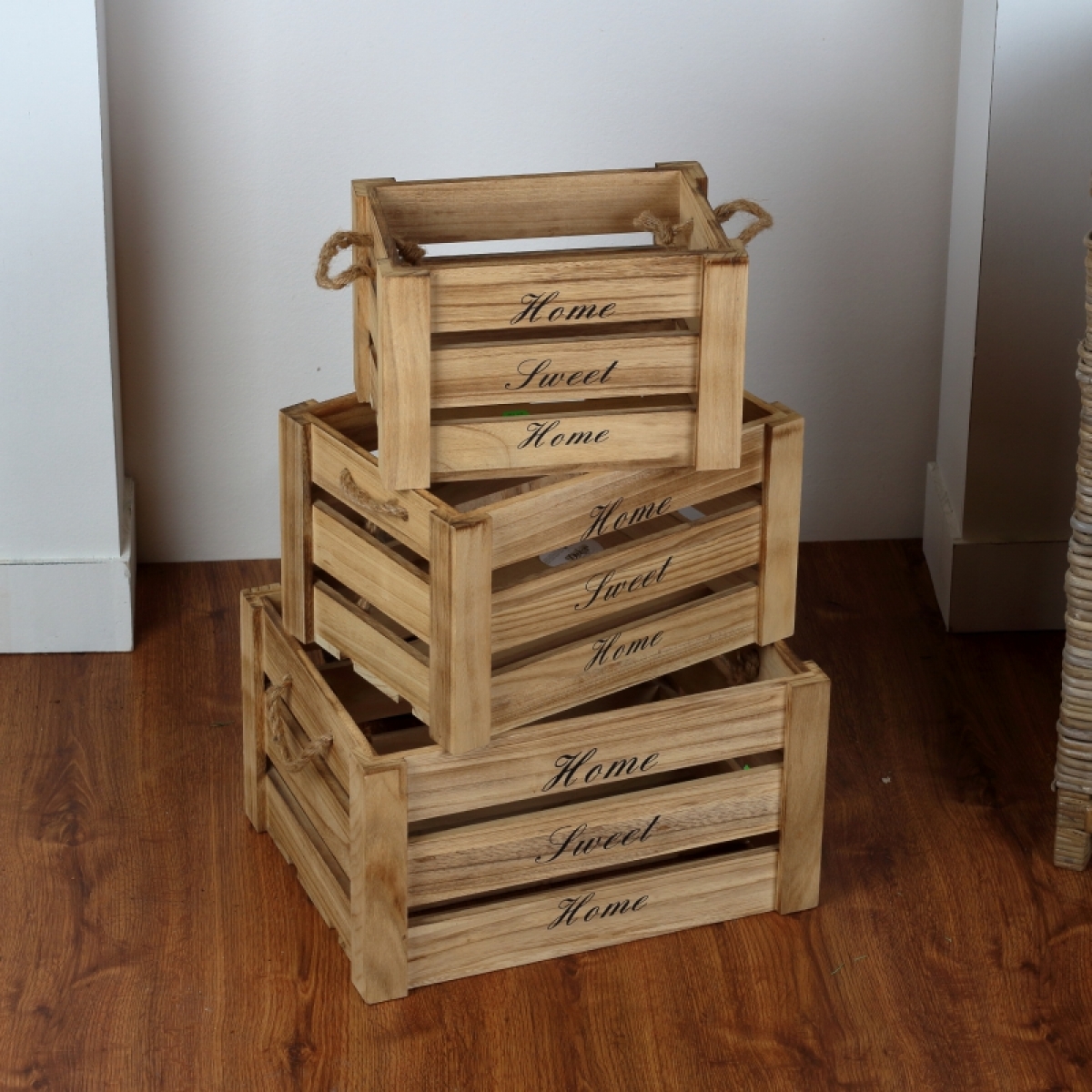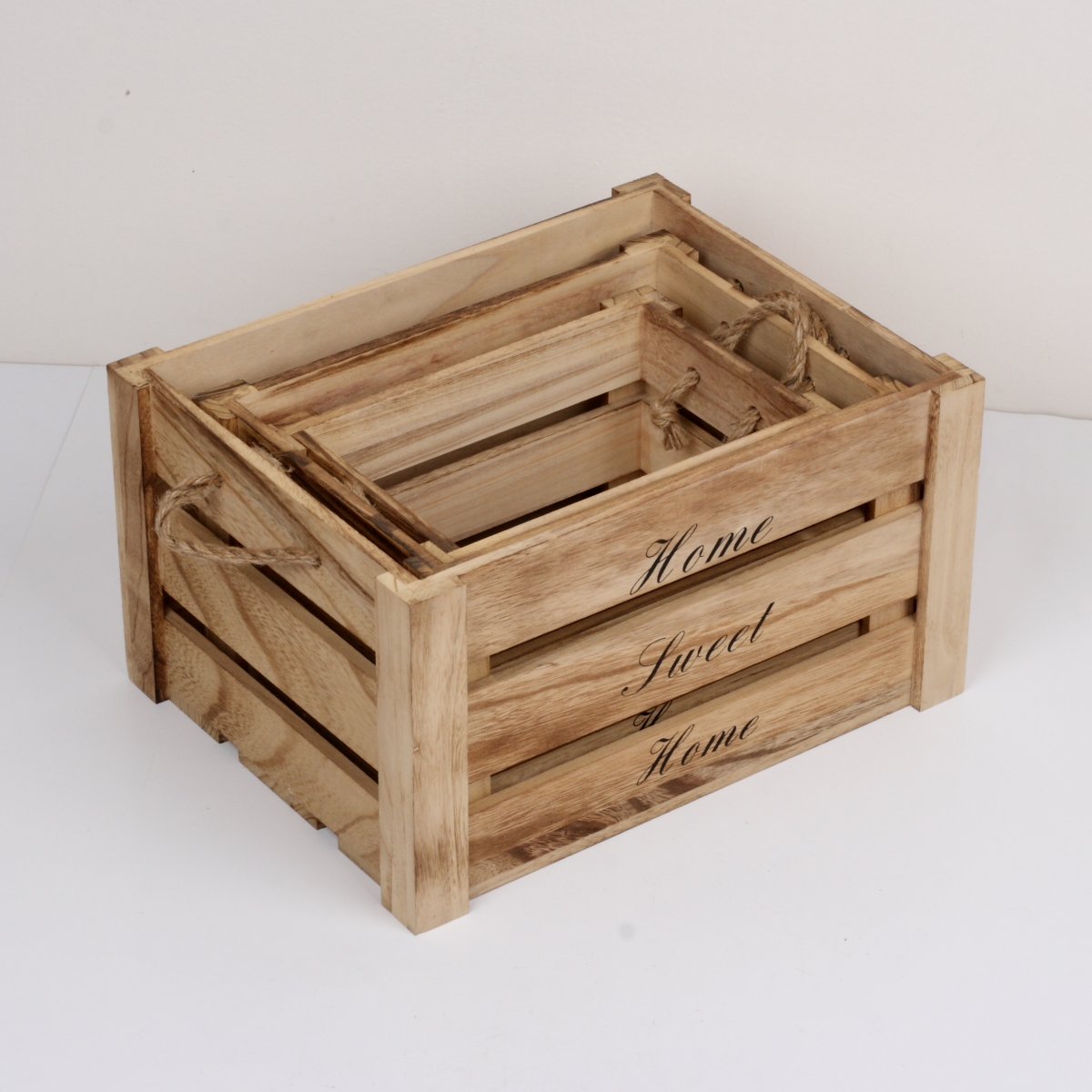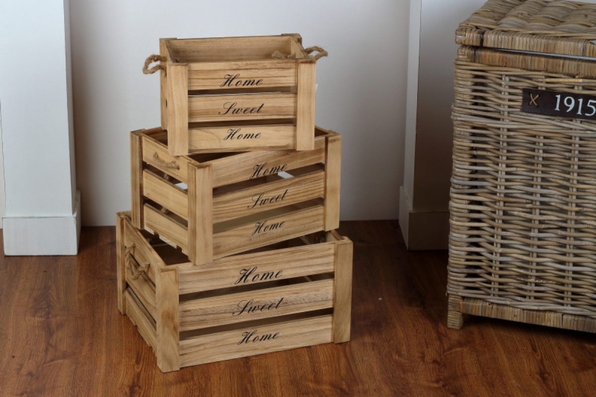 Dřevěná bedna Home sweet home (sada 3ks) na všechny věci, které mají být po ruce, ale přitom zůstat skryty.