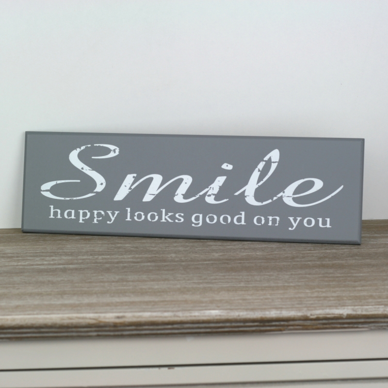 Dřevěná cedule SMILE šedá 40x12cm s nápisem Smile happy loks good on you Vás vyzývá k úsměvu!