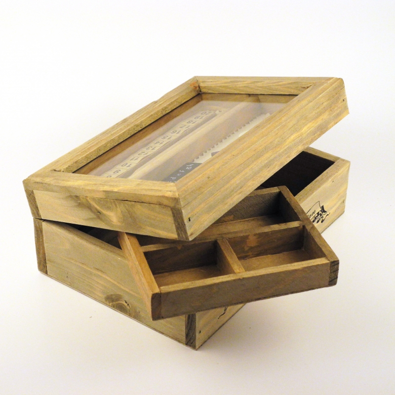 Součástí krabičky je dřevěný pořadač na třídění knoflíků, špendlíků...