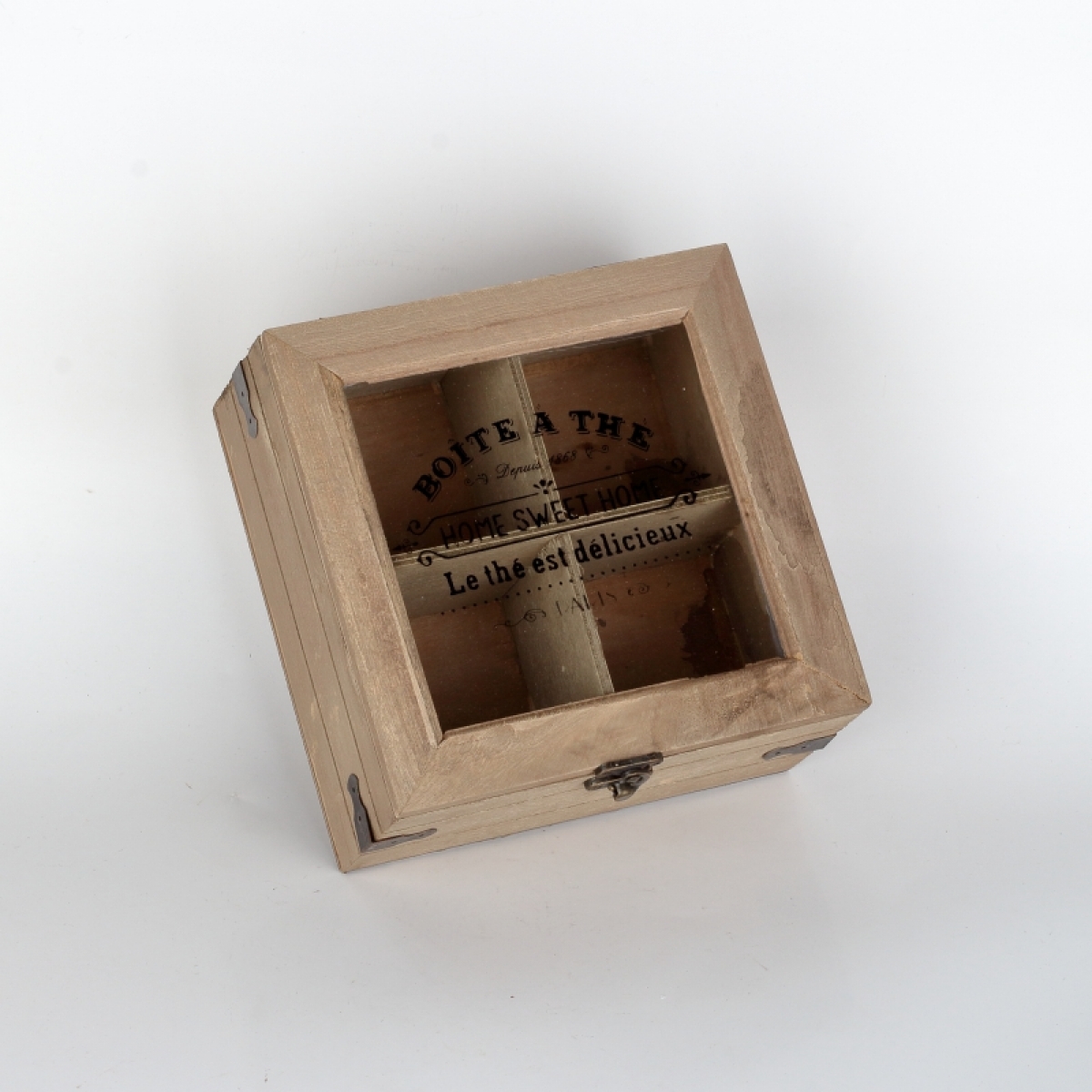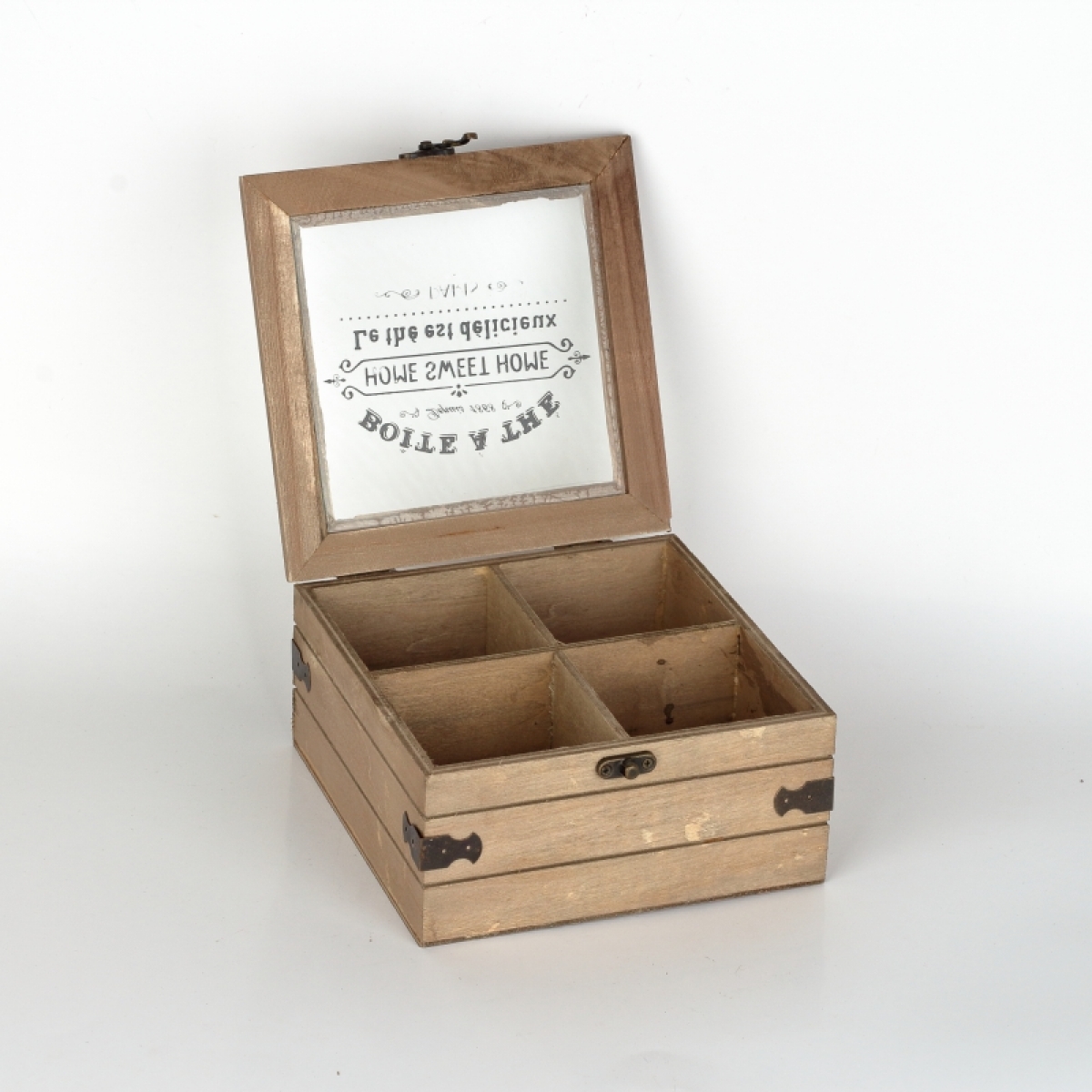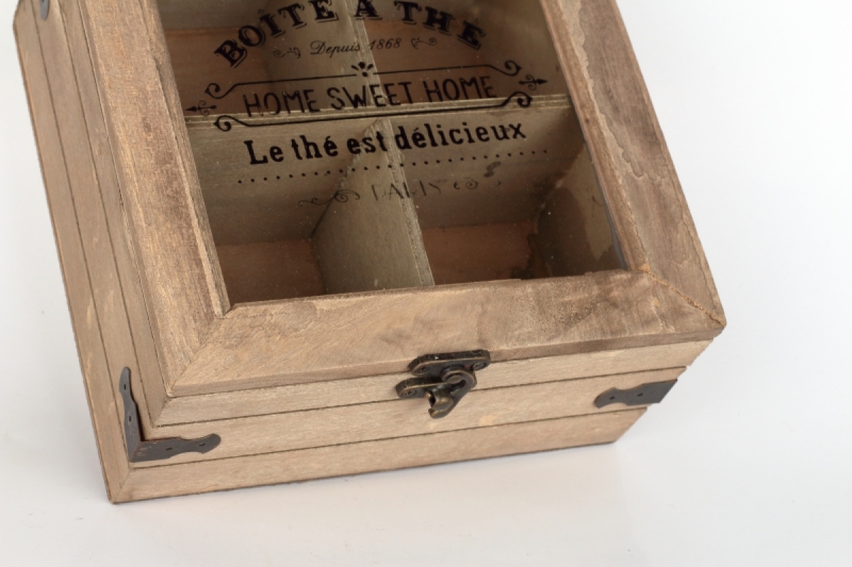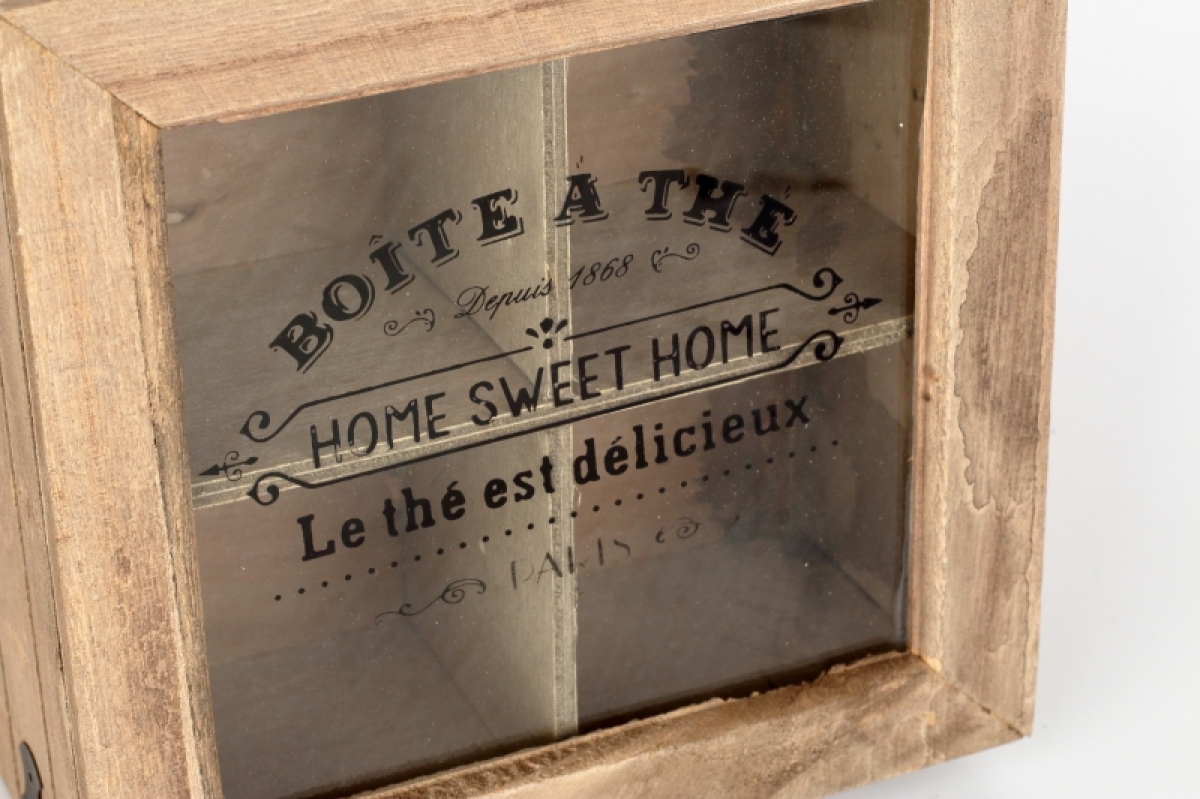 Dřevěná krabička se zdobeným sklem s nápisem HOME SWEET HOME je určena především pro rozdělení čtyř nejoblíbenějších čajů pro vaši chvilku pohody.
