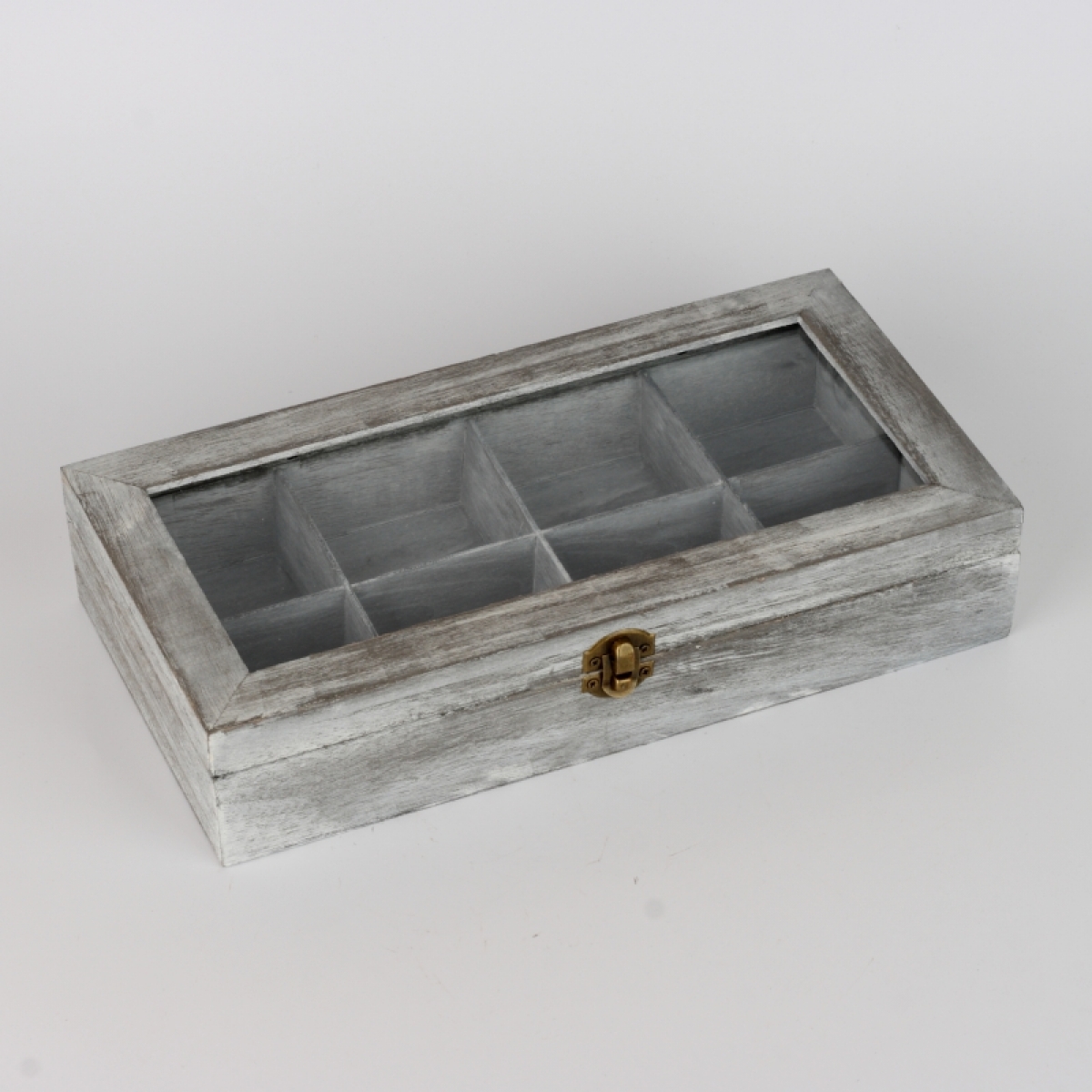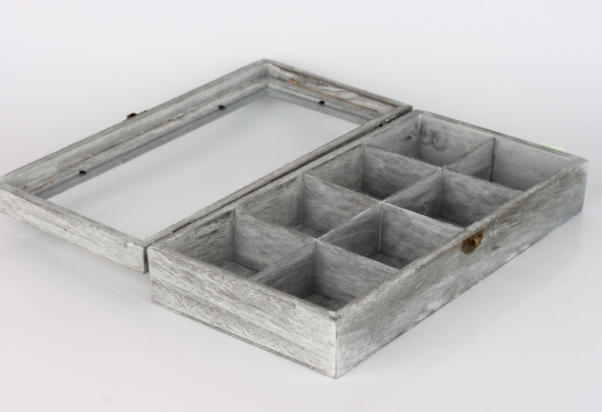 Dřevěná krabička s patinou 31x15x6cm má šikovné přihrádky a prosklené víko, přes které budete mít výborný přehled.