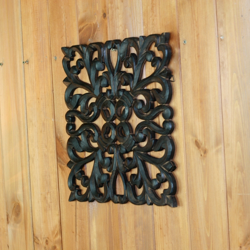 Tento ze dřeva vyřezávaný ozdobný panel vytváří na stěně krásný "netradiční" obrazec. Dekorace je vyřezána z tmavého dřeva, které je doplněno patinou.