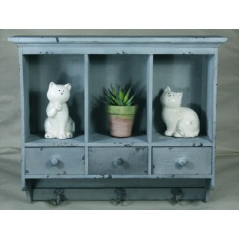 Polička má šedo-modrý nádech s patinou, ve spodní části jsou umístěné tři kovové háčky.