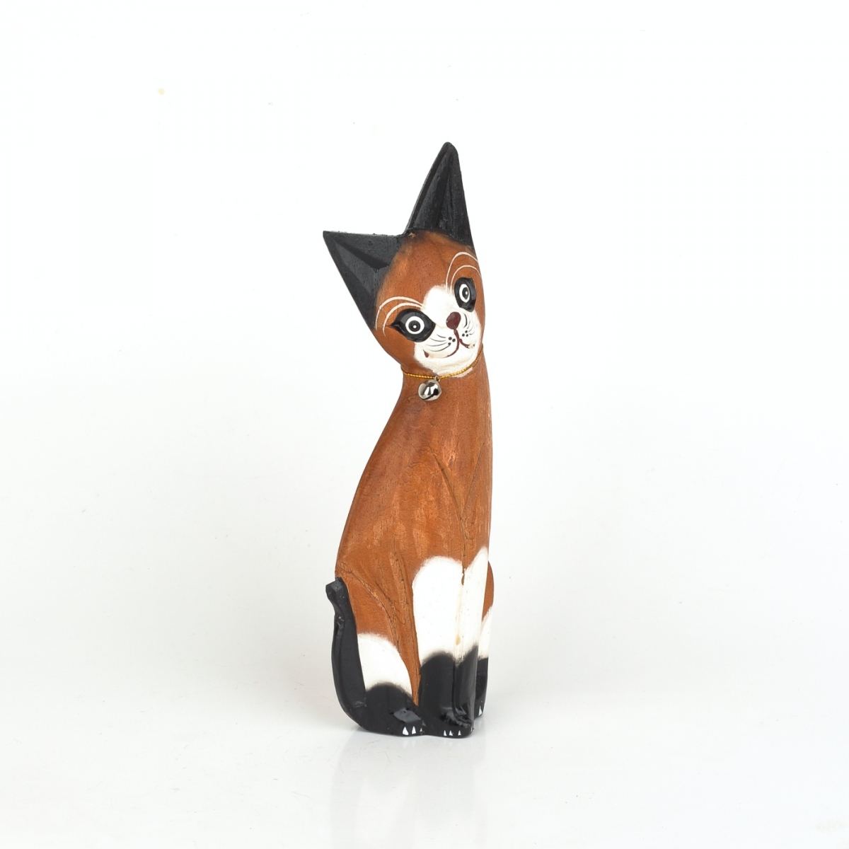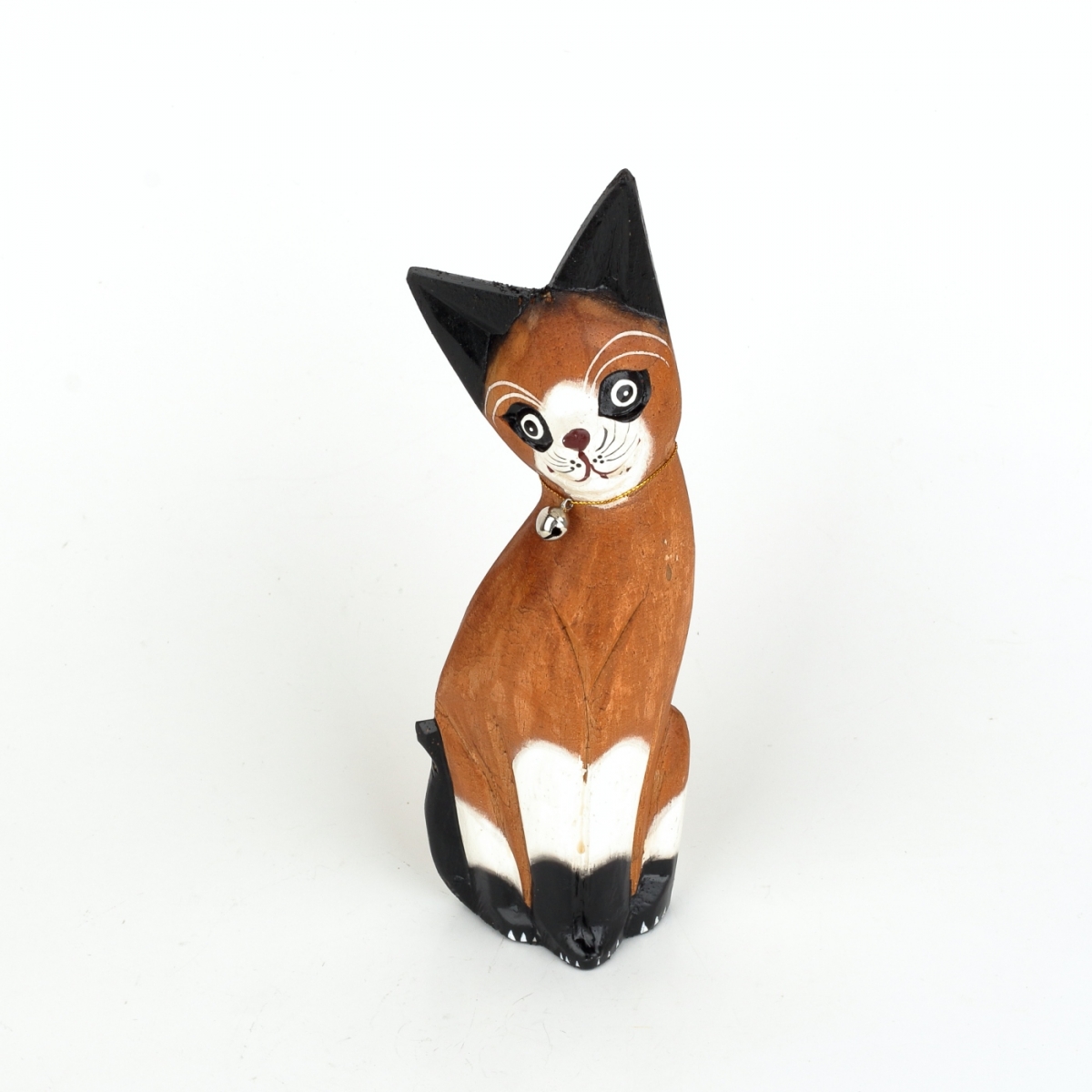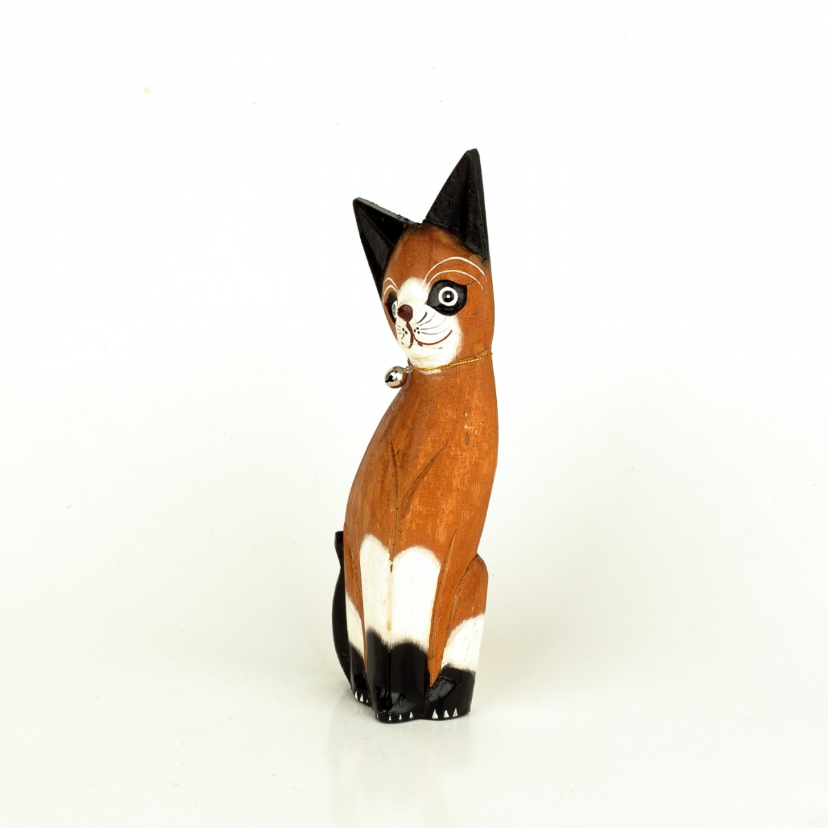 Dřevěná soška kočky je vyřezaná z lehkého tropického dřeva a ručně malovaná řezbářem z daleké východní Asie.