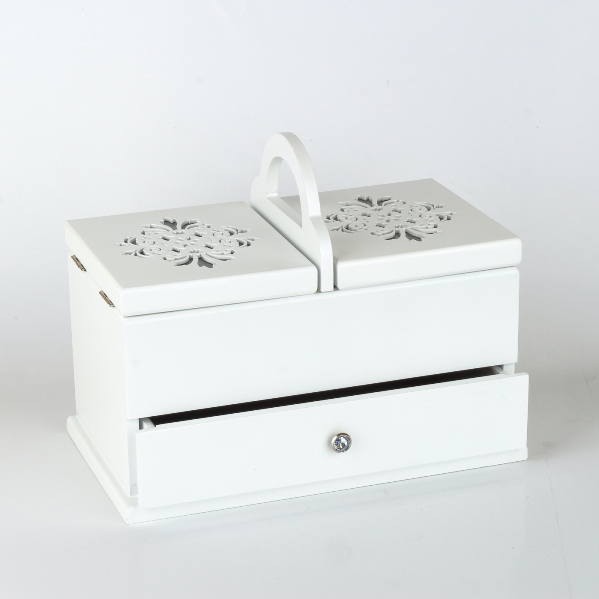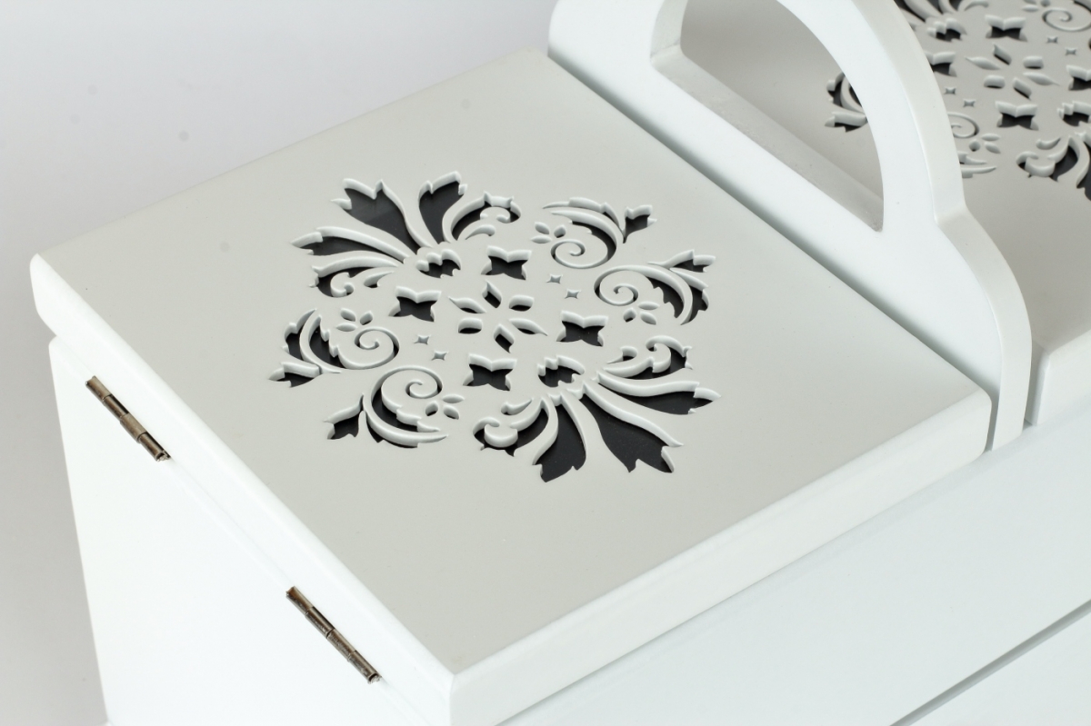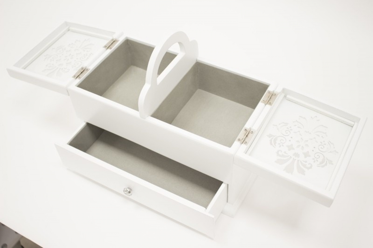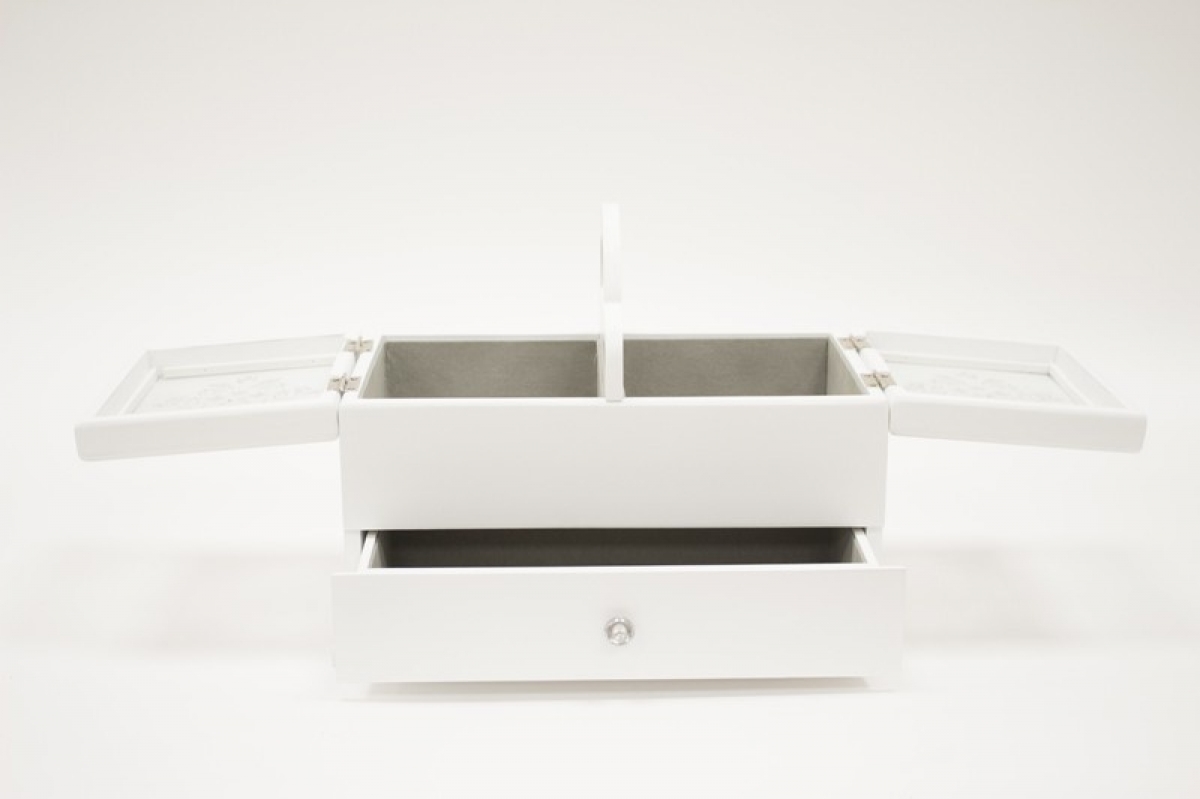 Šperkovnici můžete využít též jako krabičku na šití, s praktickým úchytem pro přenášení. V horní části jsou dvě přihrádky na jehly a nitě a v dolní části je zásuvka třeba na nůžky a další šicí potřeby...