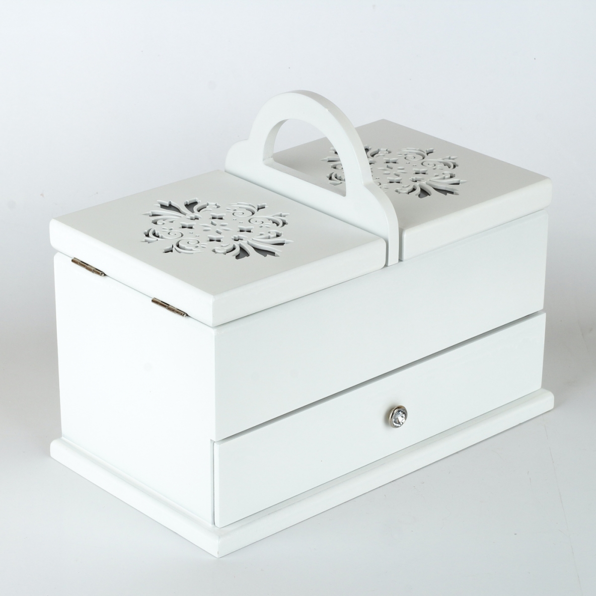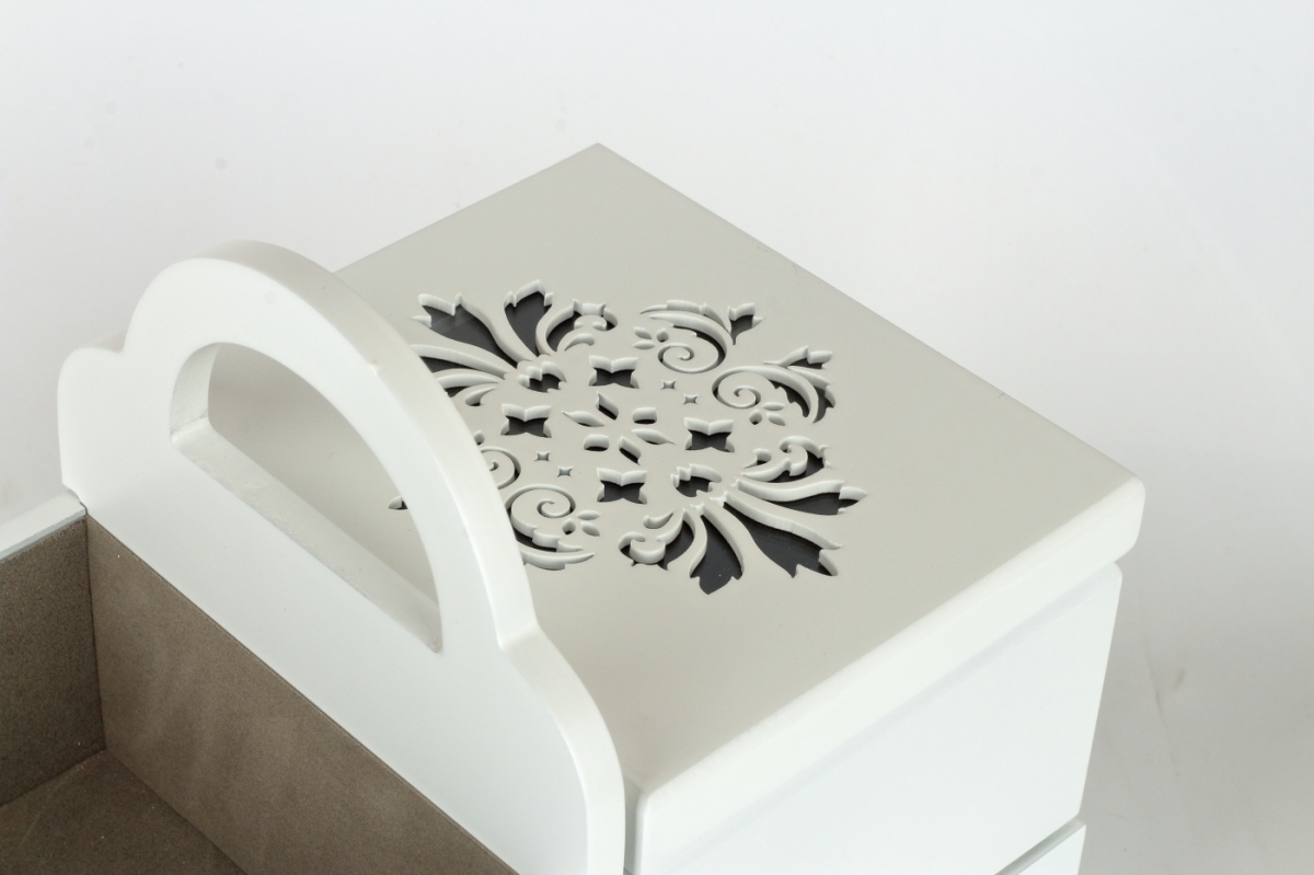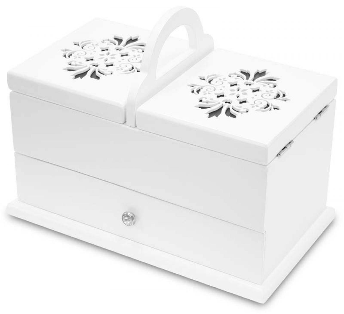 Šperkovnici můžete využít též jako krabičku na šití, s praktickým úchytem pro přenášení. V horní části jsou dvě přihrádky na jehly a nitě a v dolní části je zásuvka třeba na nůžky a další šicí potřeby...