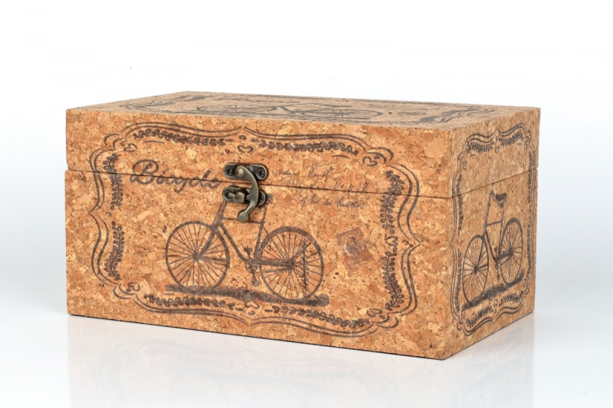 Dřevěná truhla 24x14x12cm je stylově dekorovaná a potažená přírodním korkem.