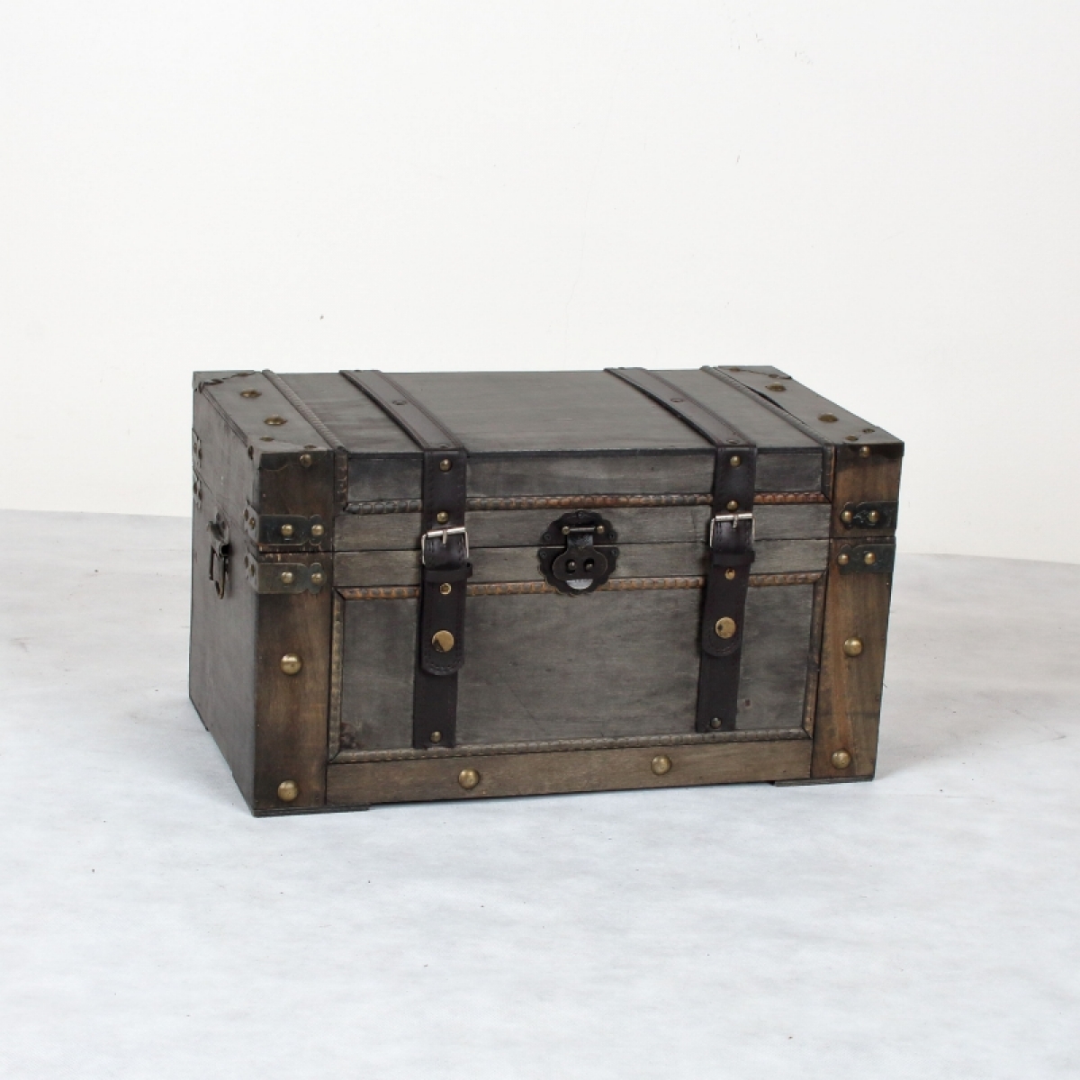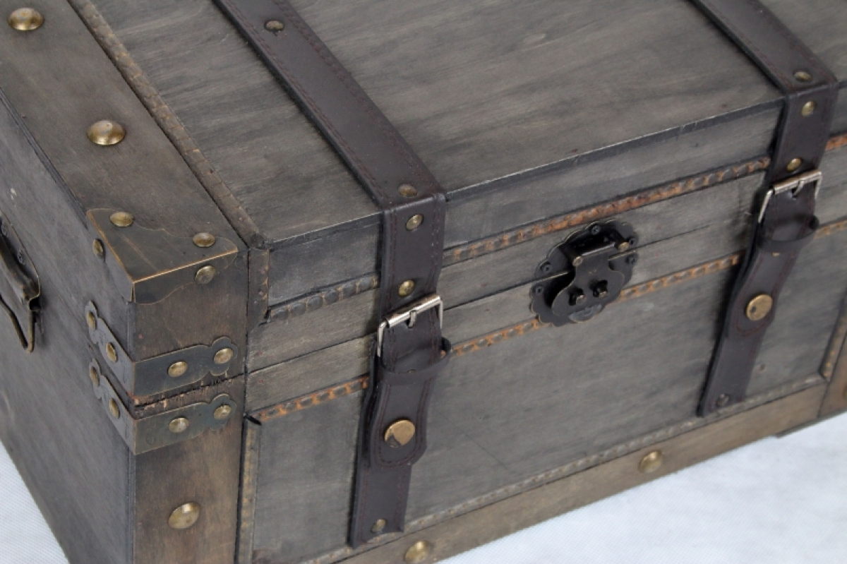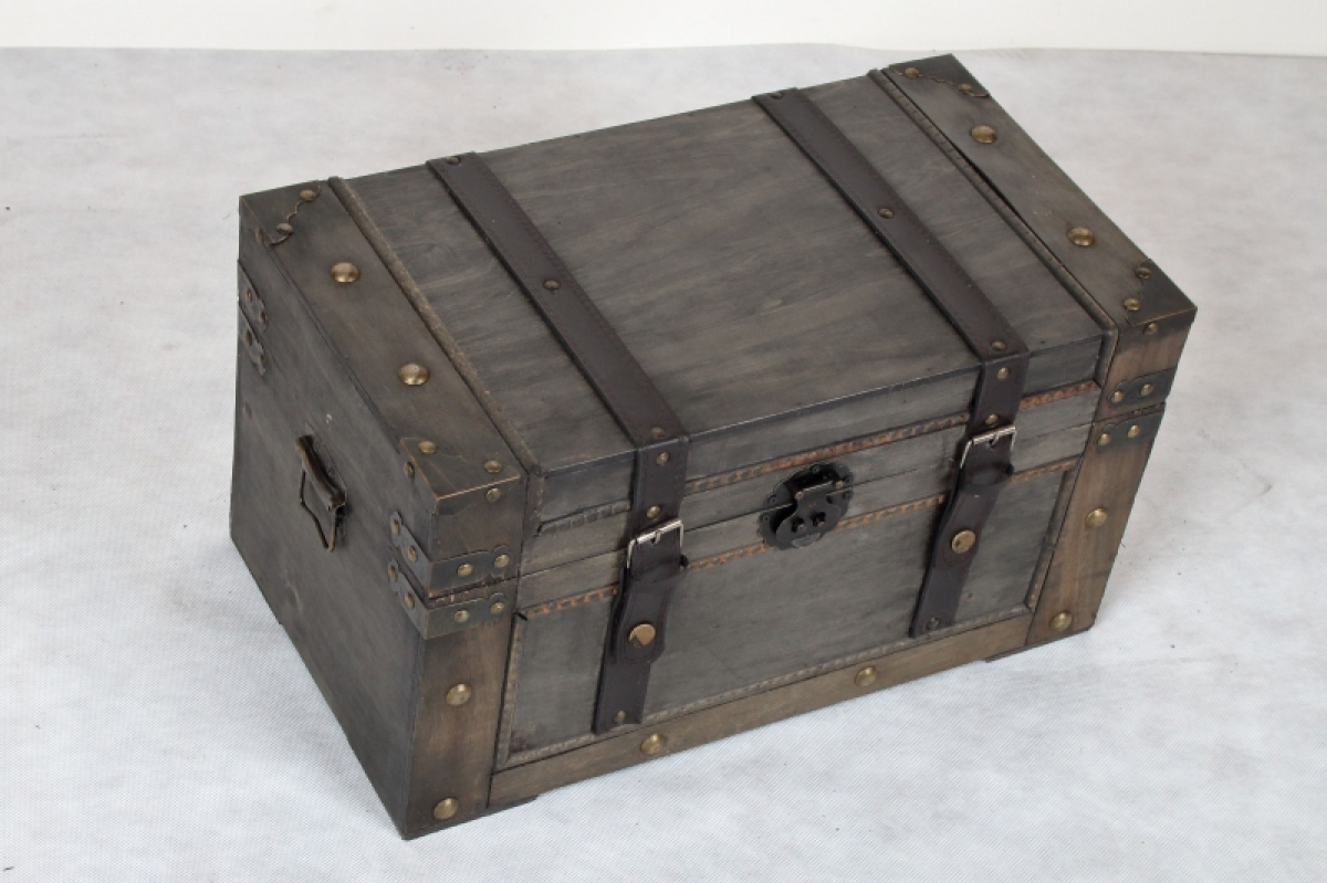 Dřevěná truhla 45x25x25cm poslouží jako úložný prostor na spoustu věcí a zároveň bude krásným doplňkem interiéru. Truhla má nýty ve zlaté barvě a koženkové popruhy.
