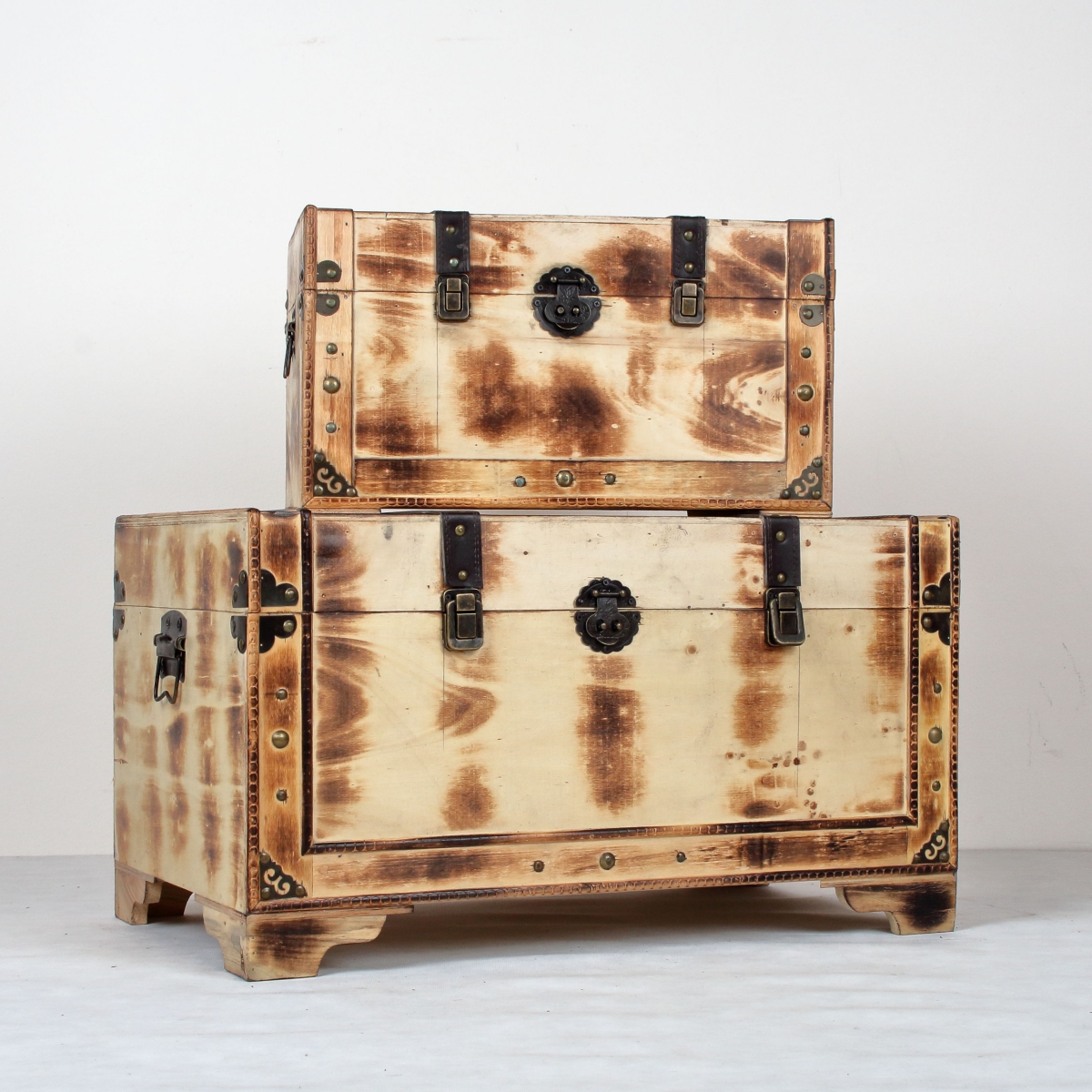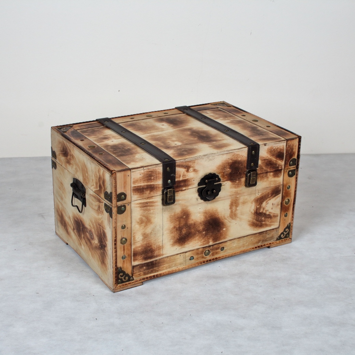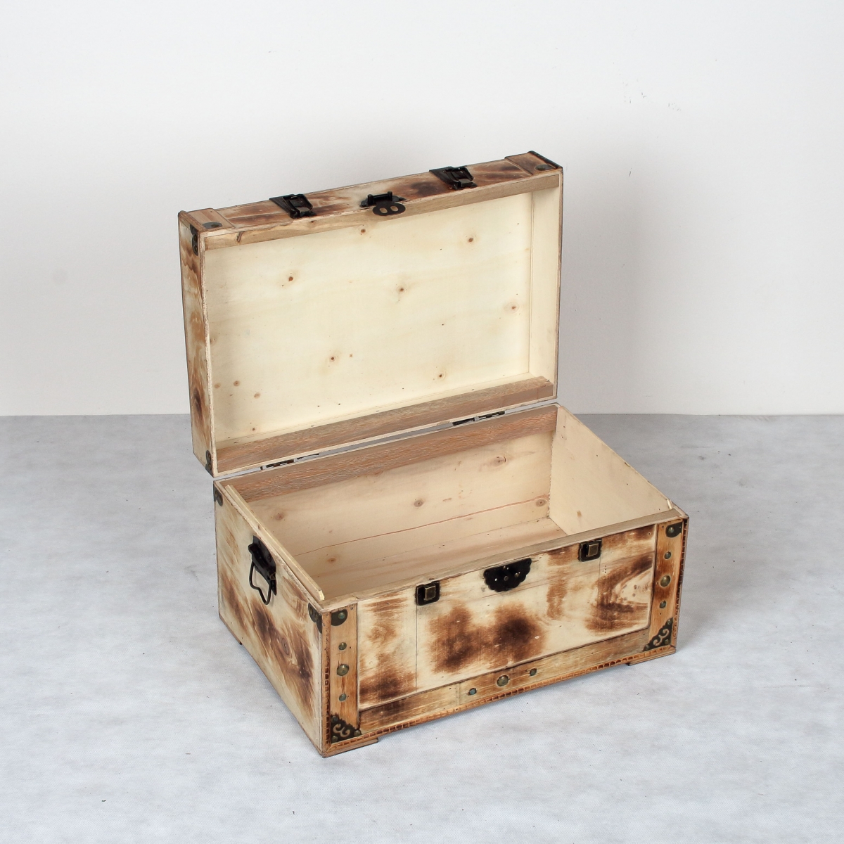 Dřevěná truhla M poslouží jako úložný prostor na spoustu věcí a zároveň bude krásným doplňkem interiéru. Truhla má pěkné detaily, nýty ve zlaté barvě a kožené popruhy.