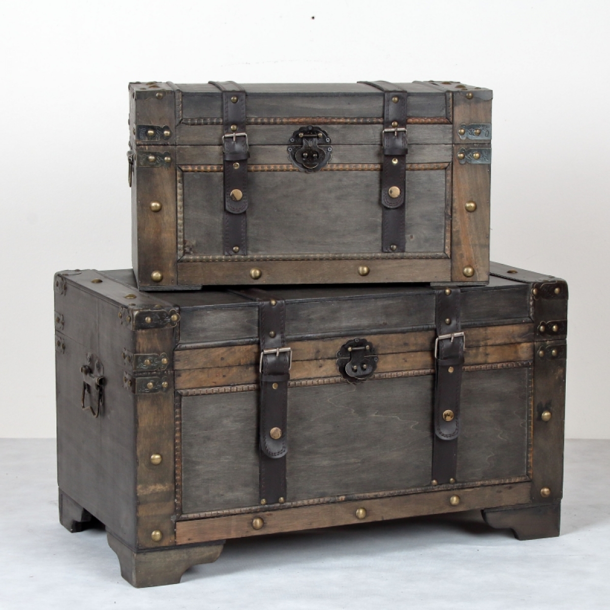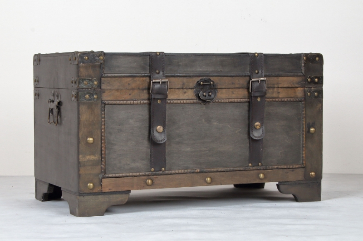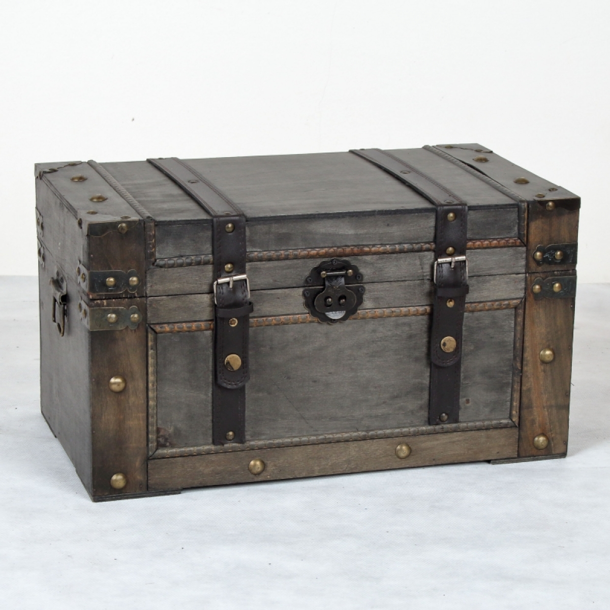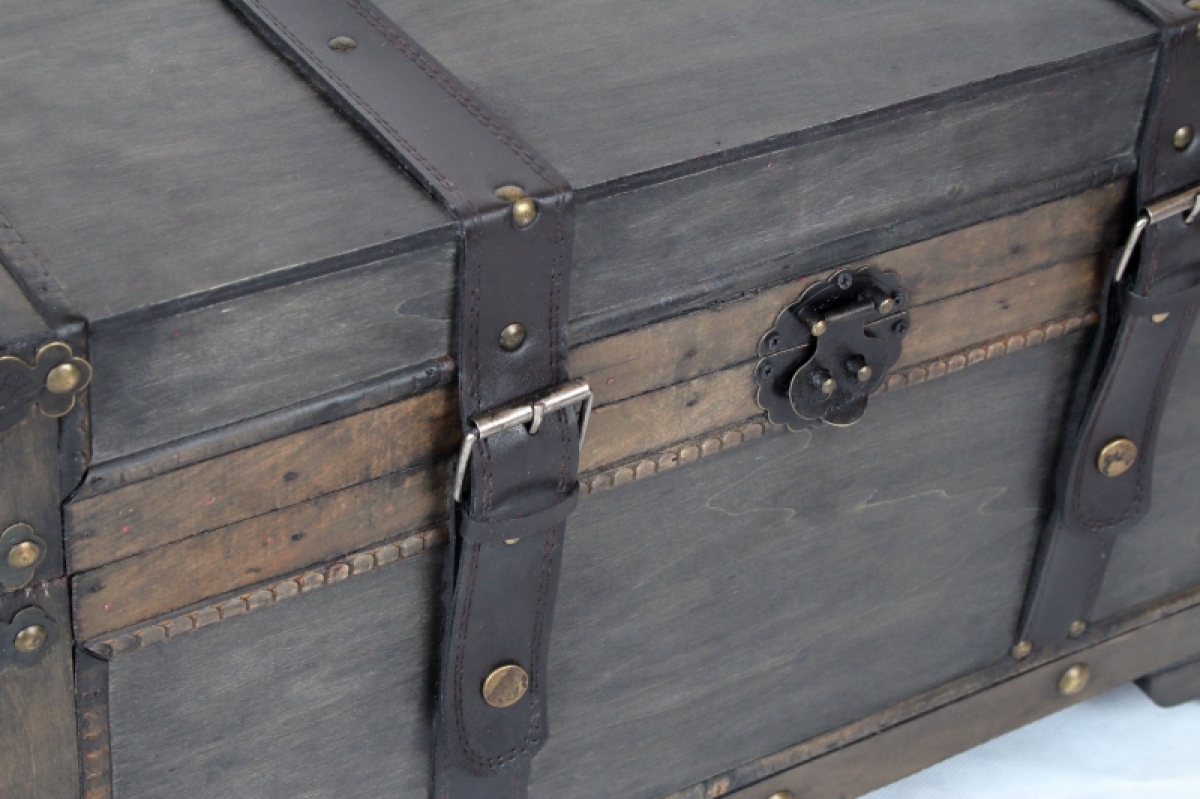 Dřevěná truhla 60x33x34cm poslouží jako úložný prostor na spoustu věcí a zároveň bude krásným doplňkem interiéru. Truhla má nýty ve zlaté barvě a koženkové popruhy.