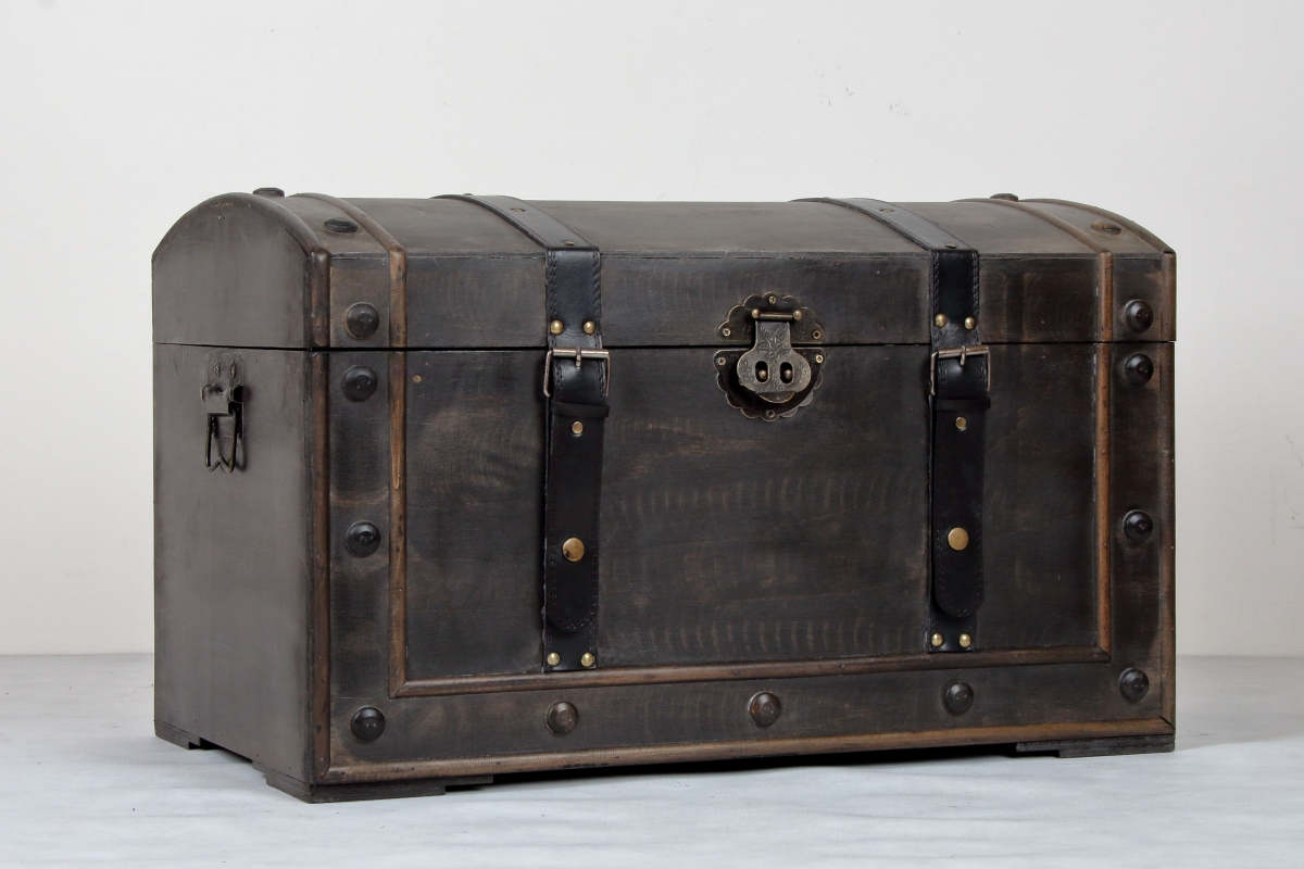 Truhla má propracované kování, koženkové popruhy a ozdobné nýty. Hodí se do stylově zařízených prostor, kde perfektně podtrhnou osobitý styl interiéru.