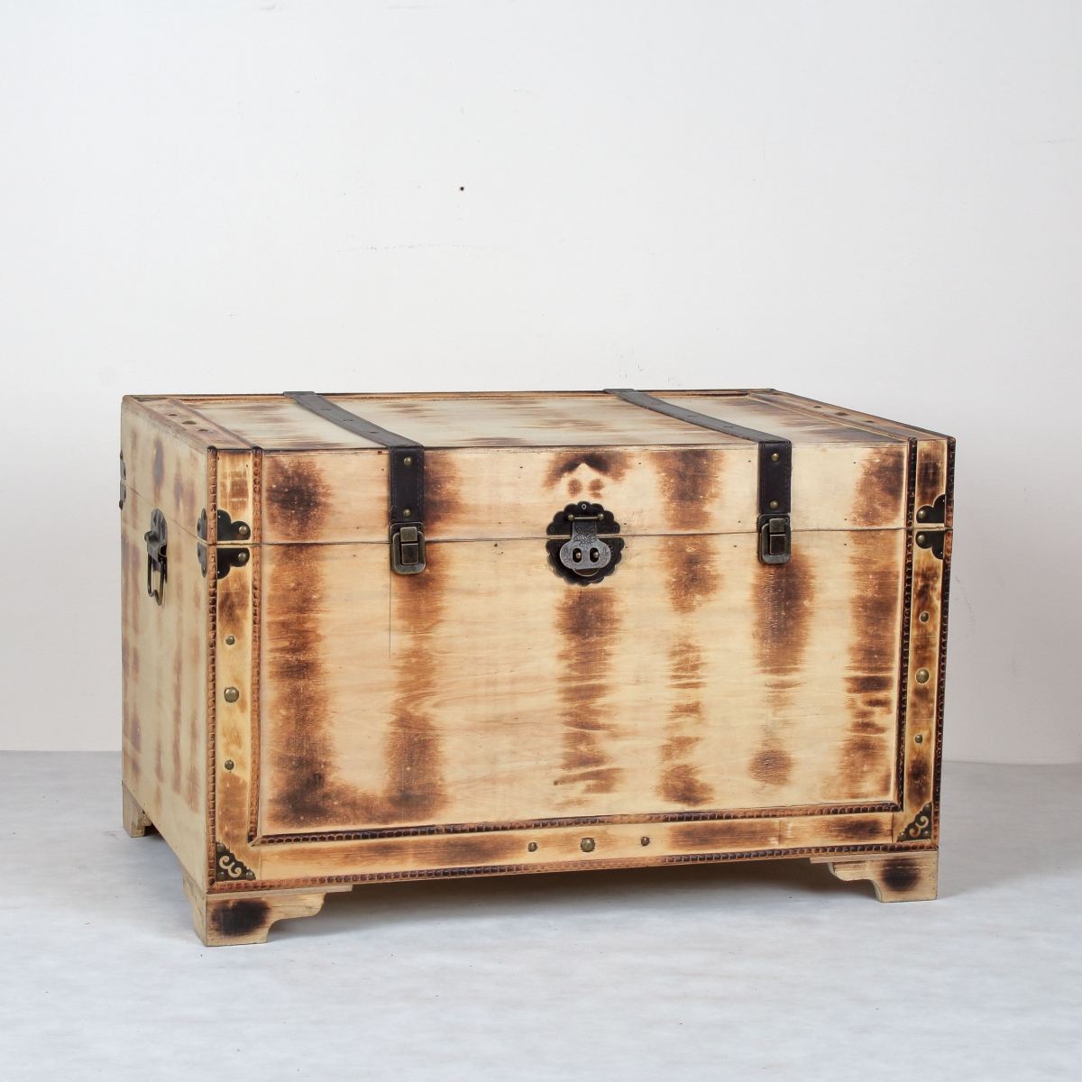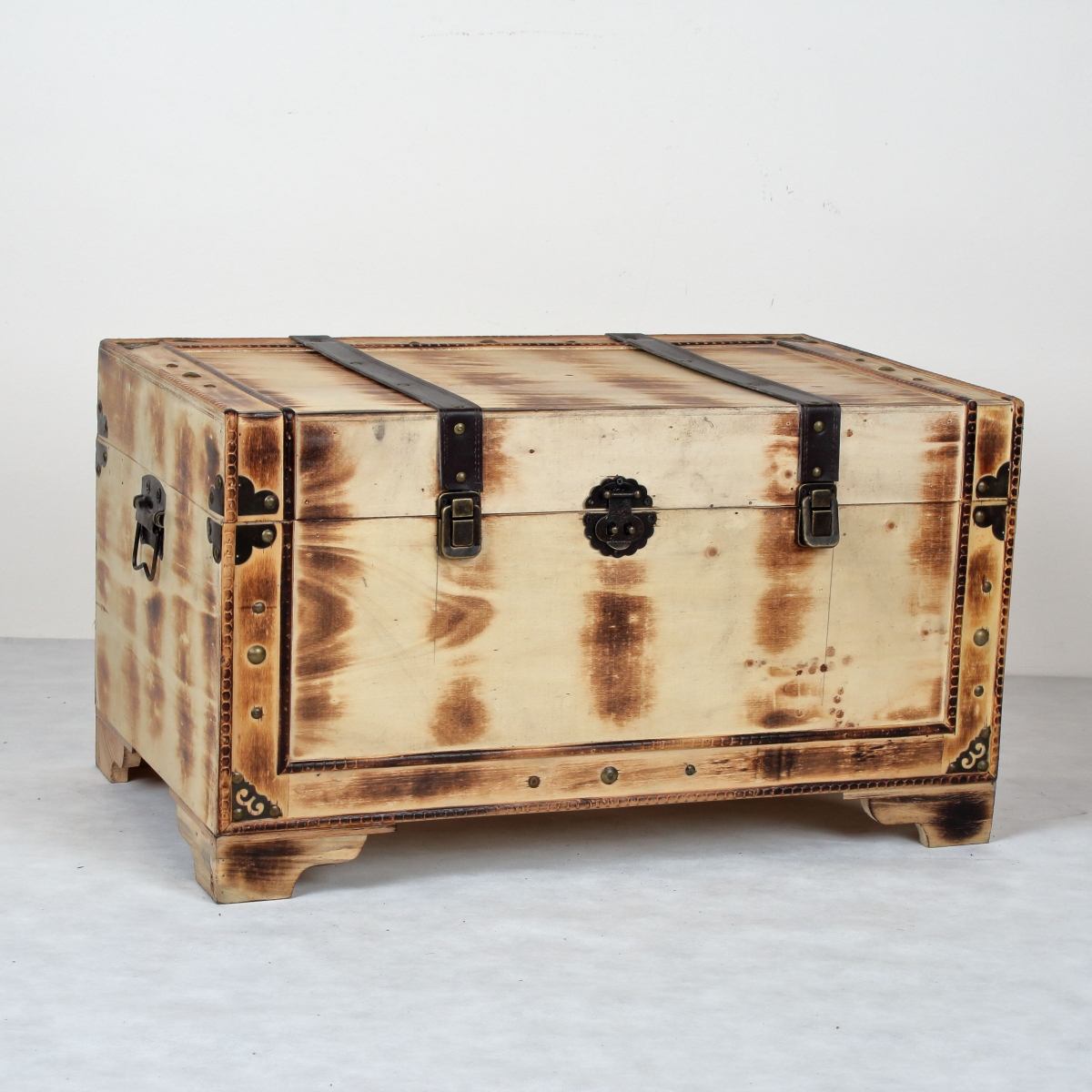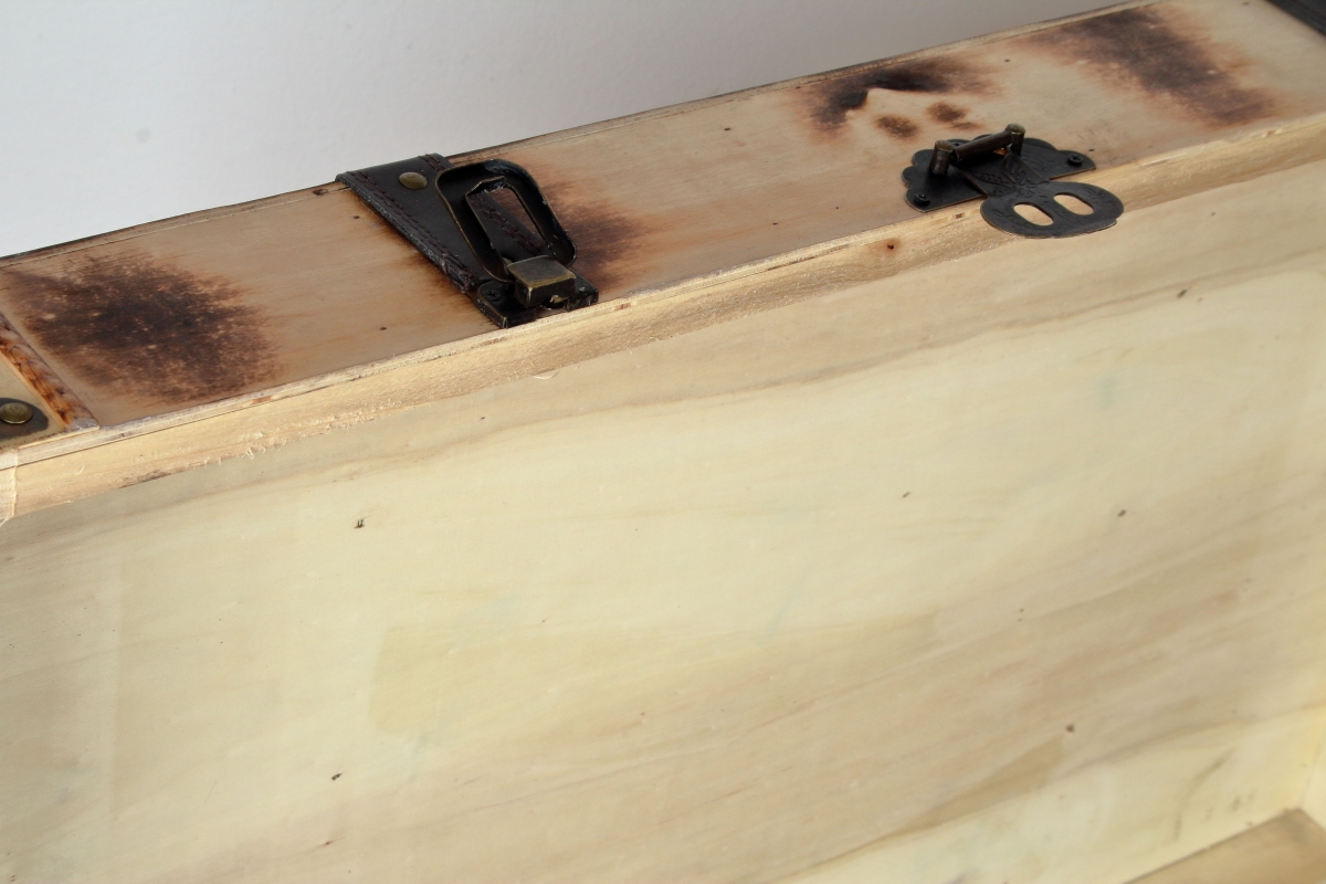 Dřevěná truhla L poslouží jako úložný prostor na spoustu věcí a zároveň bude krásným doplňkem interiéru. Truhla má pěkné detaily, nýty ve zlaté barvě a kožené popruhy.