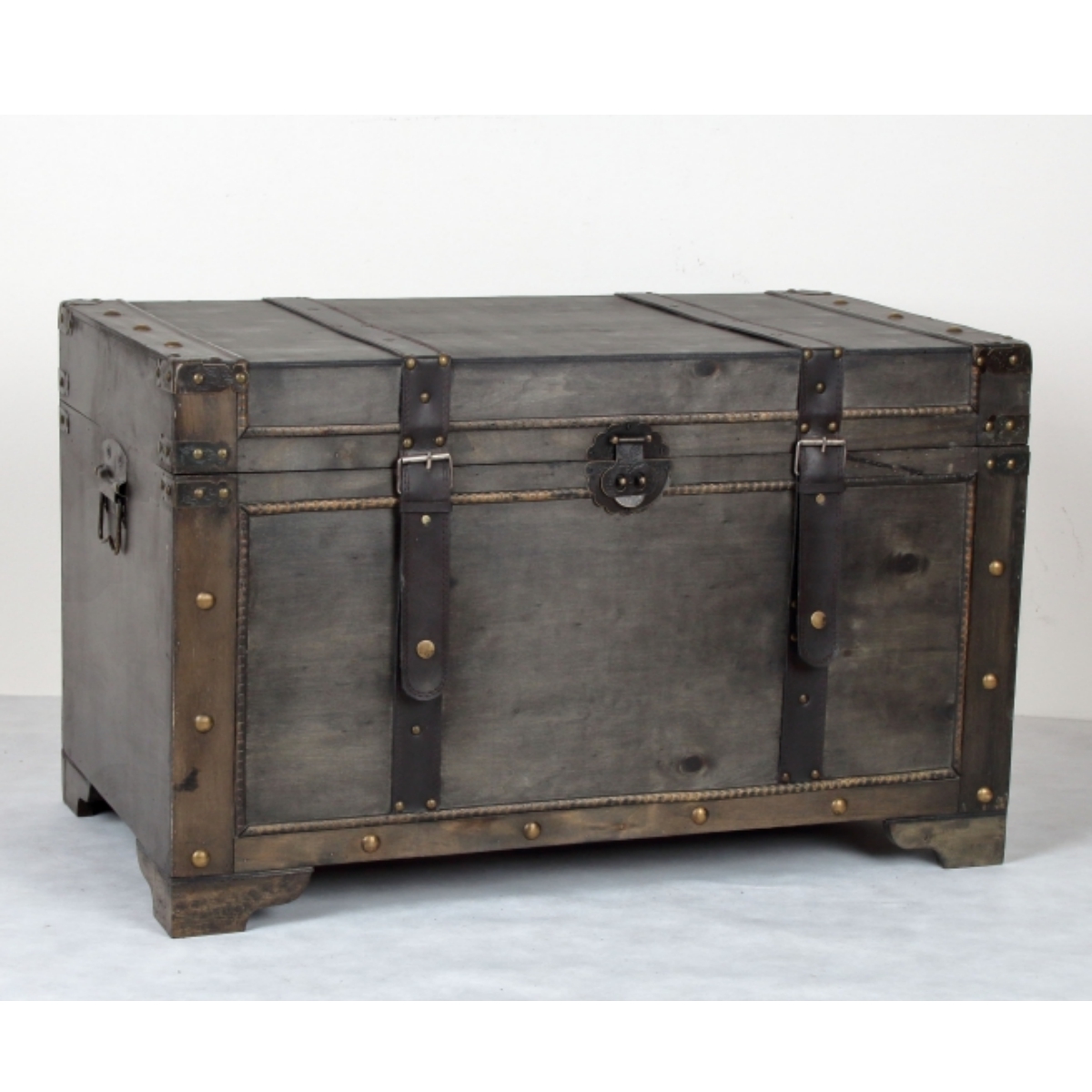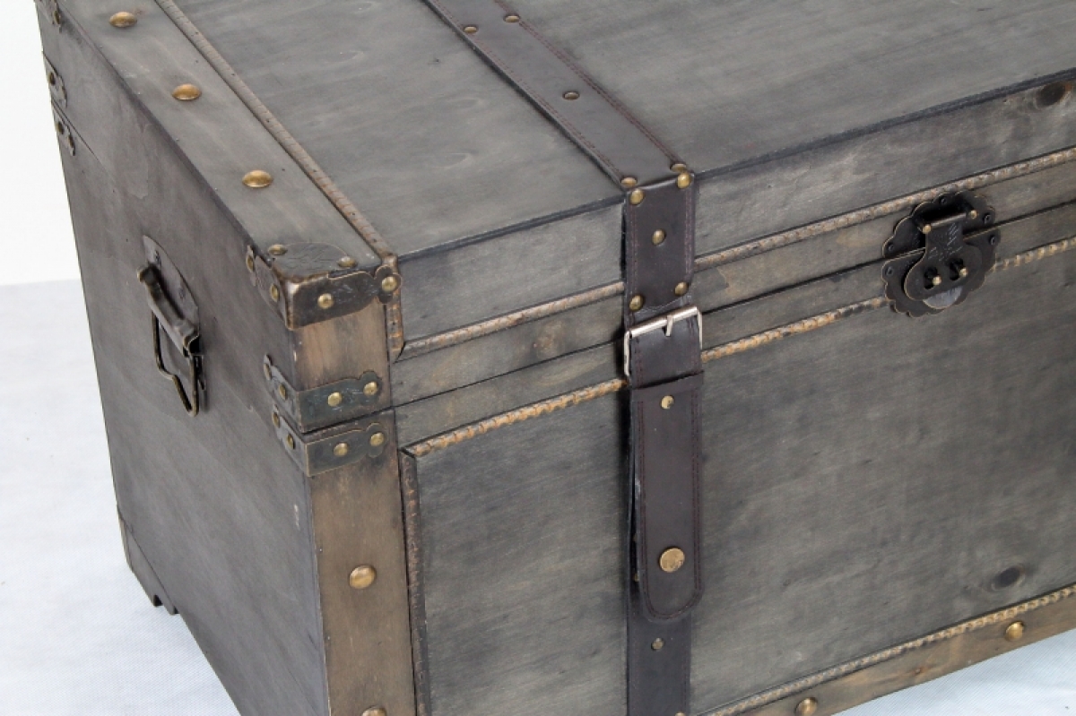 Dřevěná truhla 75x42x46cm poslouží jako úložný prostor na spoustu věcí a zároveň bude krásným doplňkem interiéru. Truhla má nýty ve zlaté barvě a kožené popruhy.