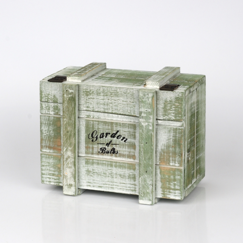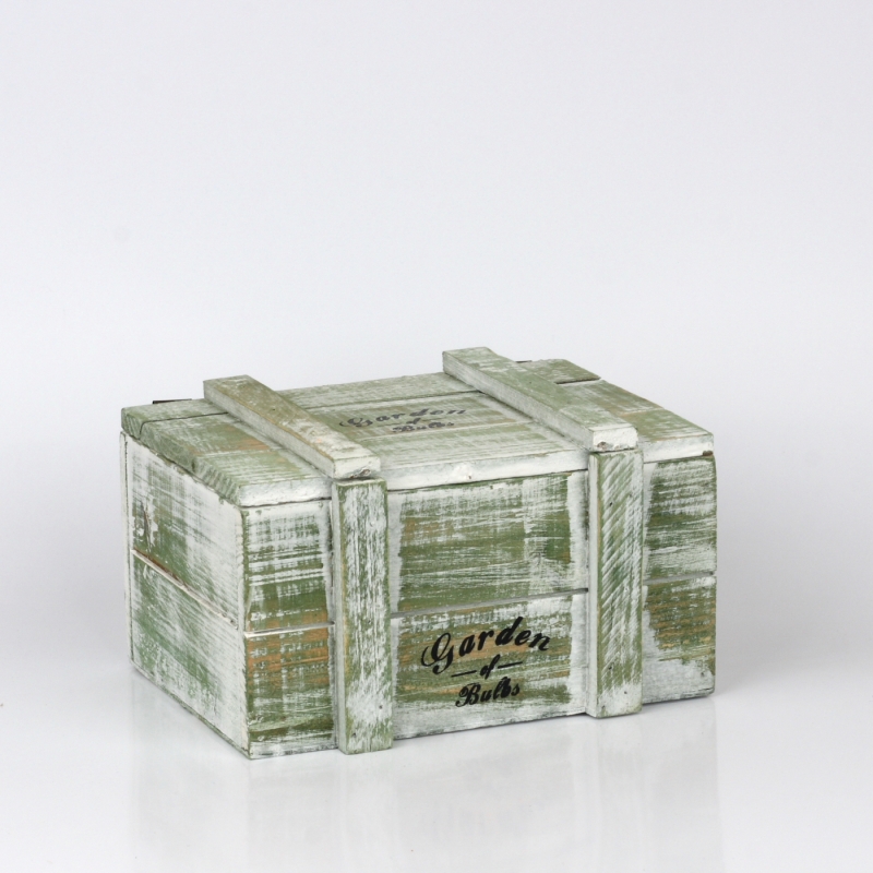 Dřevo má výranou patinu a zelený nádech připomínající proost jemného mechu. Víko i přední stranu zdobí černý nápis.