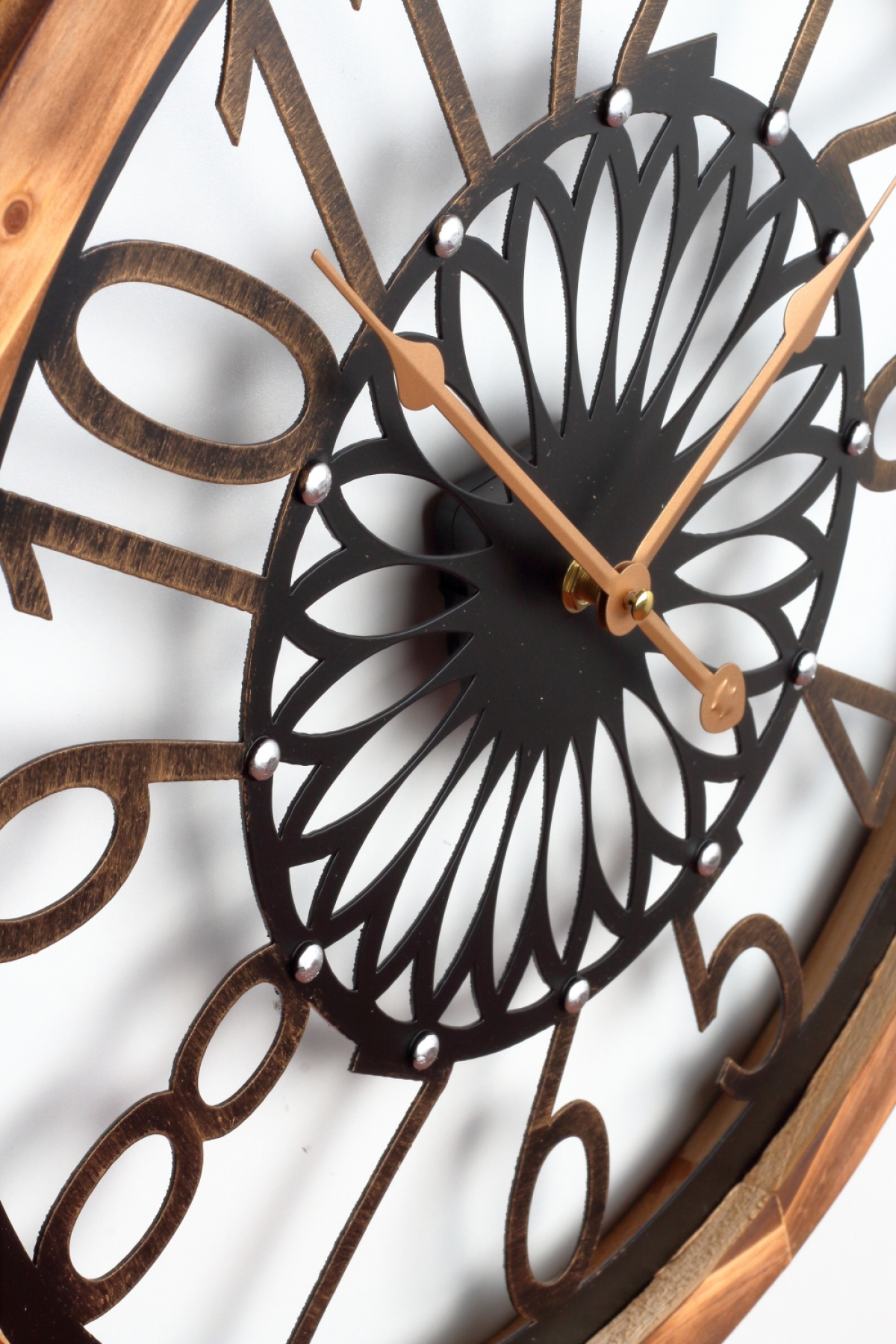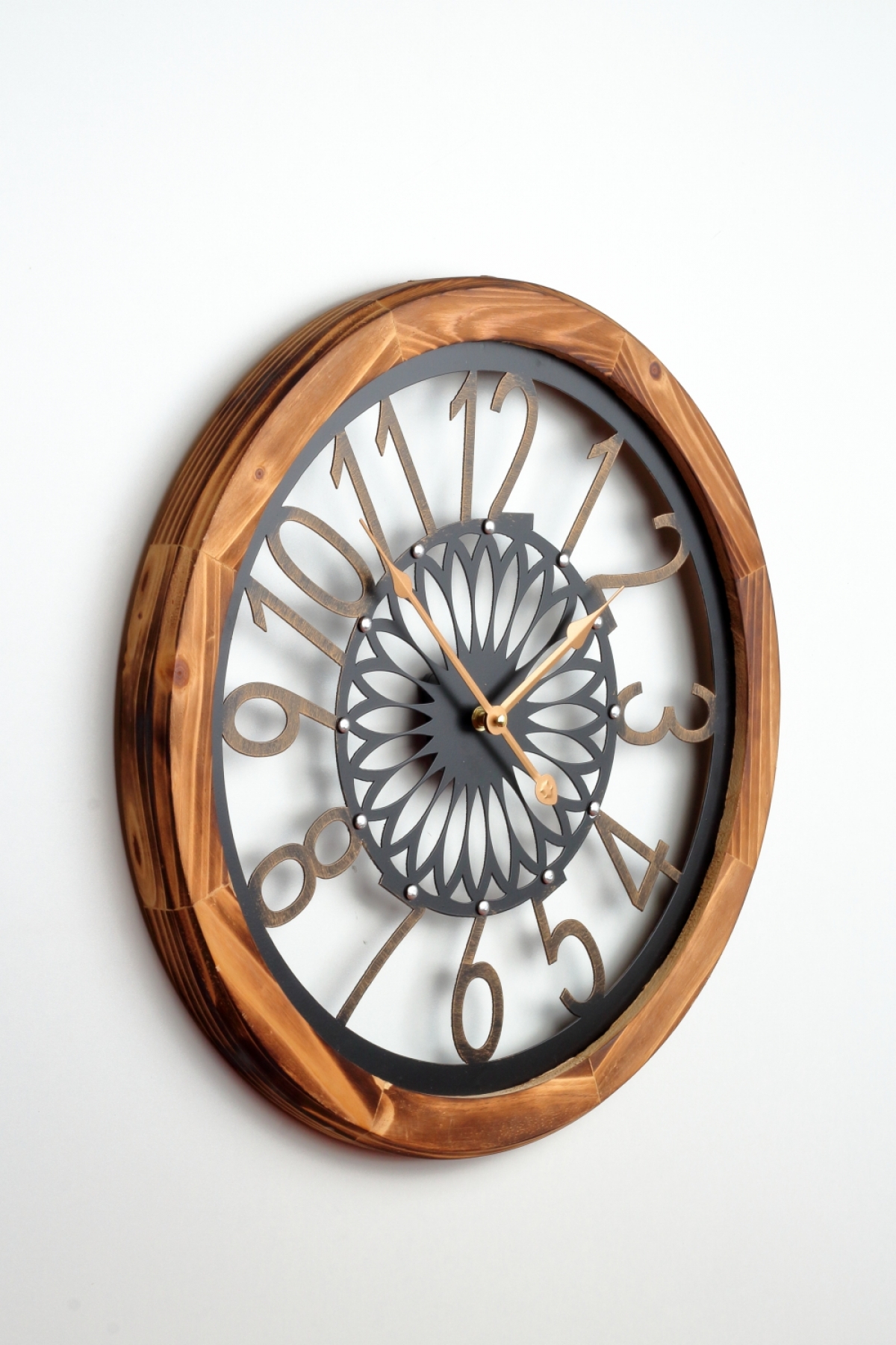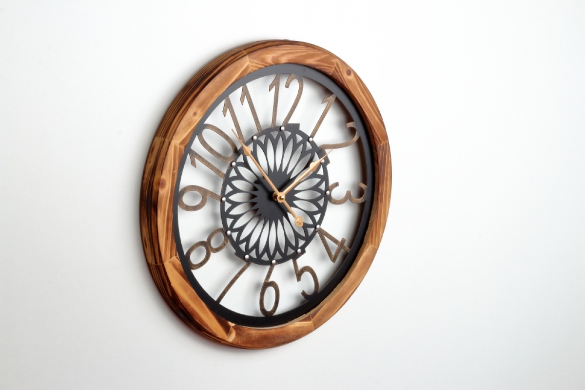 Dřevěné nástěnné hodiny 50cm s krásným opalovaným rámem a zdobeným ciferníkem.