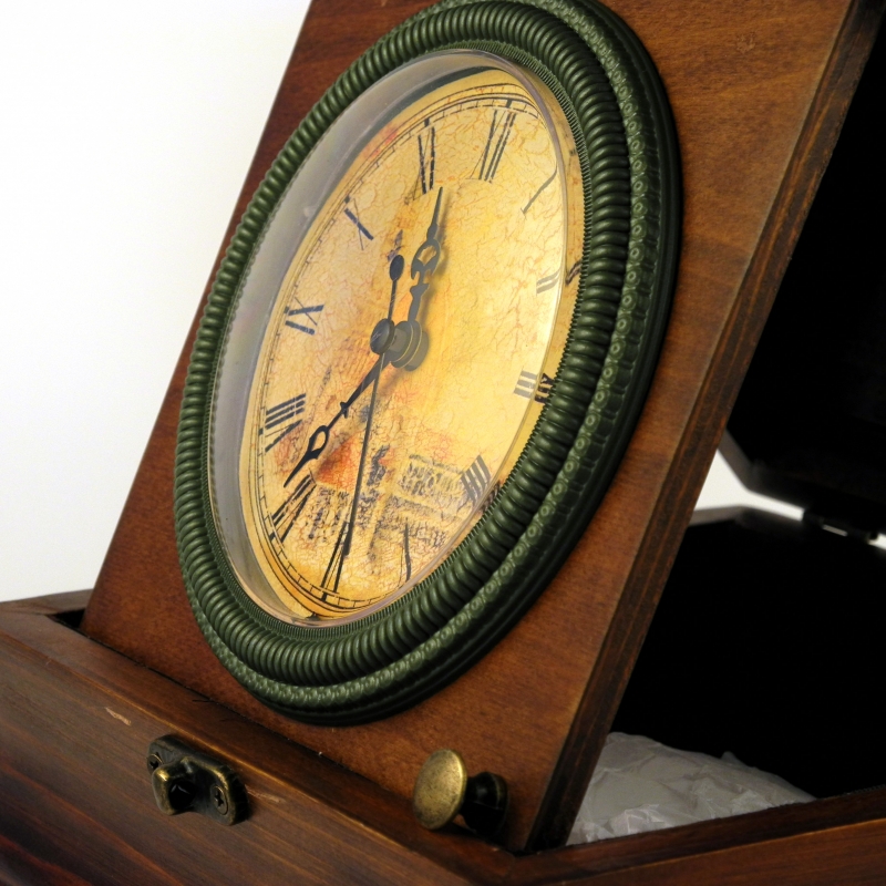 V zavřeném stavu je rozměr hodin 22x22x10cm. Při vyklopení ciferníku je výška 22cm.