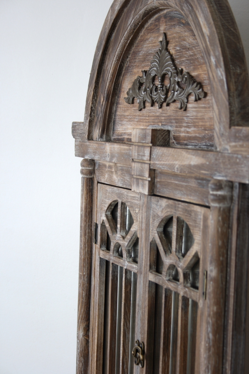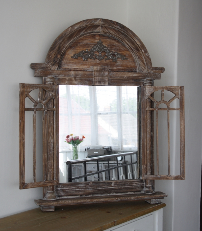 Pokud obdivujete starý a omšelý nábytek, tento kousek vám jistě padne do oka. Zrcadlo v netypickém rámu připomínajícím okno s okenicí zaujme na první pohled a ozdobí prázdnou stěnu.
