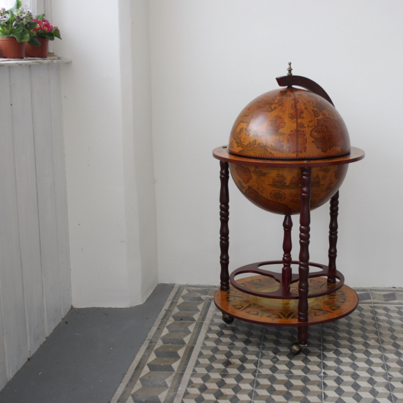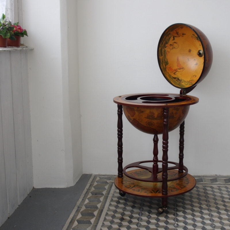 Bar ve tvaru globusu má odklápěcí horní polovinu, ve které se skrývá dostatek místa na Vaše oblíbené láhve i skleničky pro hosty. Globus je zdoben autentickými mapami a kresbami zvenku i uvnitř globusu. Díky šikovným kolečkům je bar pojízdný, a tak si jej můžete přisunout k pohovce a mít tak vše pěkně po ruce. Jak odkládací plocha na lahve slouží i spodní část baru.