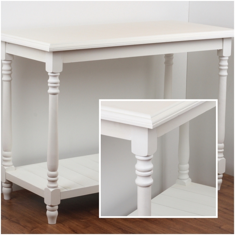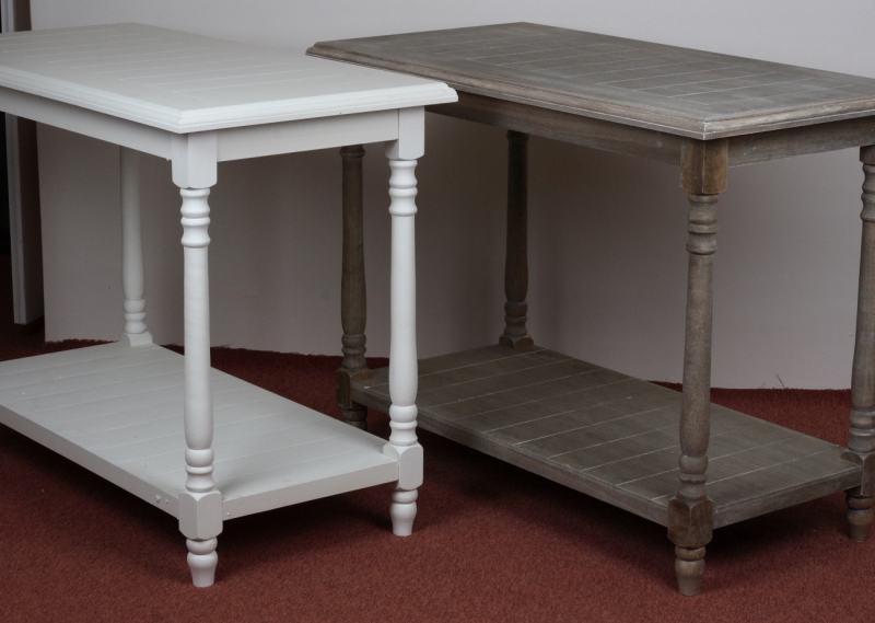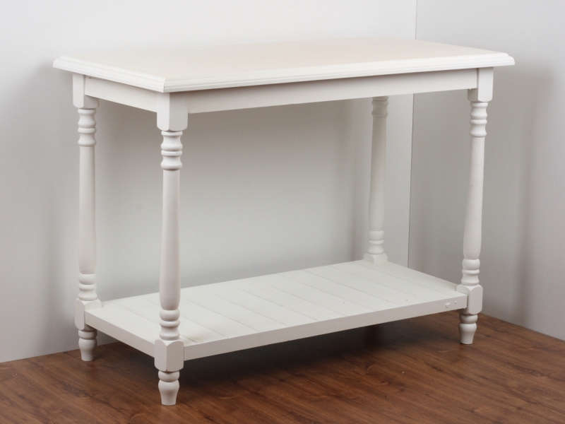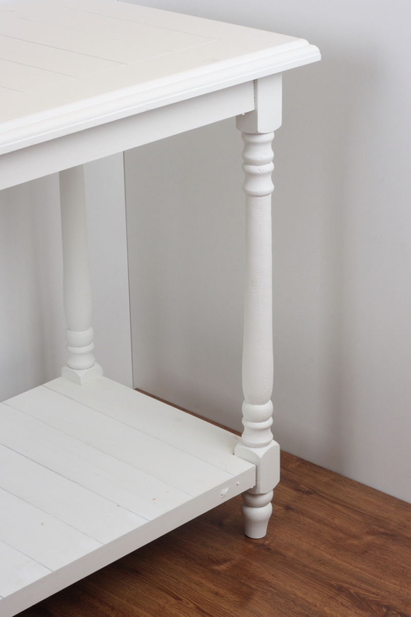 Stolek může sloužit jako otevřená komoda u stěny nebo v prostoru třeba jako kuchyňský ostrůvek. Spodní i horní deska má laťkový vzhled, nohy jsou soustružené. Bílá barva působí velmi elegantně a je neutrální volbou ke stávajícímu nábytku.