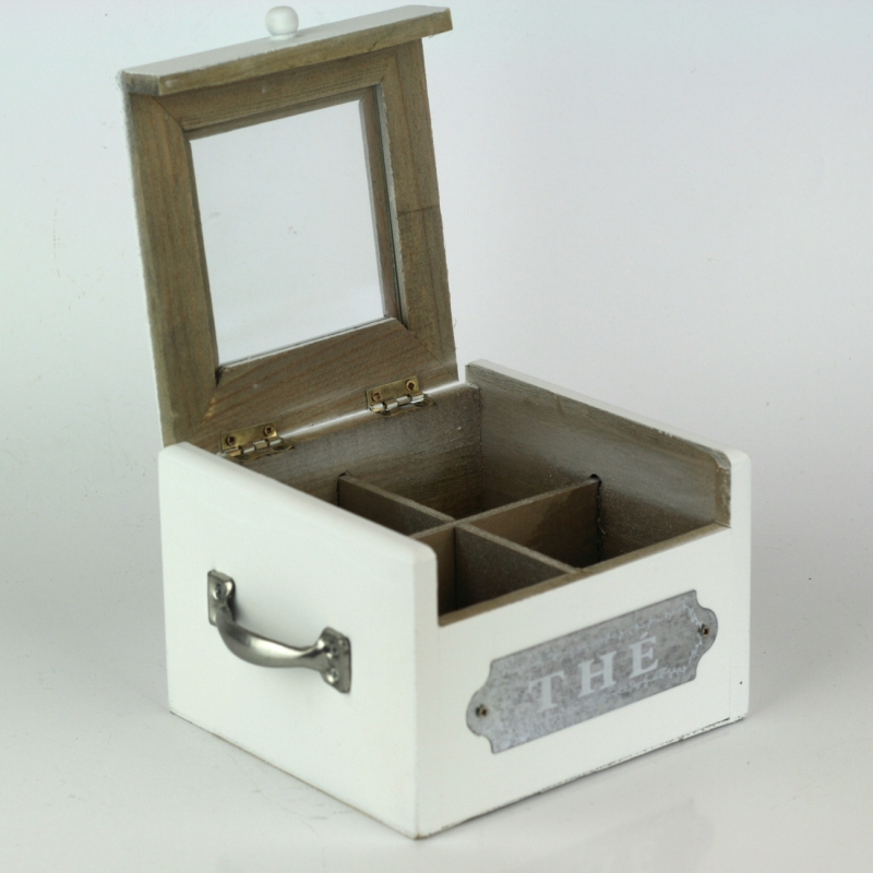 Dřevěný box na čaj 15,5x14x10cm má uvnitř čtyři přihrádky. Budete tak mí skvělý přehled o tom, pro kterou příchuť sáhnout.