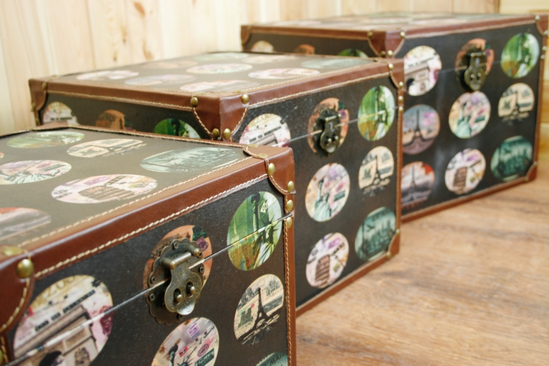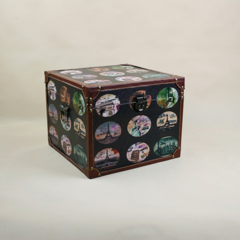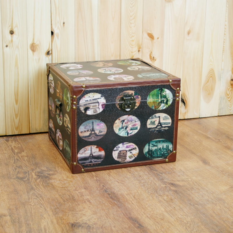 Dřevěný kufr s potiskem světových měst, hrany má lemované koženkou.