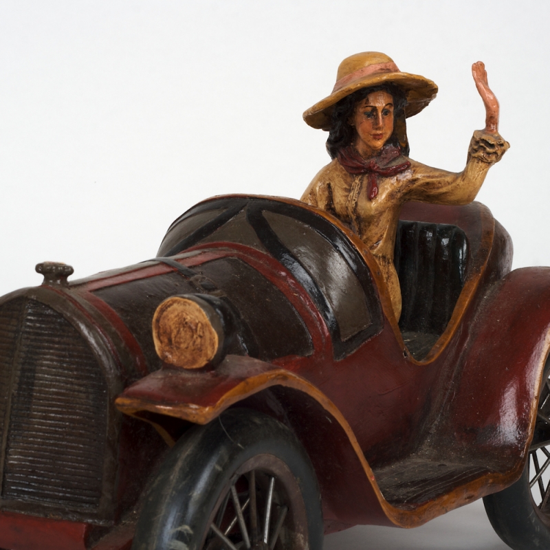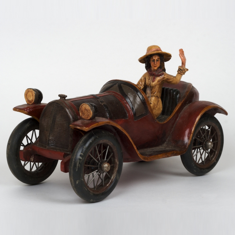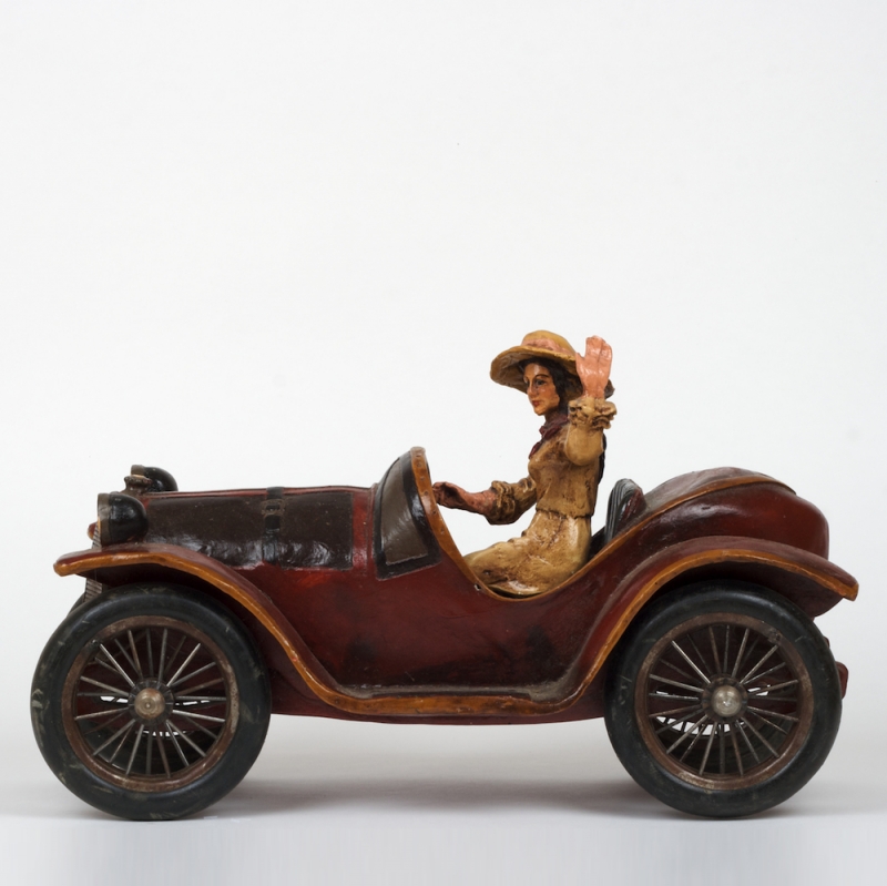 Jedná se o starožitnost - Dřevěný model auta od sběratele, se smyslnou cestovatelkou, ručně vyřezávaný ze dřeva a malovaný. Velikost 53 x 26 cm, výška 30 cm, hmotnost 7.5 kg.
