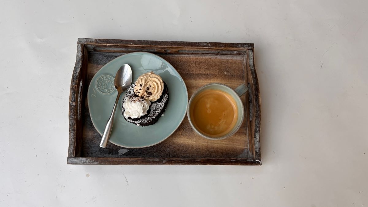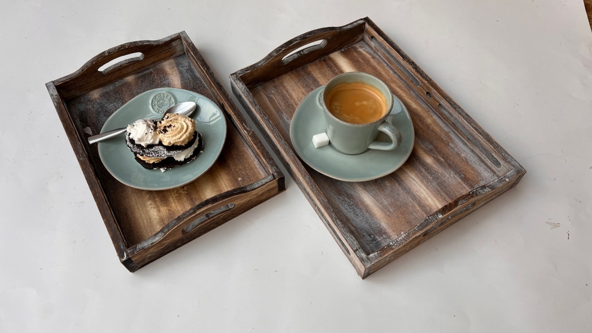 Dřevěný podnos obdélníkový může sloužit i jako stylová dekorace. Menší tác je vložený v prostoru velkého.