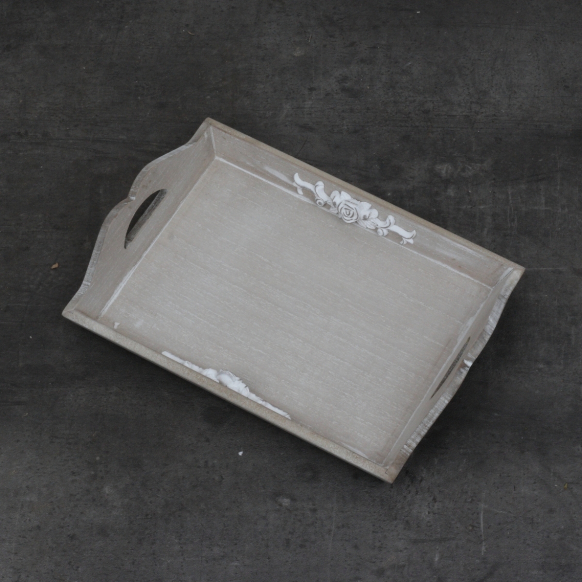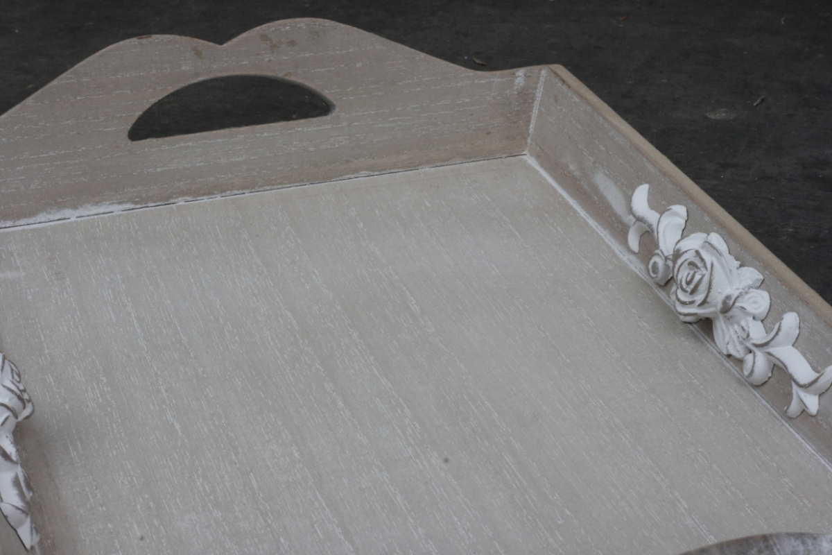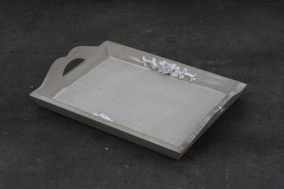 Dřevo s patinou po bocích zdobí motiv květin, které dodávají podnosu nádech elegance.
