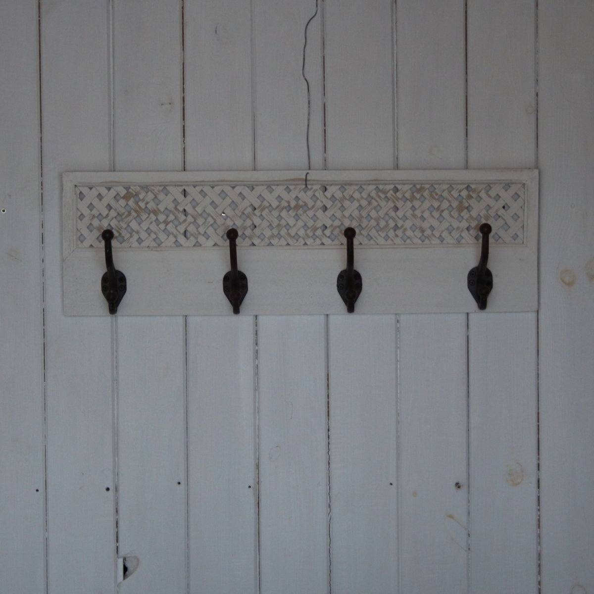 Stylový dřevěný věšák se čtyřmi kovovýmu háčky. Nepatrné poškození vyobrazeno na fotografiích č. 6. a 7.