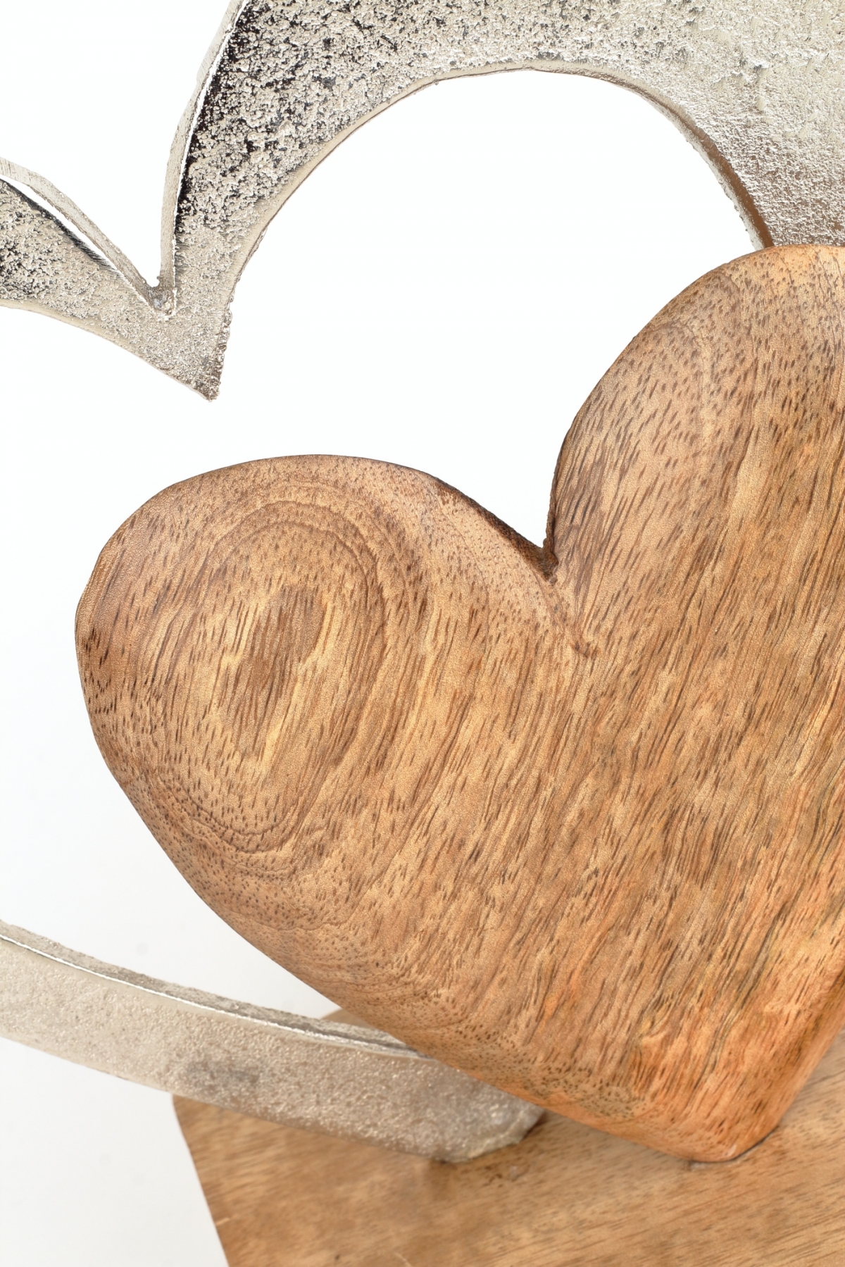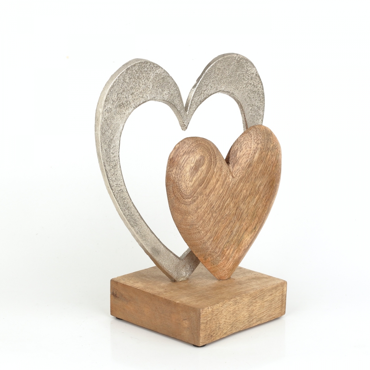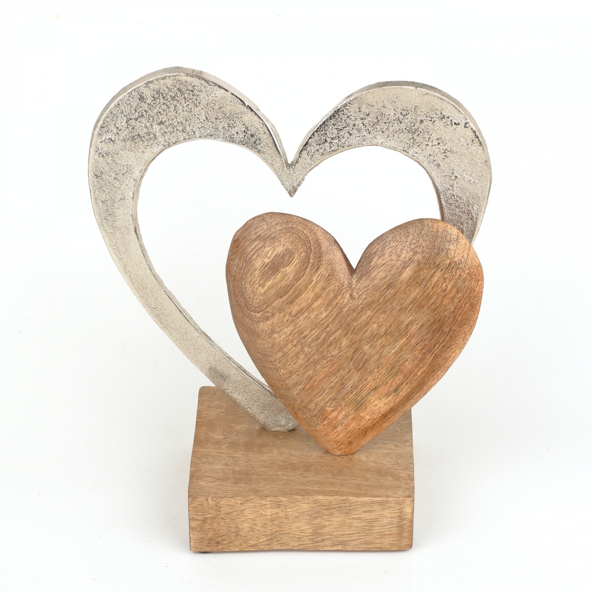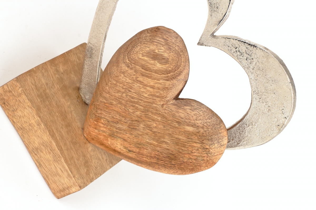 Dvě srdce v kombinaci hliník/dřevo na dřevěném podstavci budou krásnou a romantickou ozdobou na poličce, komodě nebo jako doplněk svatebního aranžmá.