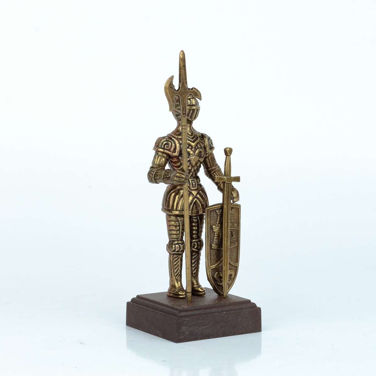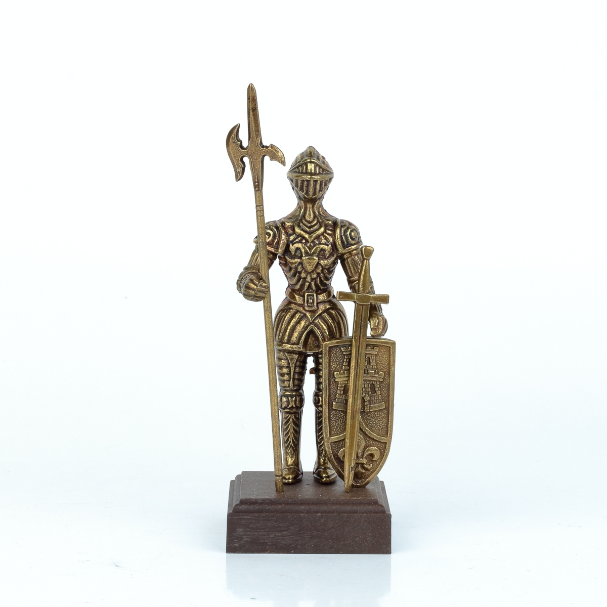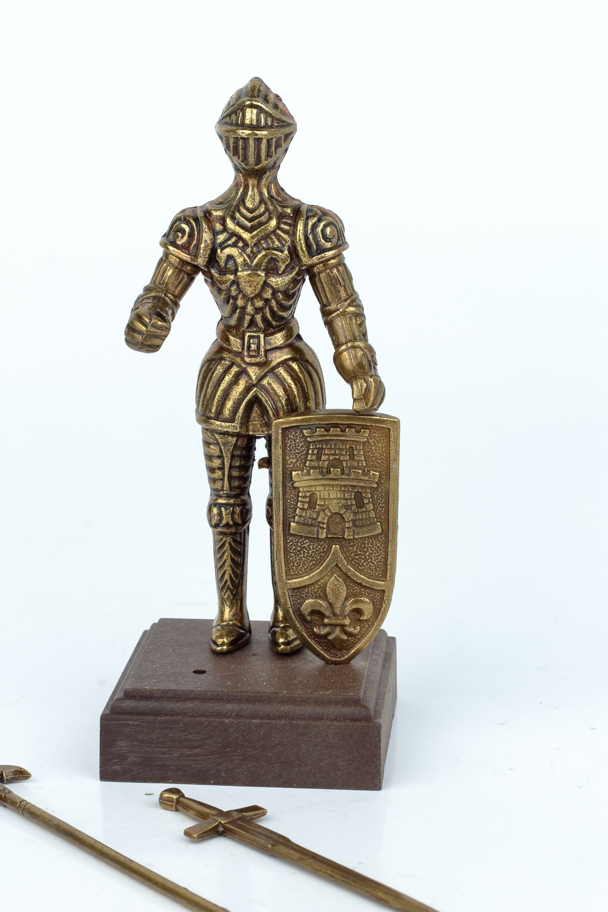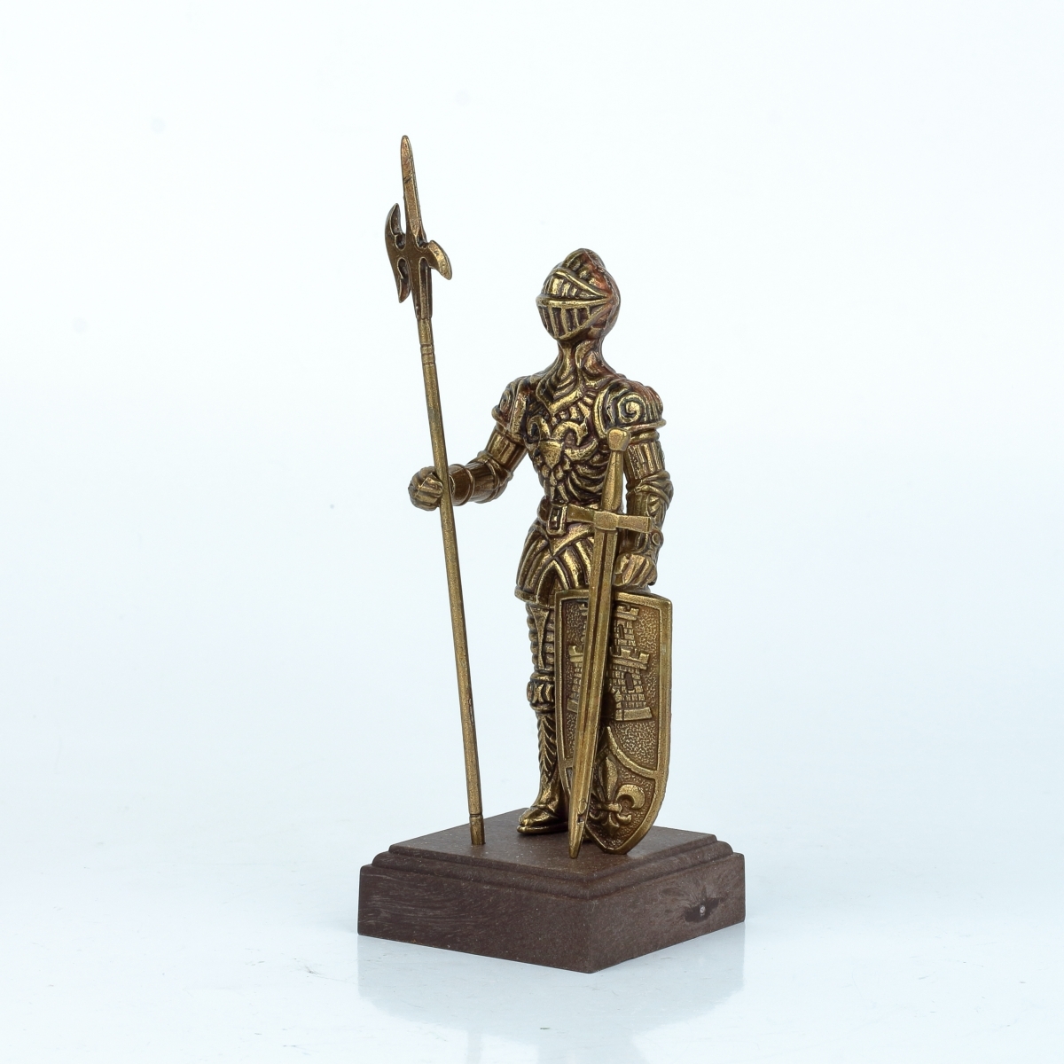 Tato figurka rytíře v brnění je z kovu bronzové barvy a stojí na dřevěném podstavci. Rytíř má bohatě zdobené brnění a v rukou svírá halapartnu, nebo velký meč, a štít s vyobrazením věže a symbolu lilie.