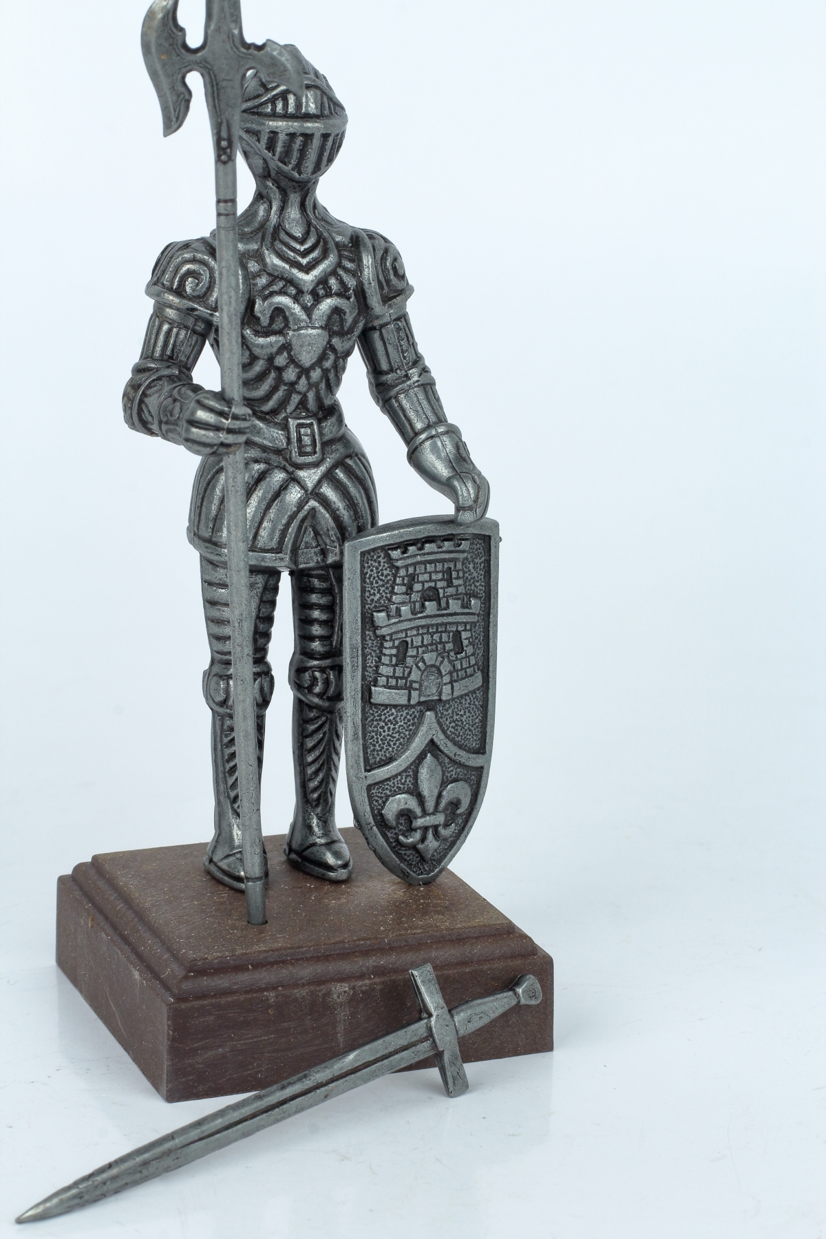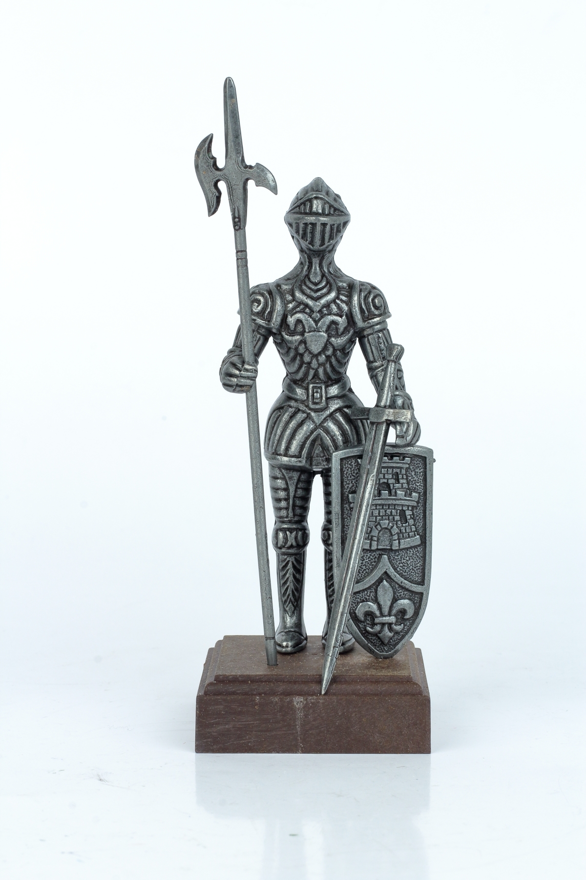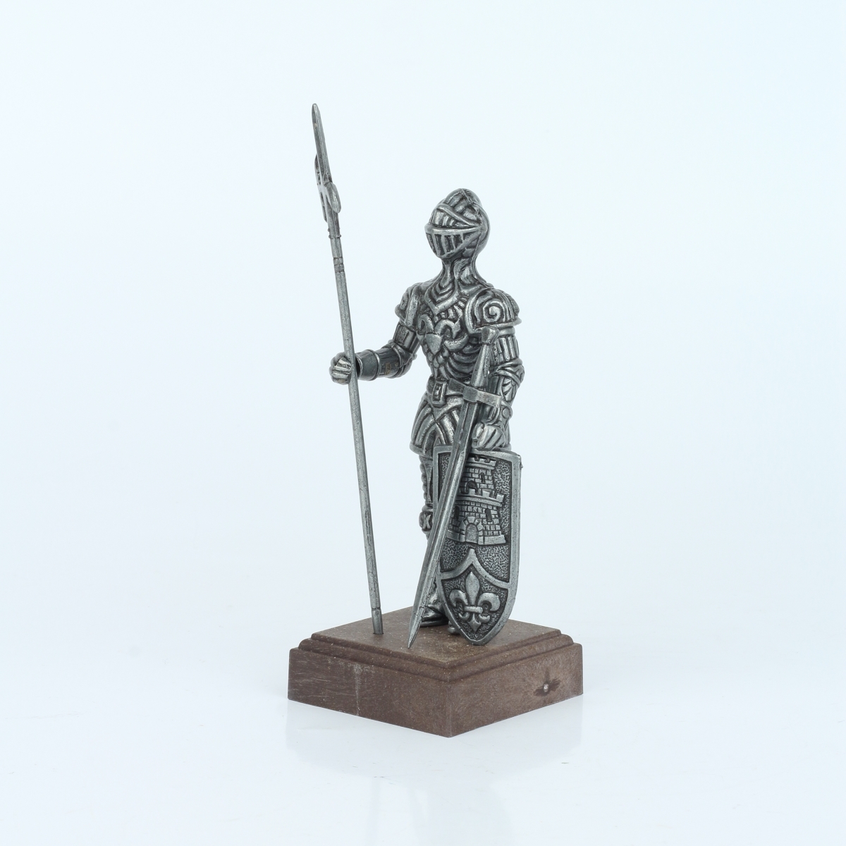 Na ozdobu i do sbírky je vhodná tato figurka rytíře v brnění. Vyrobena je z kovu stříbrné barvy s dřevěným podstavcem. Rytíř má bohatě zdobené brnění a v jedné ruce může svírat halapartnu, nebo velký meč. Druhou rukou přidržuje štít, který má opřený o podstavec, s vyobrazeným erbem, na kterém je věž a symbol lilie.