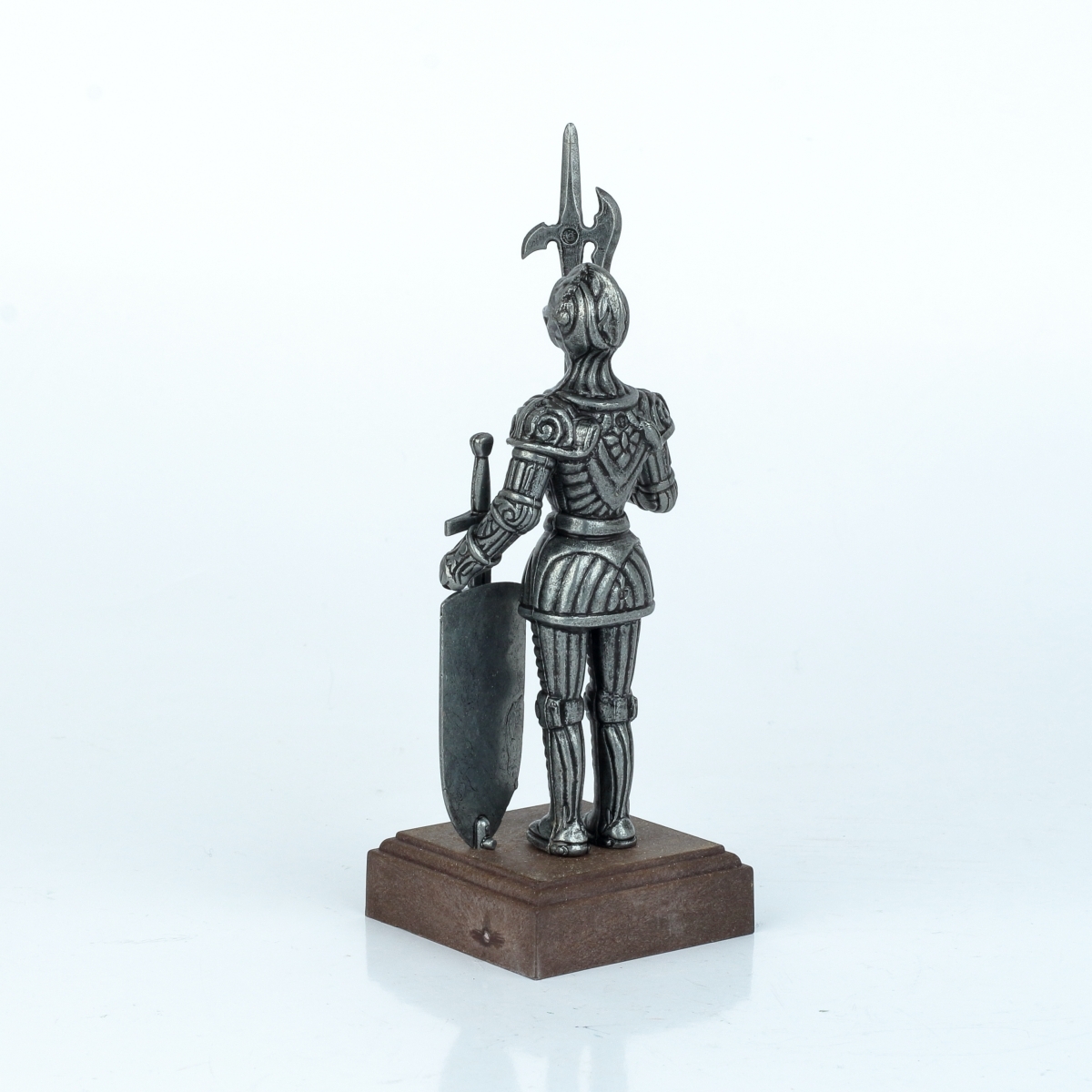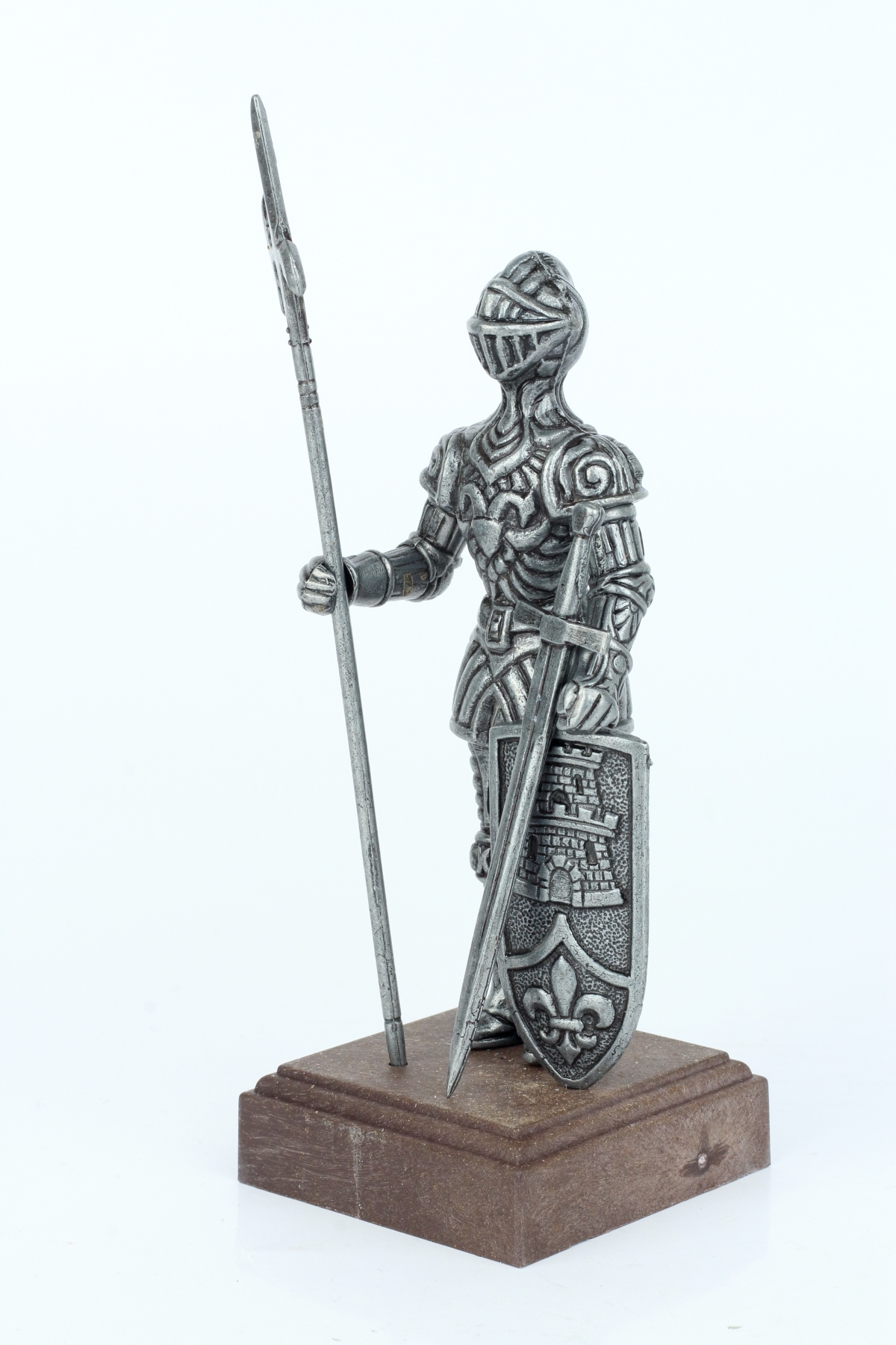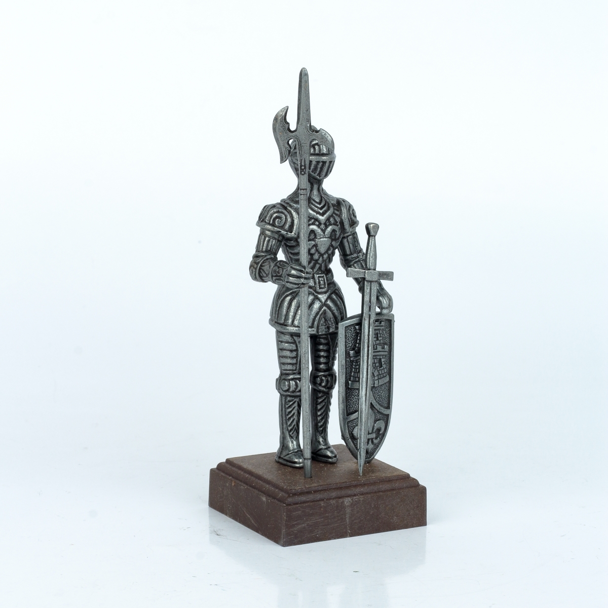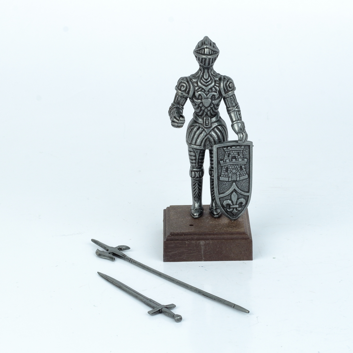 Na ozdobu i do sbírky je vhodná tato figurka rytíře v brnění. Vyrobena je z kovu stříbrné barvy s dřevěným podstavcem. Rytíř má bohatě zdobené brnění a v jedné ruce může svírat halapartnu, nebo velký meč. Druhou rukou přidržuje štít, který má opřený o podstavec, s vyobrazeným erbem, na kterém je věž a symbol lilie.