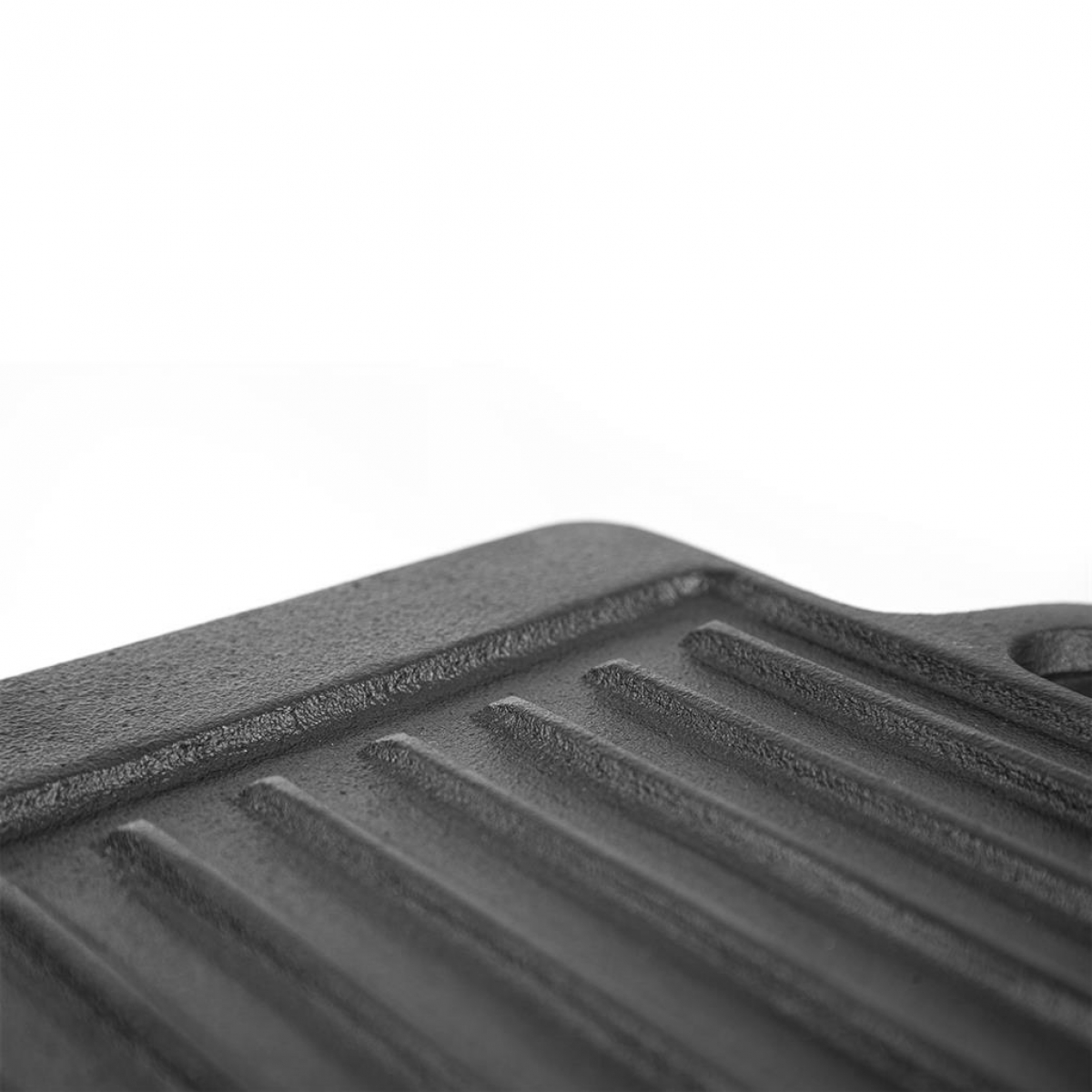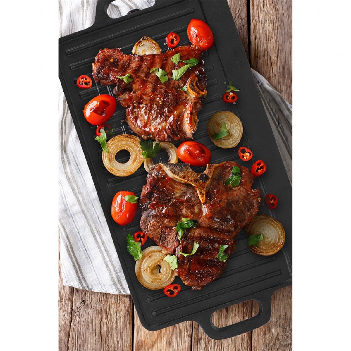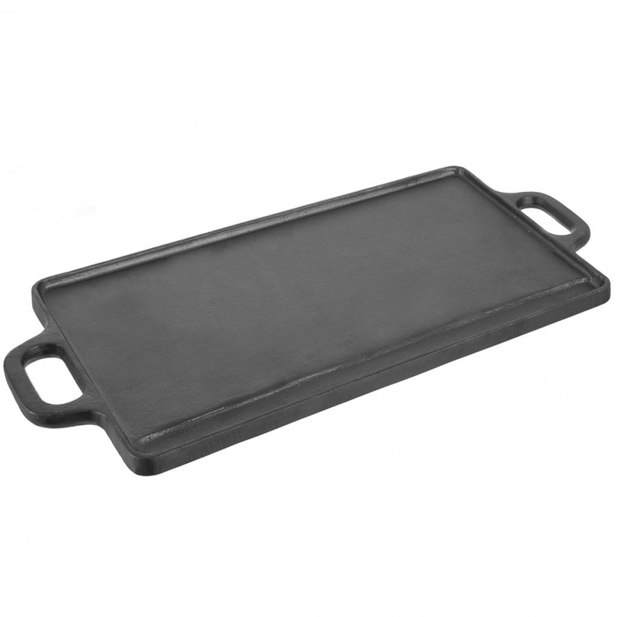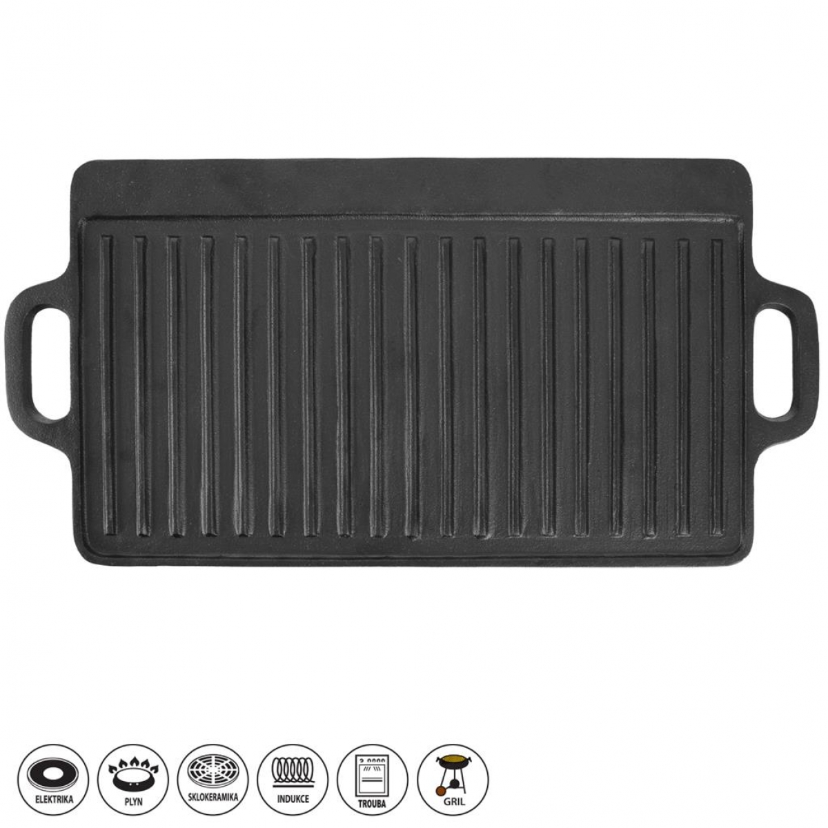 Grilovací plát z litiny Vám pomůže při přípravě všech grilovaných pochoutek... Je z jedné strany hladký, z druhé strany má vroubkovaný povrch. Materiál: litina. Doporučujeme používání kuchyňské chňapky. Můžete připravovat pokrmy v troubě, na sporáku i na přímém ohni. Vhodná na indukci. Litina je specifická na údržbu, před a po použití je NUTNÉ povrch pánve ošetřit jedlým olejem, tak se zamezí vzniku rzi, což nemůže být předmětem reklamace. Nenechávejte ve vlhku! Nepoužívejte organické kyseliny typu octa. Rozměry: 37,5/45,5x23x1,5 cm.