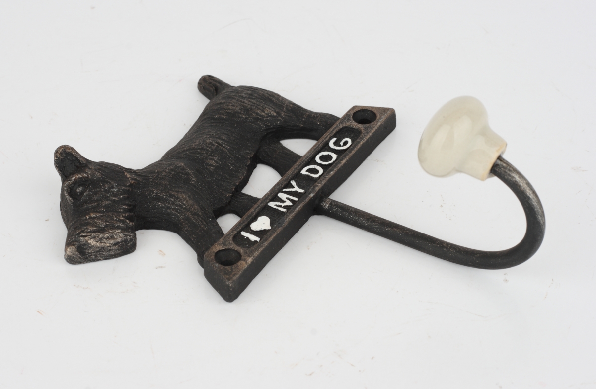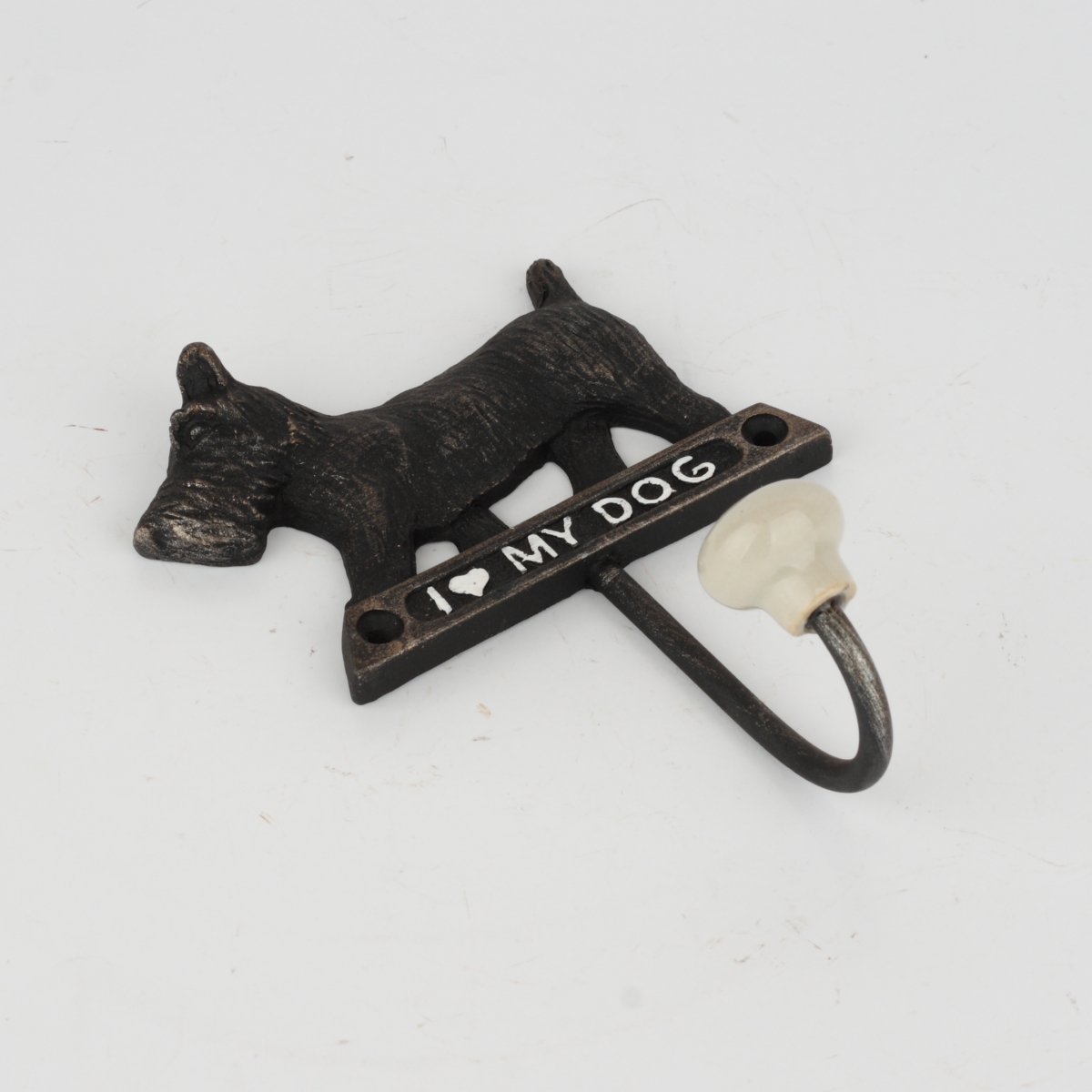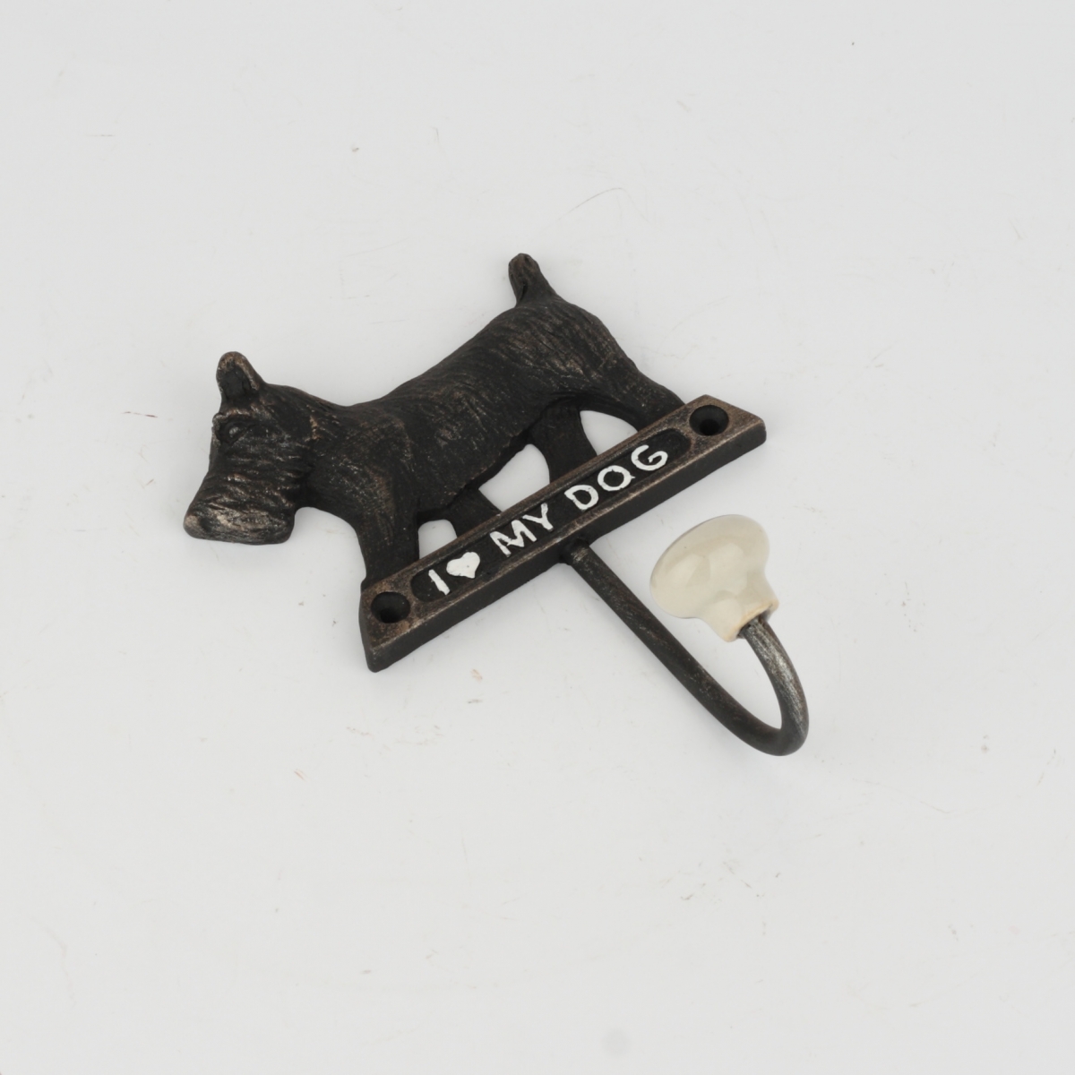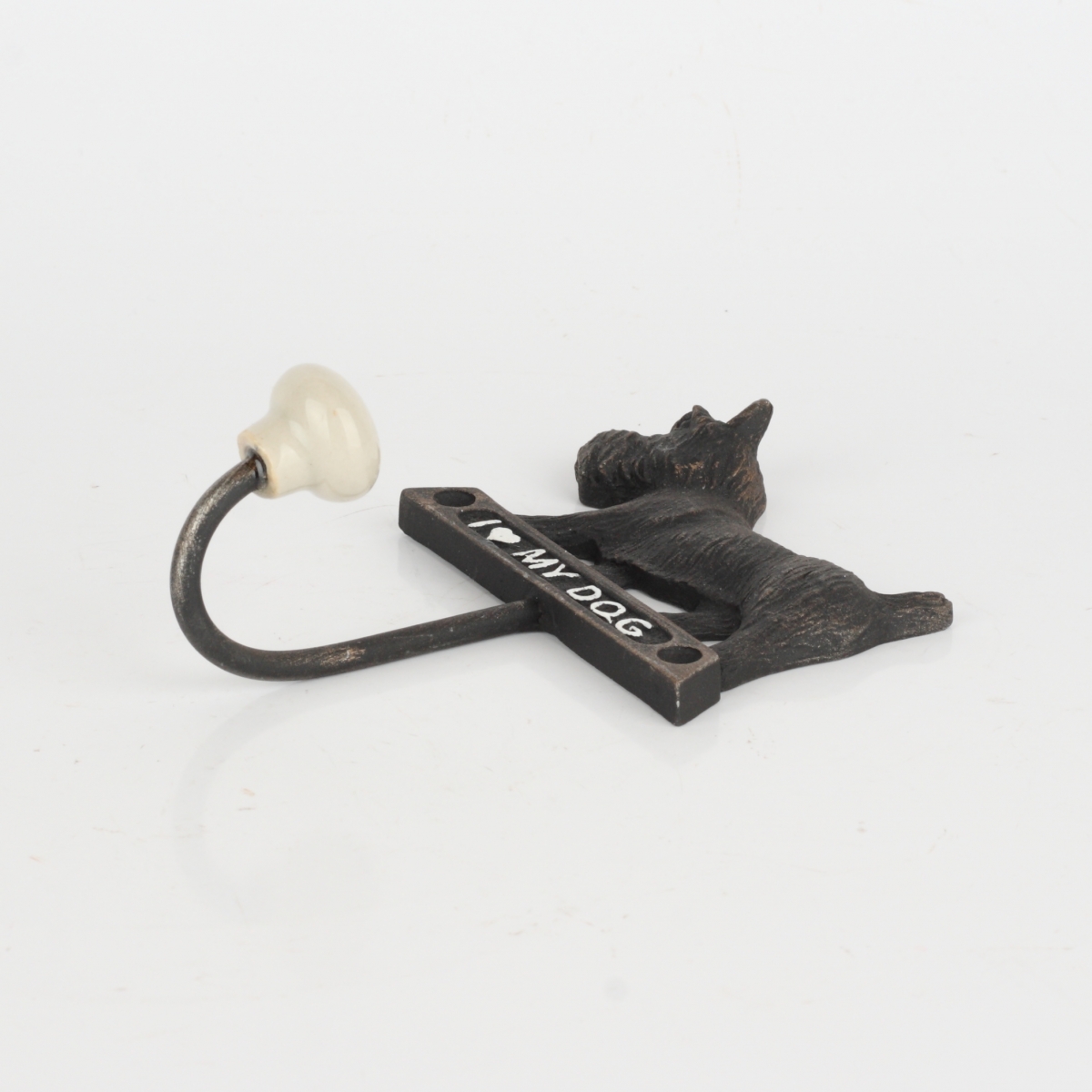 Háček s motivem psa a nápisem I love ma dog má velký kovový háček s keramickou úchytkou.