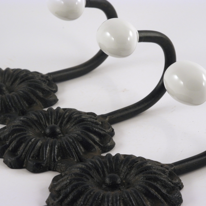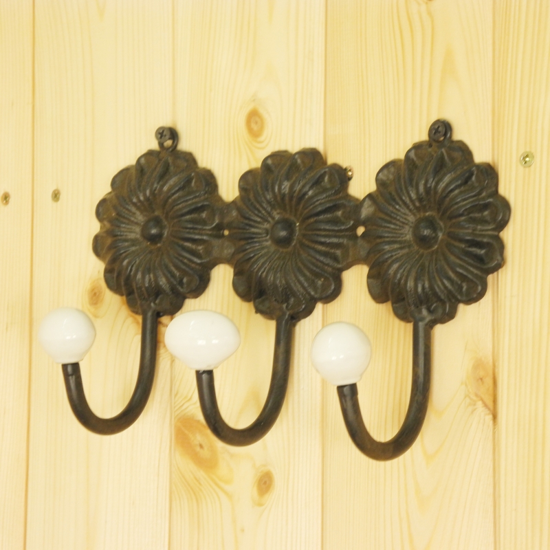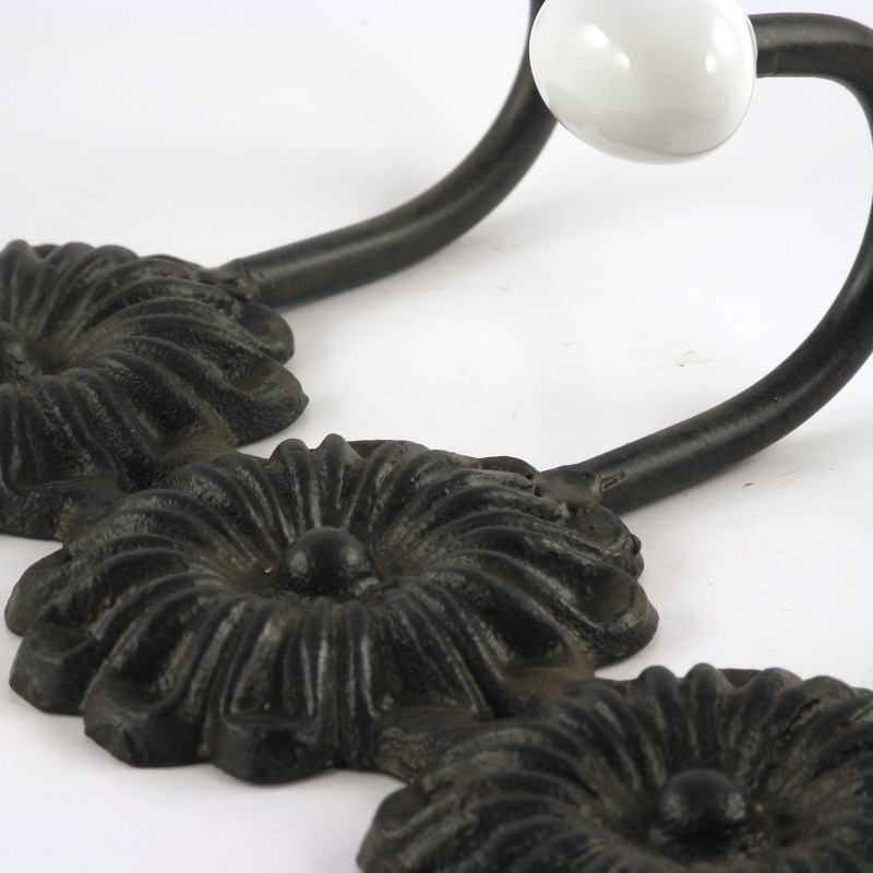 Háčky do kuchyně na pověšení všeho možného i nemožného dodáváme s rozměrem 24 x 8 x 16 cm. Na výrobu tříháčku byla použita kvalitní a odolná litina. Konce jednotlivých háčků jsou porcelánové úchytky, takže nedojde k poškození zavěšených předmětů. Jednotlivé háčky jsou ozdobeny litinovými květinkami. Zavěsíte jej pomocí dvou šroubků.